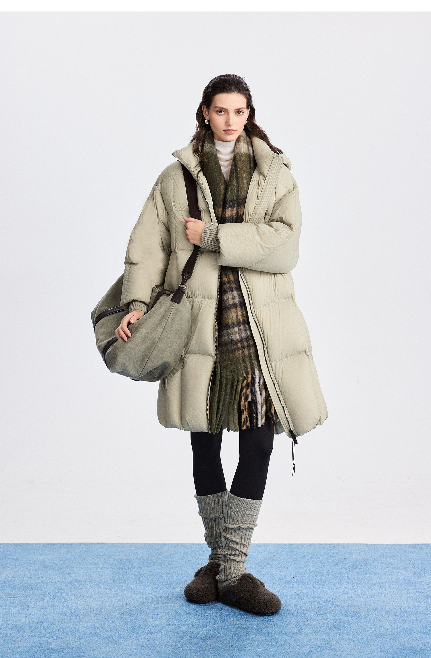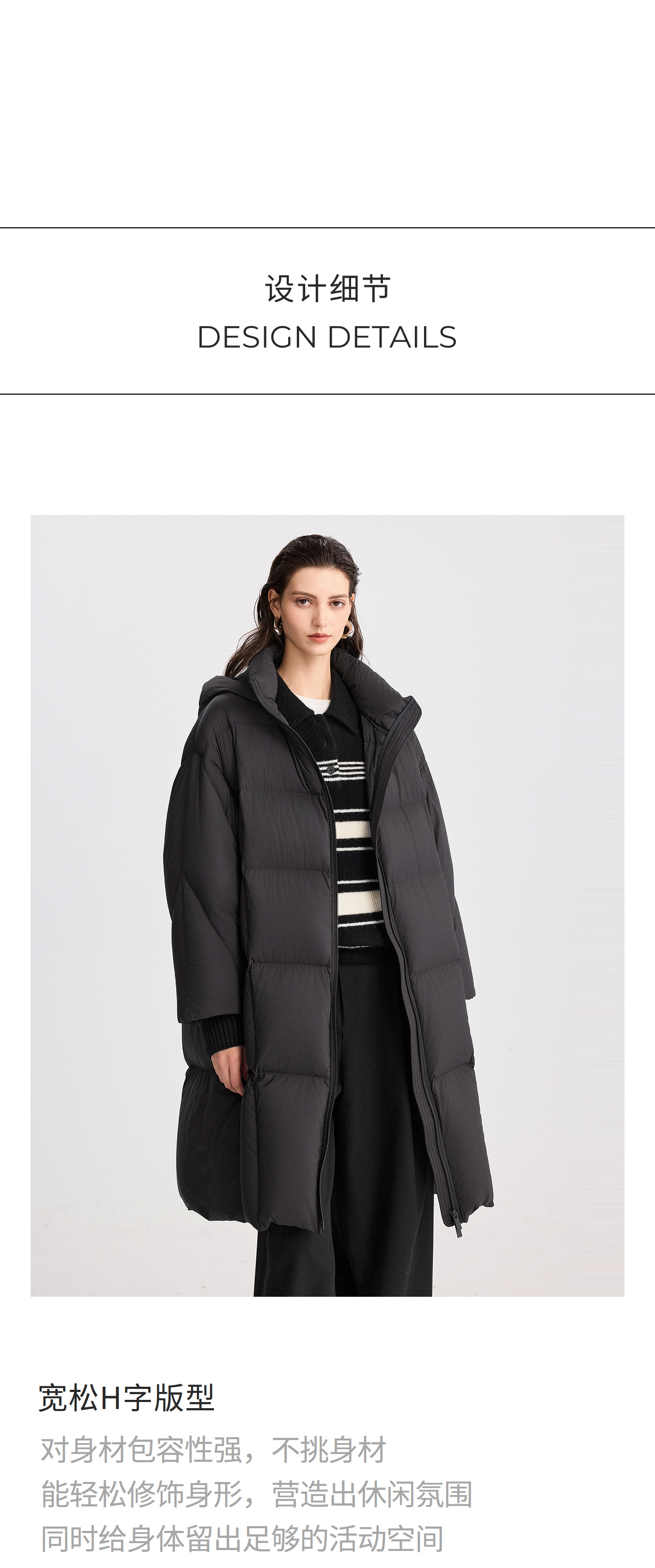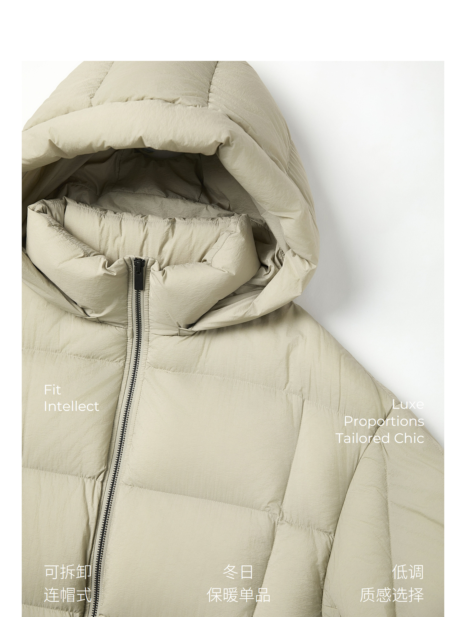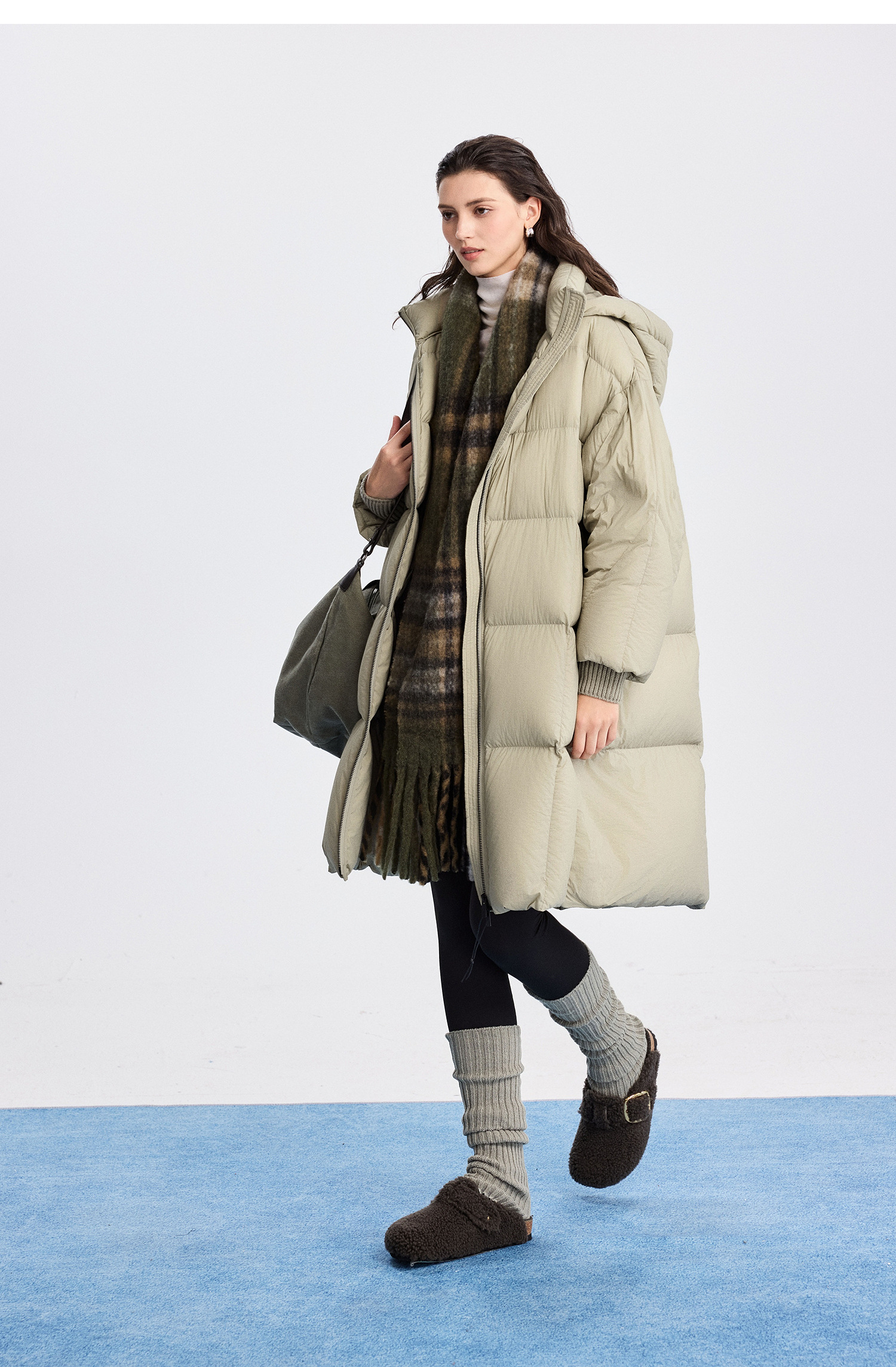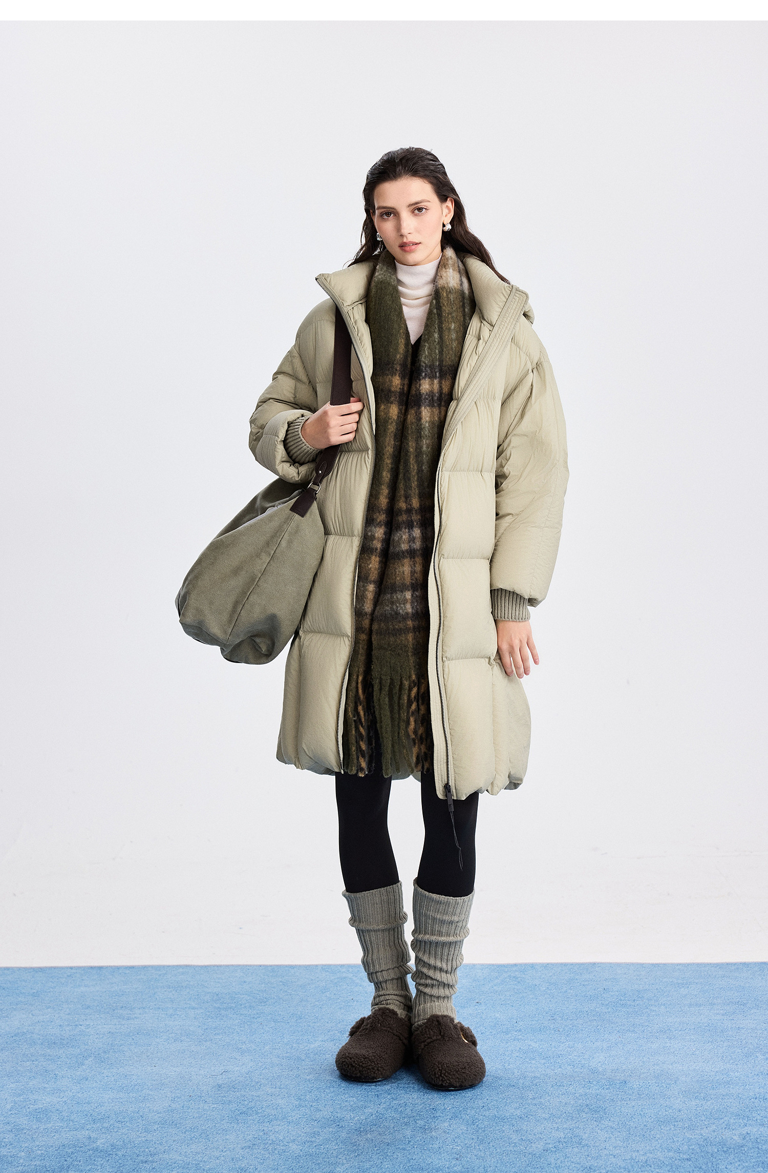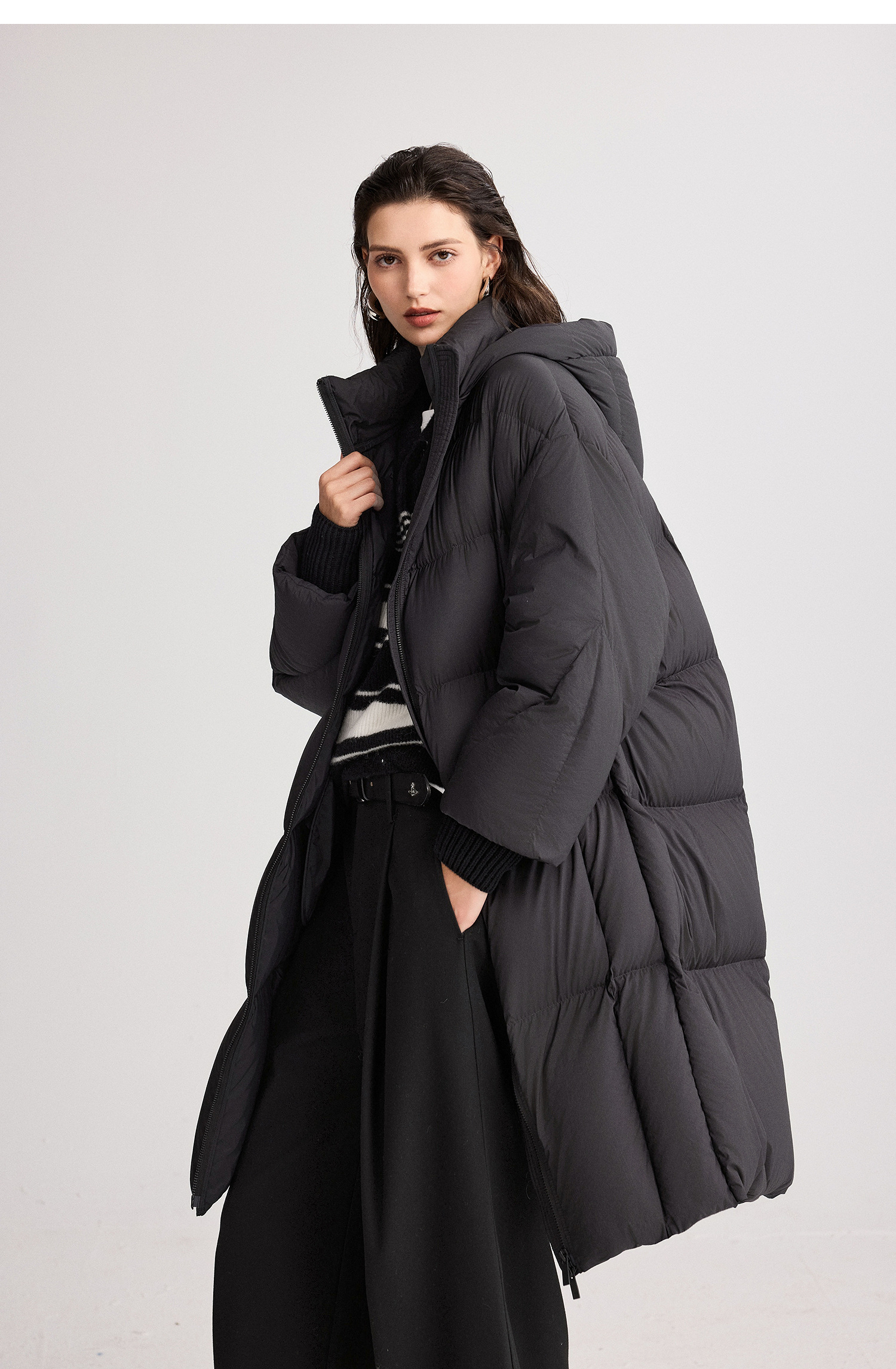 棉仓366615021-【90白鹅绒】褶皱肌理感连帽羽绒服女25秋冬中长款过膝外套