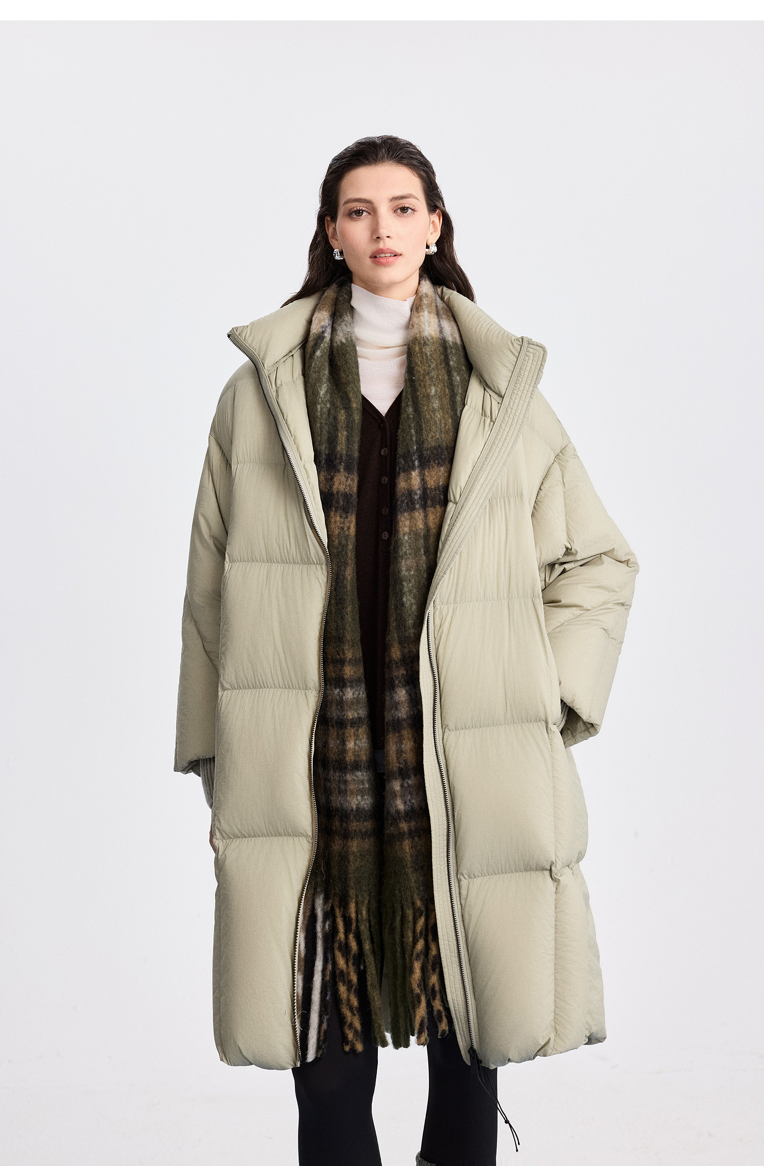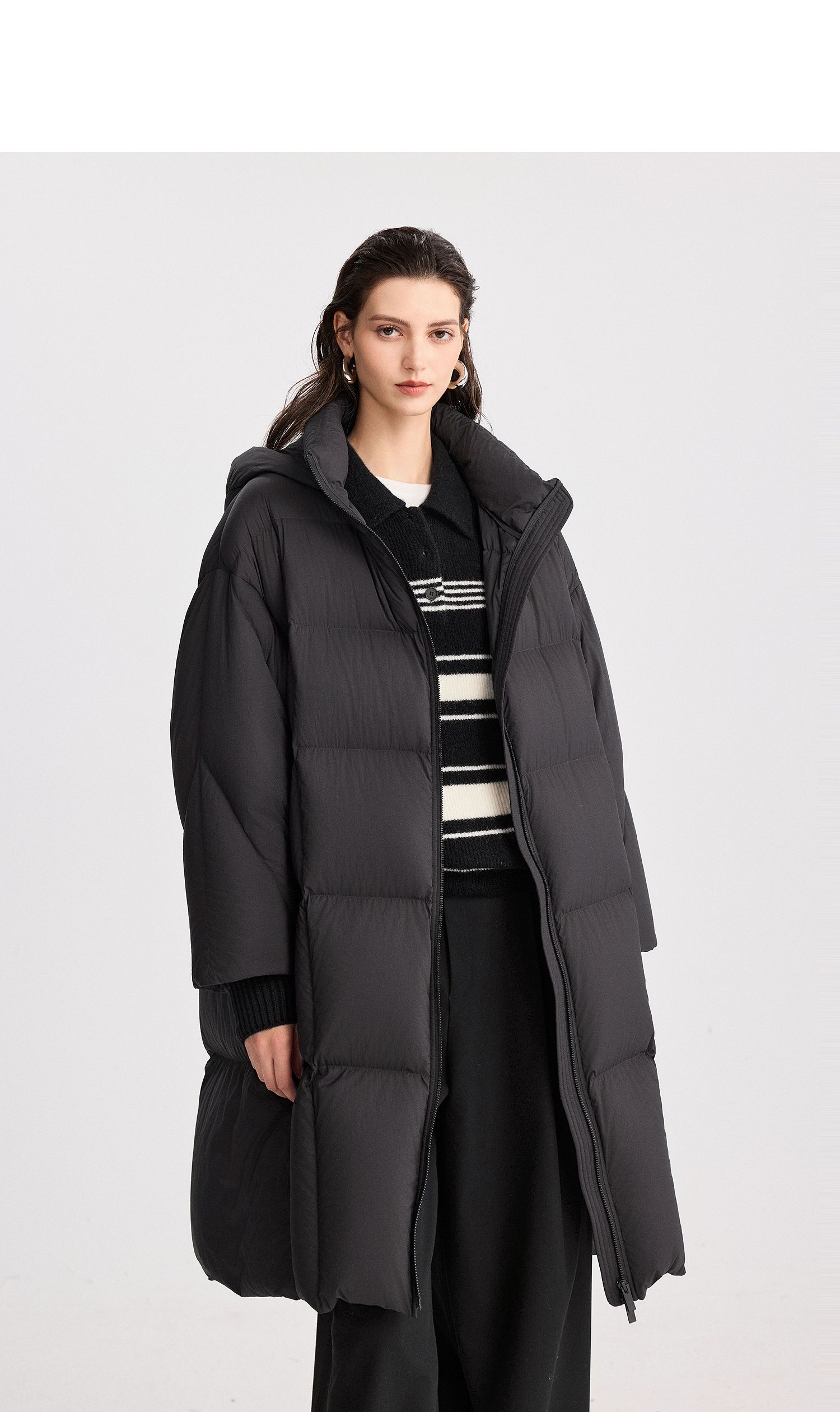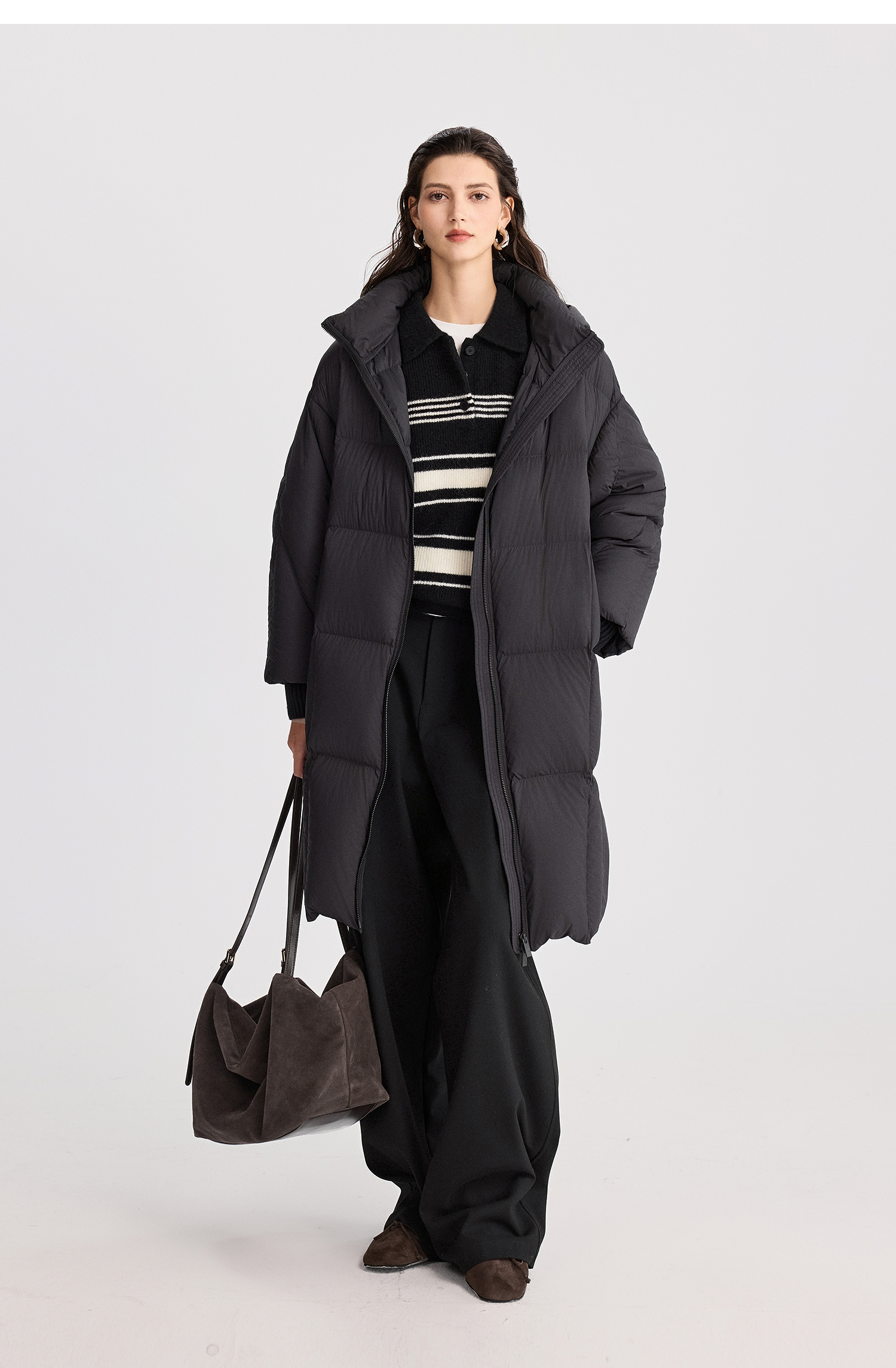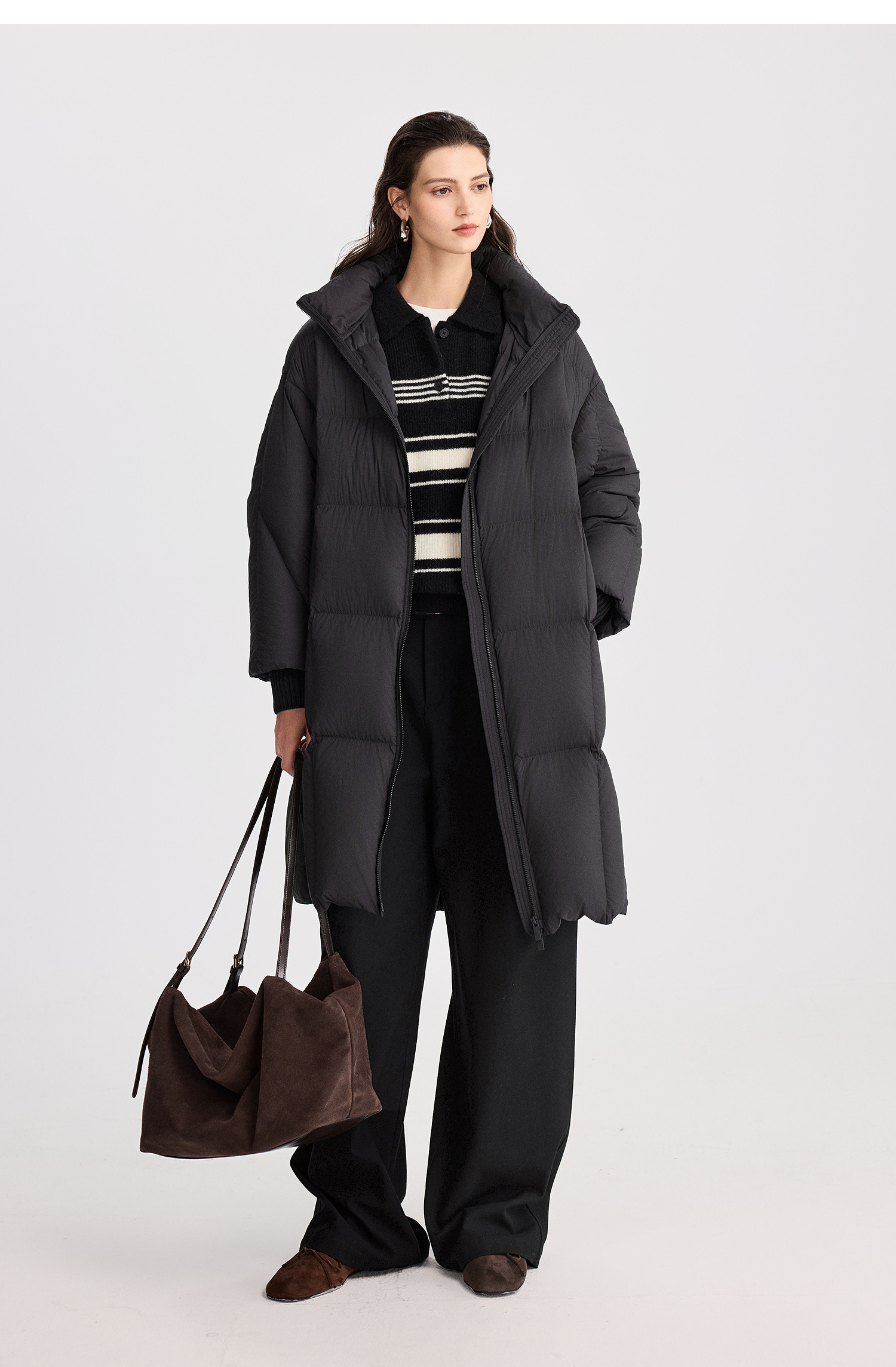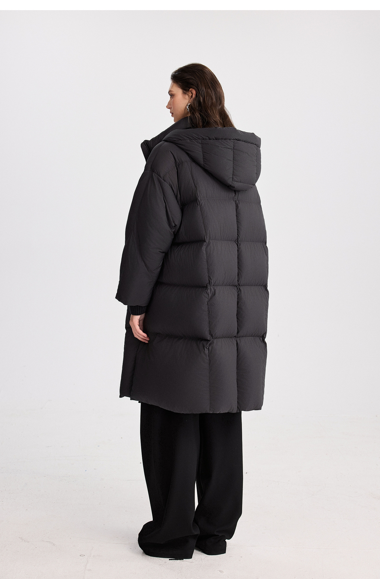 棉仓366615021-【90白鹅绒】褶皱肌理感连帽羽绒服女25秋冬中长款过膝外套