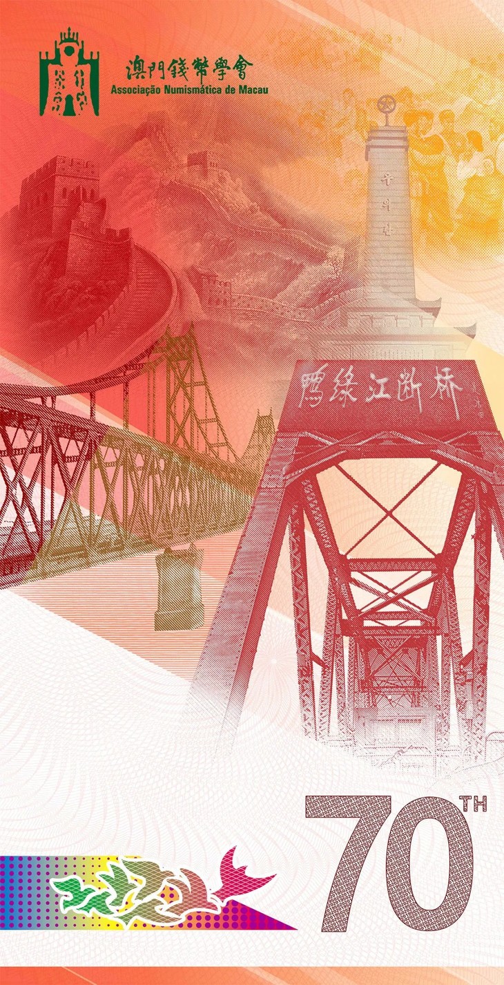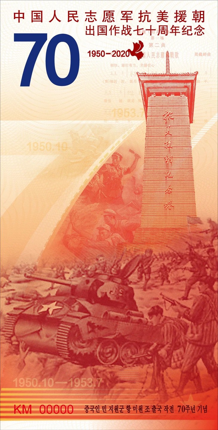 纪念券正面是抗美援朝纪念塔,位于辽宁省丹东;下方是抗美援朝战争场面,有战场利器坦克、冲锋陷阵的志愿军战士们,仿佛又带我们回到那个战火纷飞、刻骨铭心的时代。