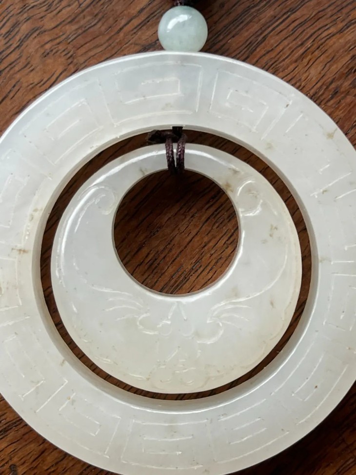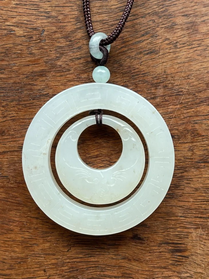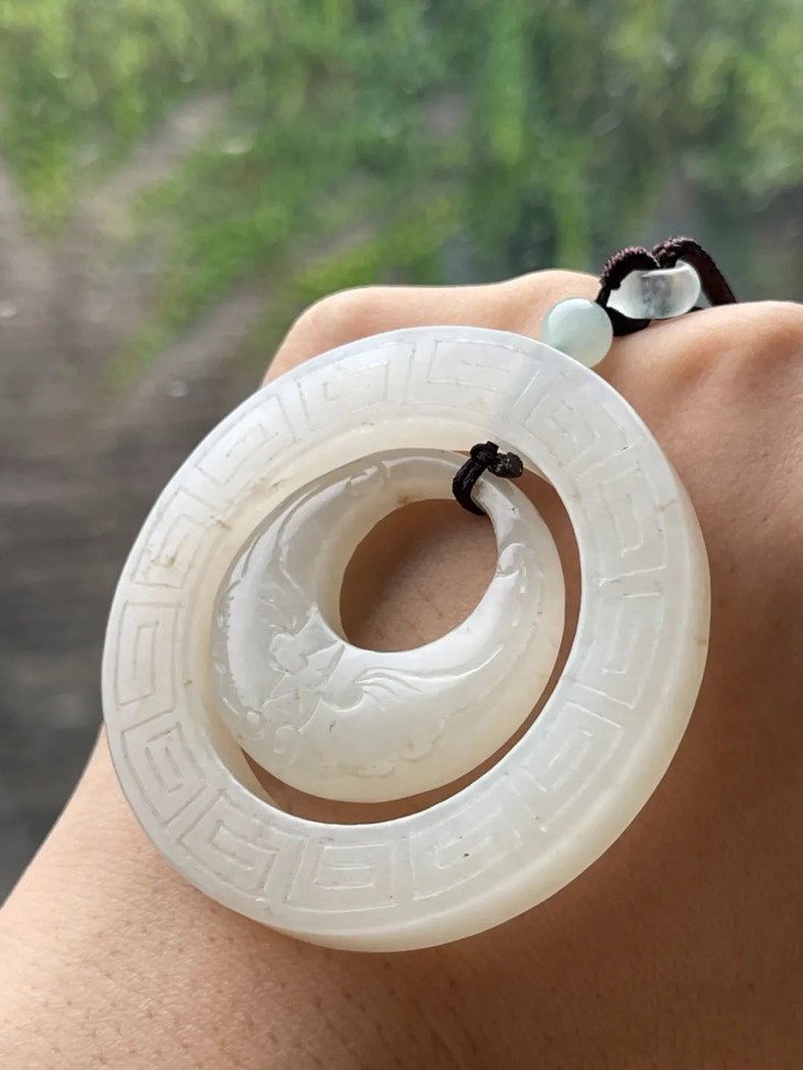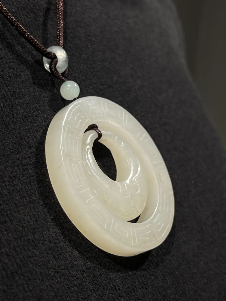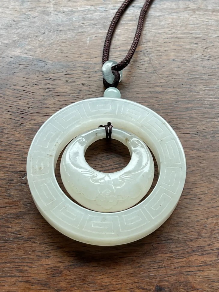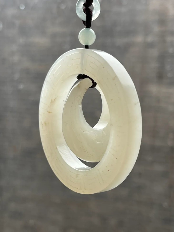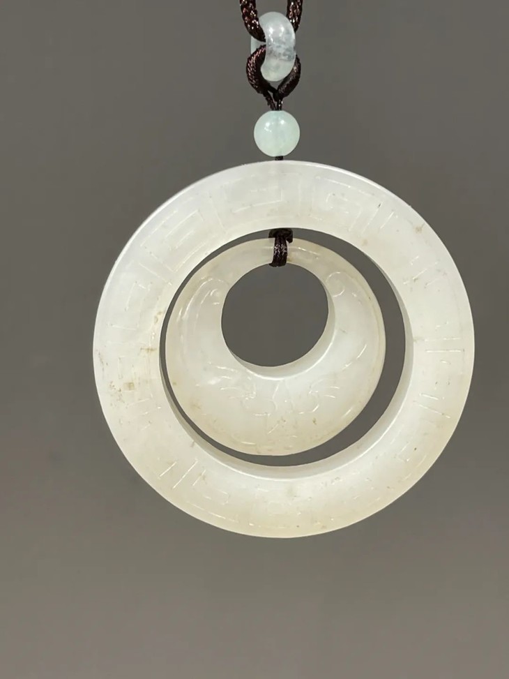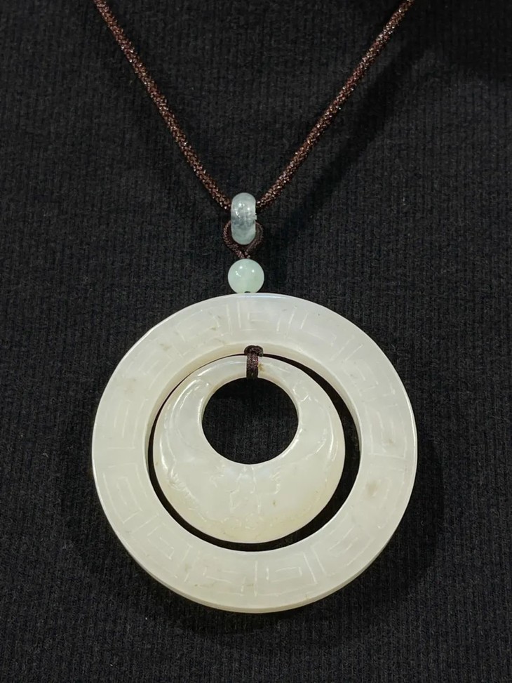 这是一件以和田白玉镂空透雕刻成各自独立的双环,外环雕回纹厚带状环双,内环雕蝙蝠纹新月形环,内外双环以绳结联结成象征“福在眼前”的双环玉珮,和田白玉色泽洁净纯白少瑕疵,质地坚硬油润,两块玉石精心雕琢成环并穿绳结成双环玉珮項链。