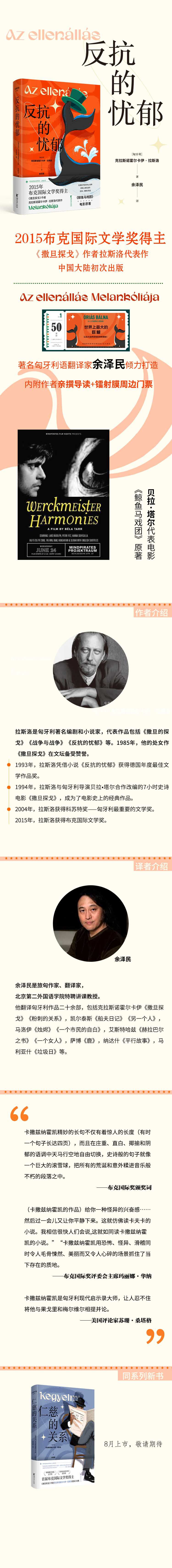 《反抗的忧郁》是匈牙利当代小说家、2015年国际布克 奖得主克拉斯诺霍尔卡伊拉斯洛 (Krasznahorkai Laacute;szloacute;, 1954 ) 的代表作之一,也是他继处女作 《撒旦探戈》 (1985)之后创作的第二部长篇小说,出版于1989年。对东欧人来说,那是历史剧变的重要年份,希望的兑现,也伴随着动荡、暴力和令人惶然的未知;时年35岁的作者继续用他 标志性的哲学寓言的隐喻形式和火山熔浆般缓慢流淌的复杂长句,向我们描绘出冷战末期东欧社会危机重重的衰败景象,而且,我们会在阅读中会惊愕地发现:这位被苏珊桑塔格称作;当代最富哲学性的小说家;撰写匈牙利启示录的大师的作家,竟用文学的方式预言了旧世界很快将像雪 崩般地轰然崩溃。然而,接下来的问题是:旧的秩序崩溃了,新的秩序就会好吗?在我看来,作者在小说中呼应了梁漱溟父亲在自杀前向儿子提出过的那个终极诘问:;这个世界会好吗?