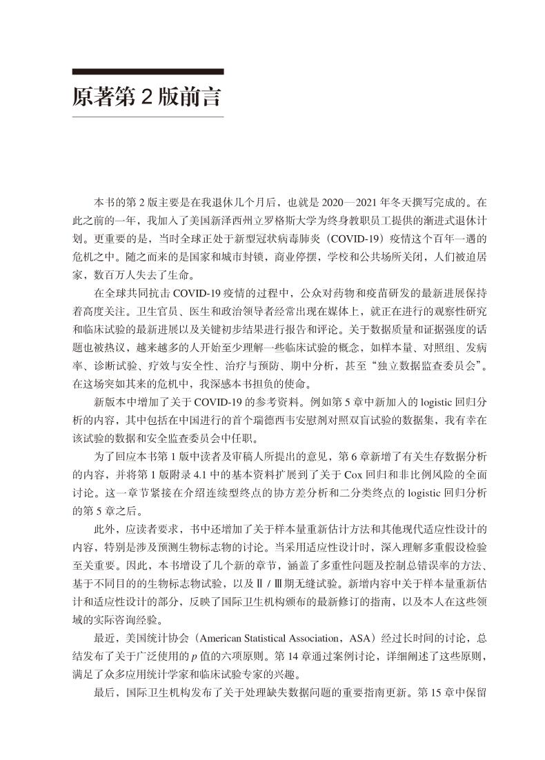 本书详细阐述了临床试验中生物统计学如何与多种基本科学原理和统计方法相结合。首先介绍了临床试验中的伦理和安全性基本原则、试验设计核心概念、样本量和把握度计算的原则和方法,以及协方差分析和分层分析。随后详细说明了两阶段Ⅱ期肿瘤临床试验至Ⅲ期成组序贯试验的序贯设计和方法,包括安全性、无效性和有效性监测。作者进一步讨论了样本量重新估计、适应性成组序贯设计、Ⅱ/Ⅲ期无缝设计,以及具有预测性生物标志物的试验设计。此外,本书还涵盖了多重检验方法的应用、估计目标和伴发事件的概念,以及不同的缺失数据处理方法。书中还描述了如何使用适当的多重插补来分析不完整数据。