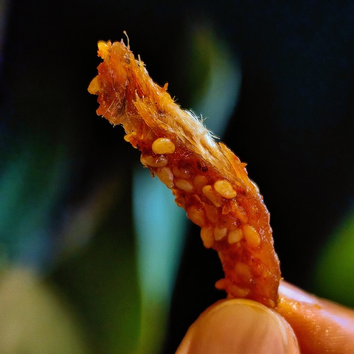 满满一层红油芝麻裹着的小银鱼,颜色蛮勾人的,吃起来辣度倒是刚刚好,并不会太辣,反而是辣中带丝丝咸香和鲜甜,而且是湿润的口感,小鱼肉一缕缕的,绵密又可撕,真恰到好处,一口难忘啊!真的不输之前的鱿鱼条,没胃口或者情绪略低的时候来一口,瞬间提振,生活都变美好啦!吃不了辣也可以试试五香味,也很棒,是办公桌上必备小零嘴!