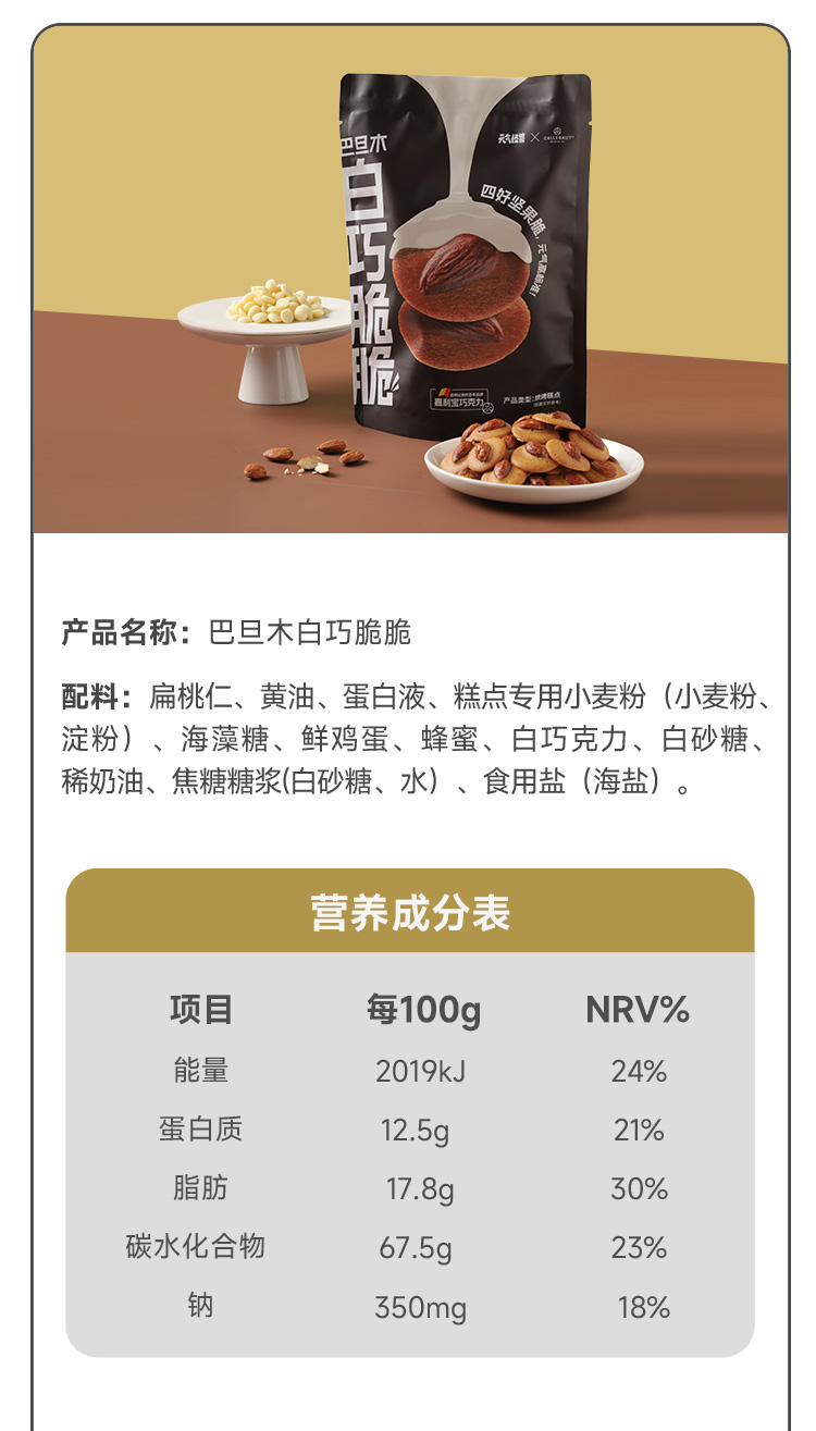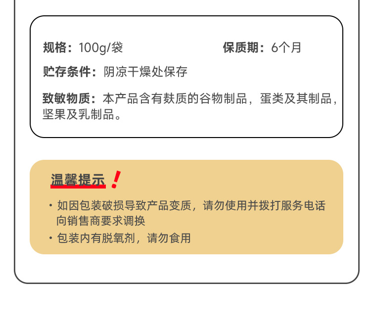 | 【品名】元气怪兽坚果脆 【规格】100g/袋(内含4小包) 【保质期】6个月 【储存方式】请置于阴凉通风干燥处 【产地】广州 【发货地】广州 【发货快递】圆通、极兔 【不发货区域】新疆、西藏、港澳台地区不发 【发货时效】48小时,节假日顺延 【温馨提示】产品发出后不支持拦截,请谨慎下单哦! |