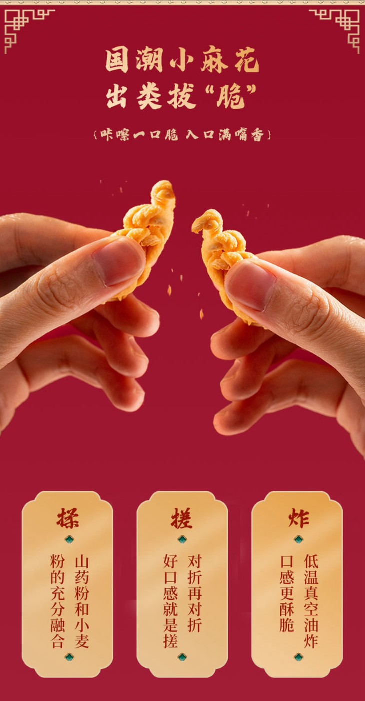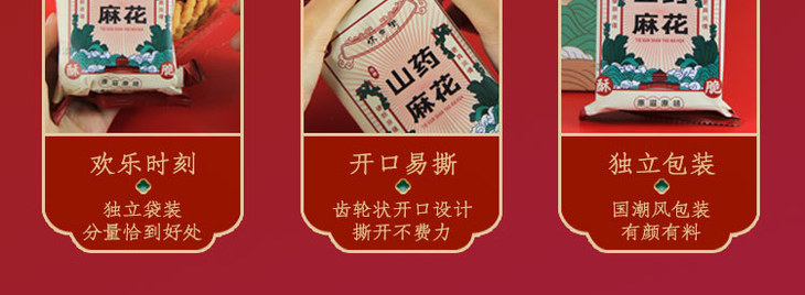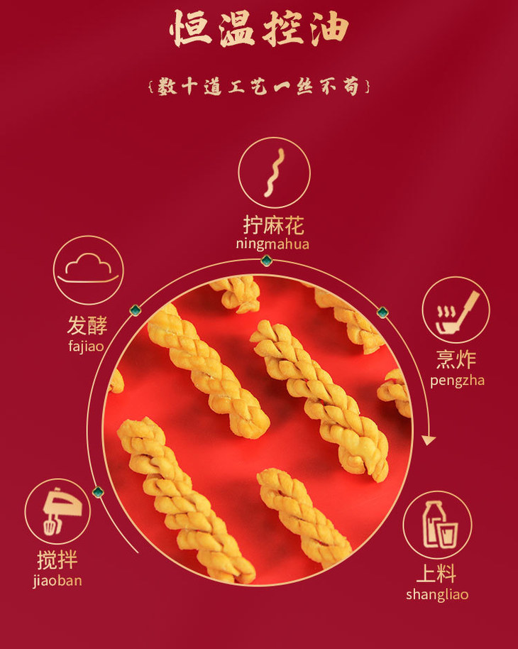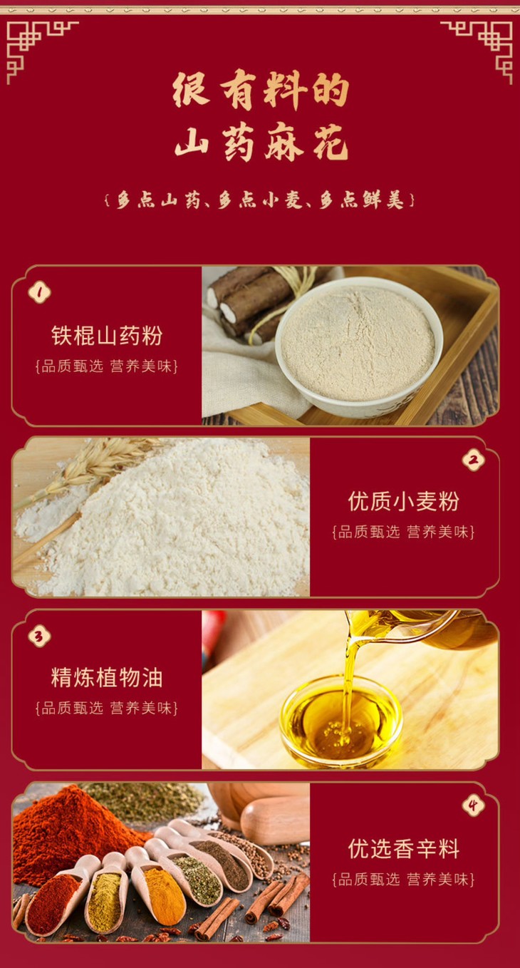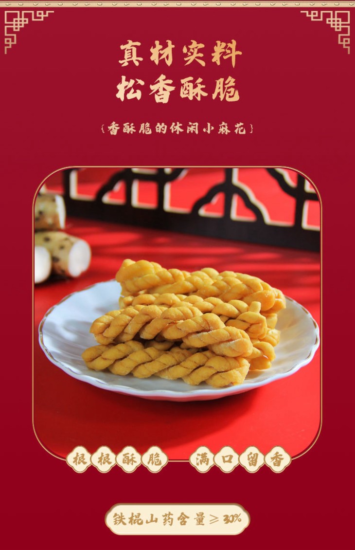 怀府街山药麻花以铁棍山药和小麦粉为主要原料,其中铁棍山药含量高达35%,作为国家地理标志产品,不仅口感独特,而且富含矿物质和维生素,具有药食同源的特点。这样的选材保证了麻花的美味,又算得上健康小零食了!而且还采用真空低温油炸技术,让麻花酥脆可口,又降低了含油率,吃起来不会腻!在加工过程中,怀府街采用标准化的机器生产,严格控制选材和烘焙时间。通过多项权威质检,确保大家吃得放心安心!