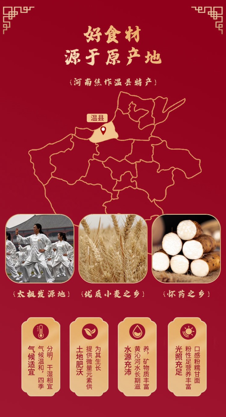 怀府街,是有自己的怀山药和怀菊花种植基地及自己的生产工厂的哦,保证了源头材料以及加工品质,非常专业!怀山药,作为常用的补气药,具有补脾养胃、生津益肺、固肾涩精的功效。从李时珍的《本草纲目》到《神农本草经》,都对怀山药赞不绝口,称赞其为“补虚上品”和“小人参”。山药色白入肺,味甘归脾,液浓益肾,所以山药能补肺补脾补肾,能健脾补虚,滋精固肾,治诸虚百损,疗五劳七伤,是日常食补的好食材!