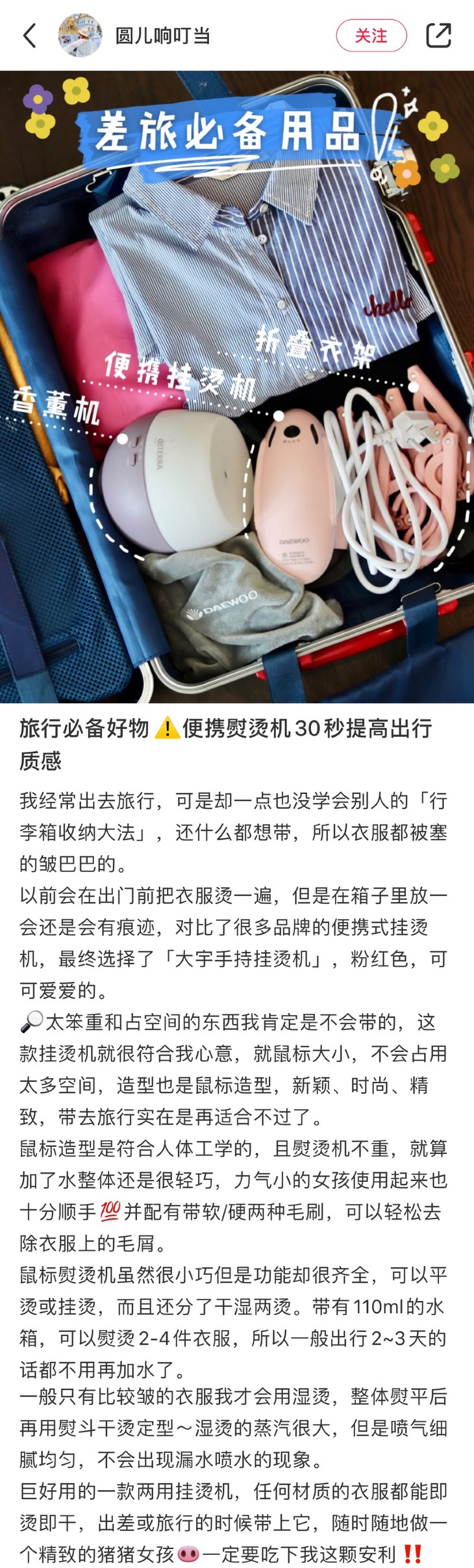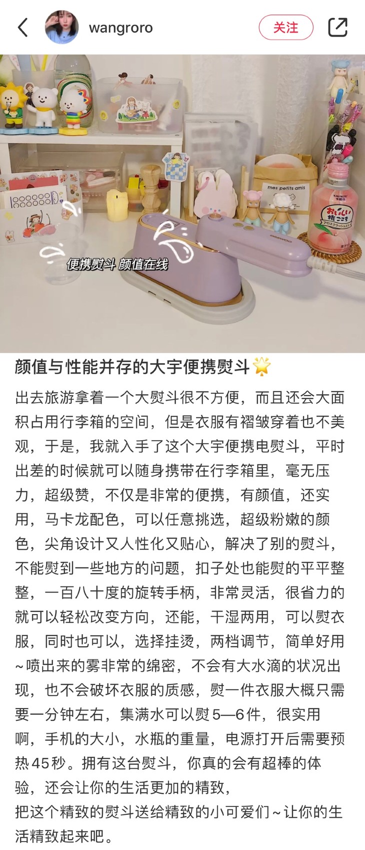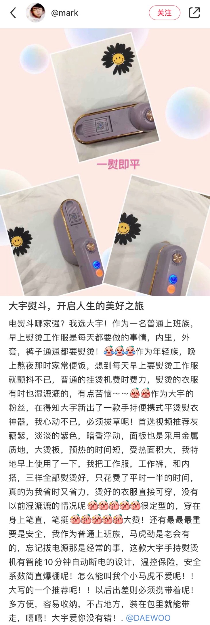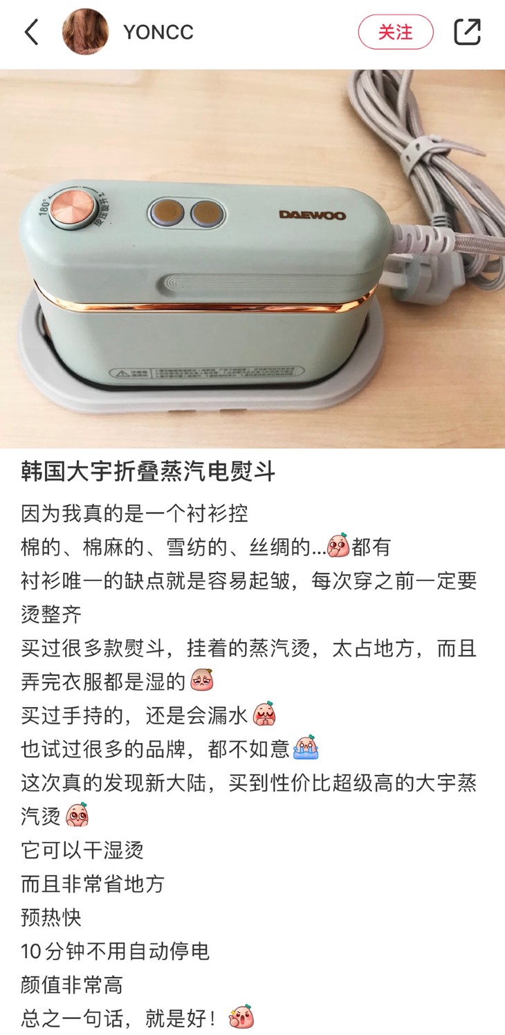 之前有老粉给我发人间小故事时说自己的老板是个细节控,要求公司员工工作服都要熨烫,夏天天天换衣服,每天睡觉都不够睡,还要搬出挂烫机来熨烫,真的是太累了!普通的挂烫机从搬出来到加水、预热、熨烫,怎么得都得20分钟以上,对于上班族来说真的太难了!那就看看大宇的便携式熨烫机,三分钟,搞定!