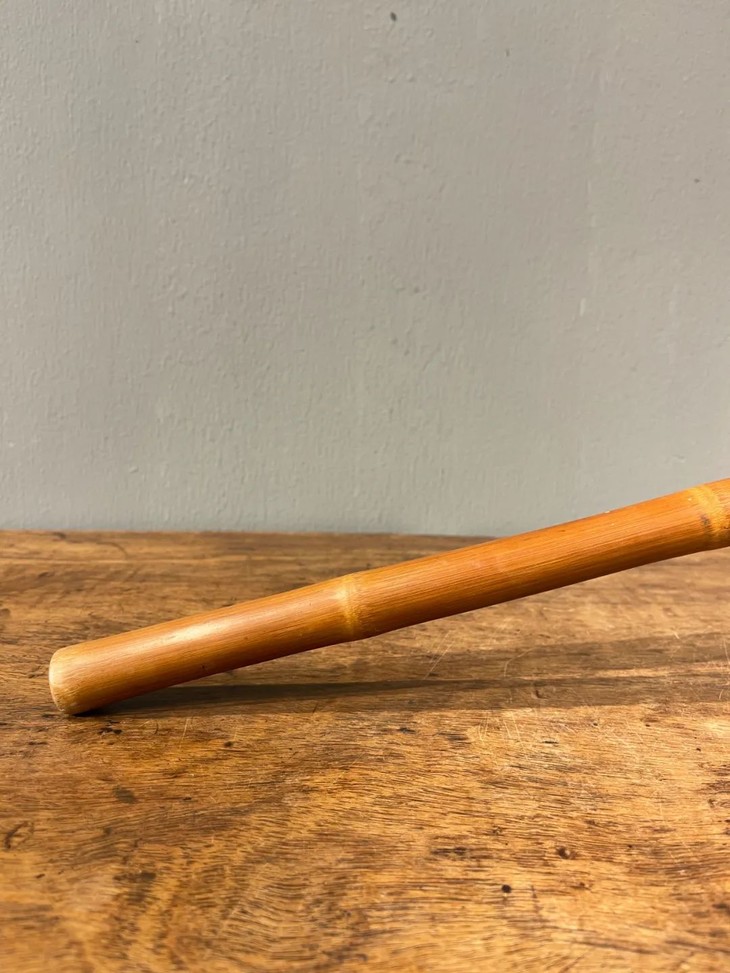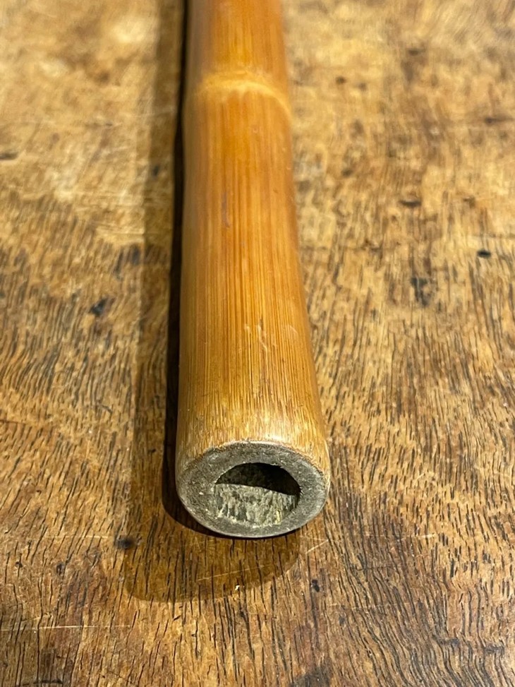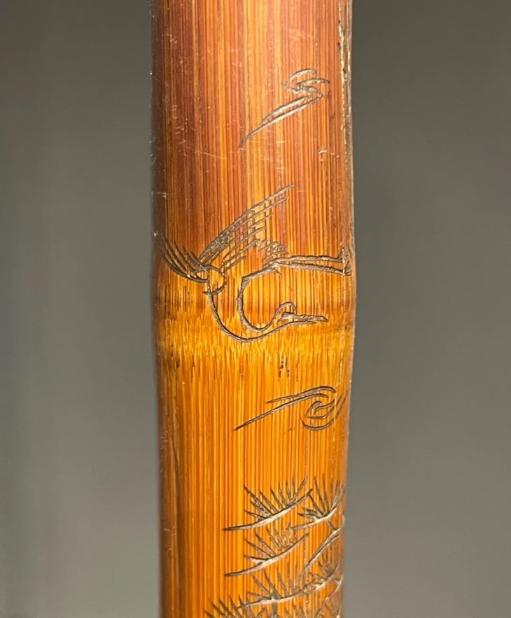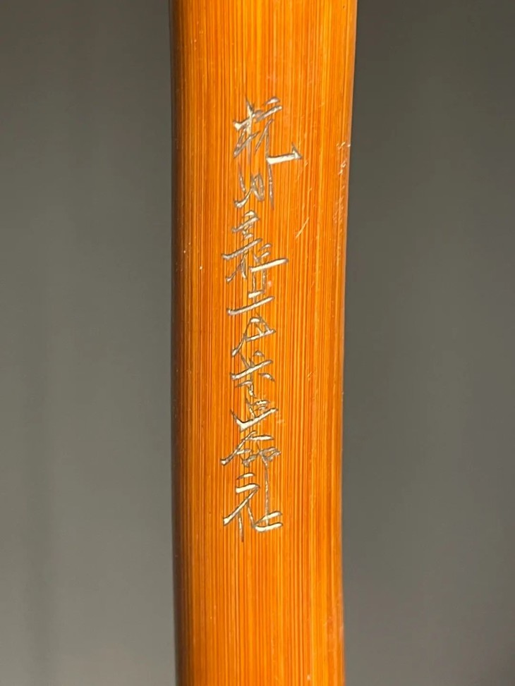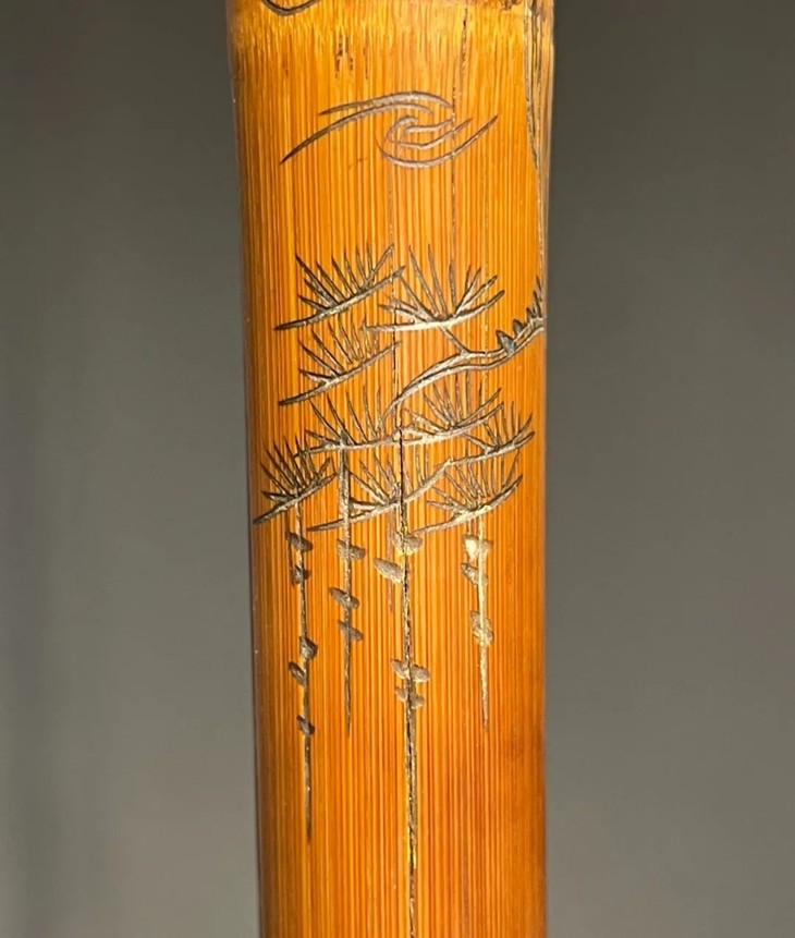 这是一件老刻花鸟书法竹制长洞箫,典型明清文人品味的竹洞箫,此细竹洞箫取材天然孟宗竹截段尊循古法制作成长达成长近一米的传统洞箫,表面针刻树木花鸟纹与工坊名款。造型典雅,竹杆表面琢磨细腻,阴刻名款与纹饰精美,老包浆浑厚。
