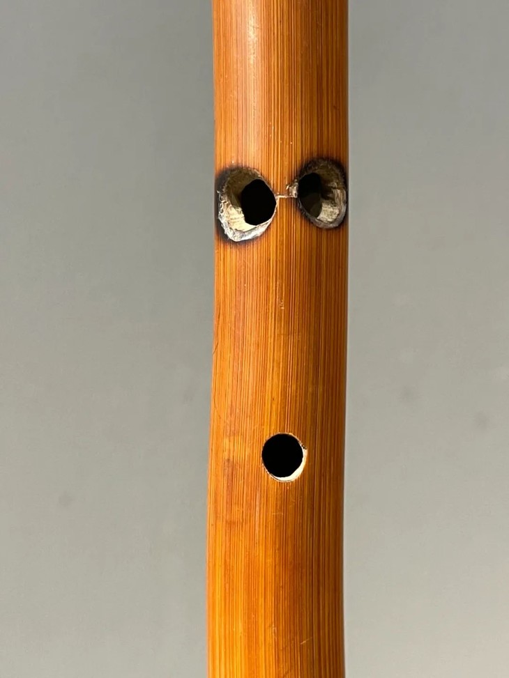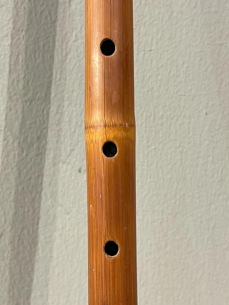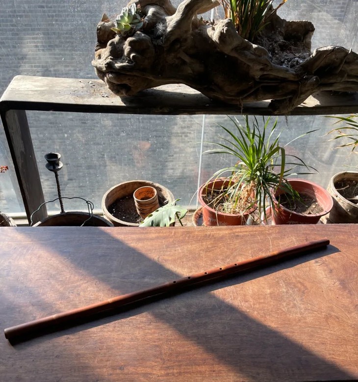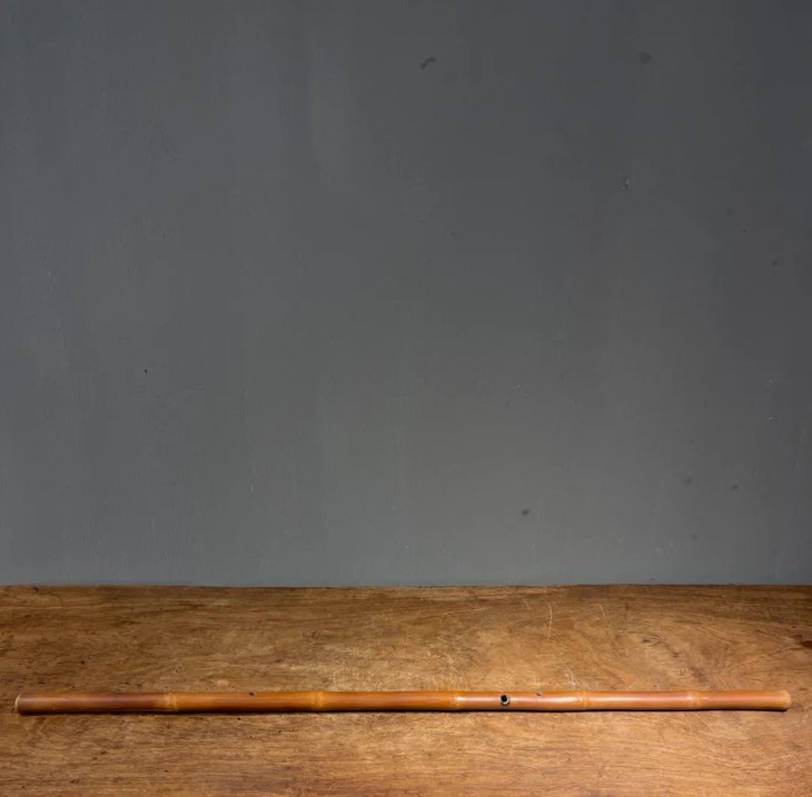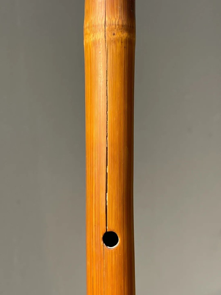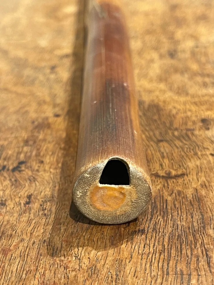 此刻花鸟书法竹制长洞箫,如图所示稍有尾端龟裂痕与细微磨损以外,保存完好无损,表面包浆皮壳温润细腻。此洞箫年代久远,是民国或更早之器。