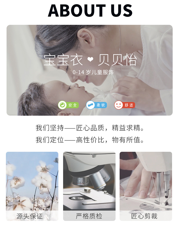 - 贝贝怡专注0-6岁婴幼儿服饰,坚持安全、柔软、舒适的产品理念,为千万中国家庭提供超高品质、安全可靠的婴幼儿服饰产品,妈妈放心,宝宝开心!
