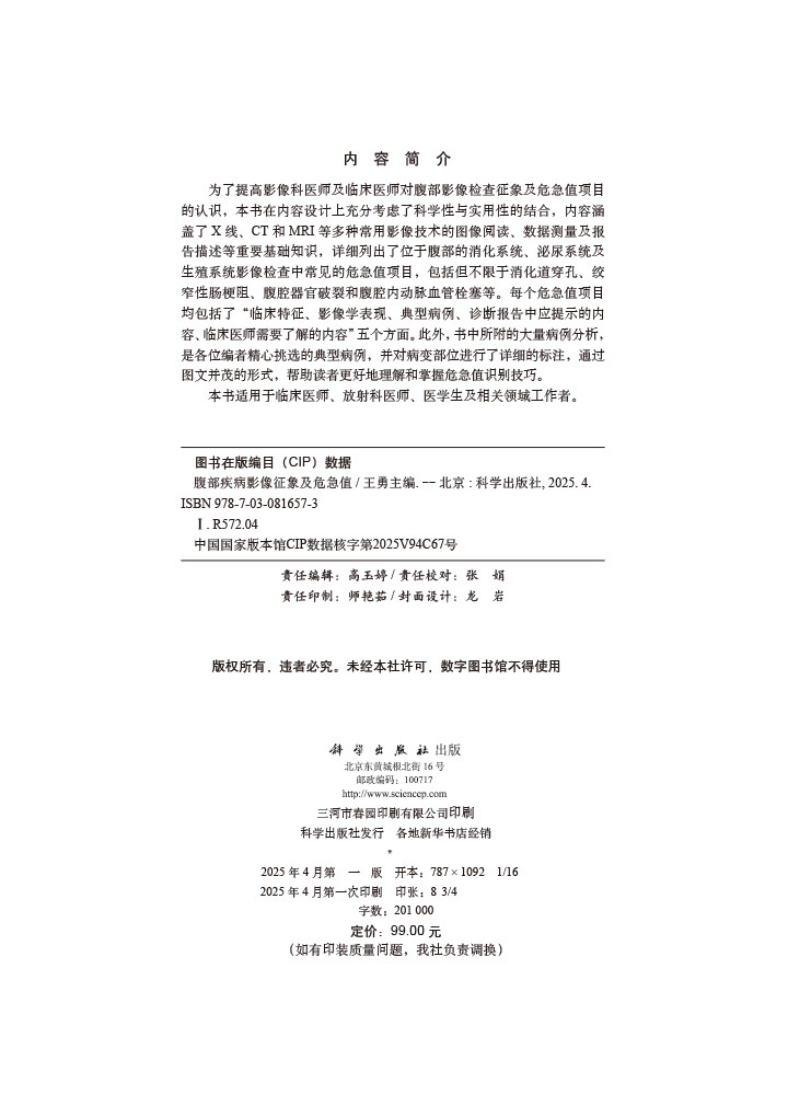 为了提高影像科医师及临床医师对腹部影像检查征象及危急值项目的认识,本书在内容设计上充分考虑了科学性与实用性的结合,内容涵盖了X线、CT和MRI等多种常用影像技术的图像阅读、数据测量及报告描述等重要基础知识,详细列出了位于腹部的消化系统、泌尿系统及生殖系统影像检查中常见的危急值项目,包括但不限于消化道穿孔、绞窄性肠梗阻、腹腔器官破裂和腹腔内动脉血管栓塞等。每个危急值项目均包括了“临床特征、影像学表现、典型病例、诊断报告中应提示的内容、临床医师需要了解的内容”五个方面。此外,书中所附的大量病例分析,是各位编者精心挑选的典型病例,并对病变部位进行了详细的标注,通过图文并茂的形式,帮助读者更好地理解和掌握危急值识别技巧。