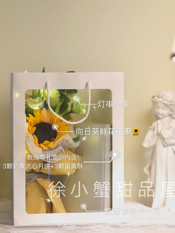 教师节礼盒【芳华】内含3颗奶黄流心月饼+3颗蛋黄酥,配置向日葵鲜花一束、贺卡一张,灯串一条