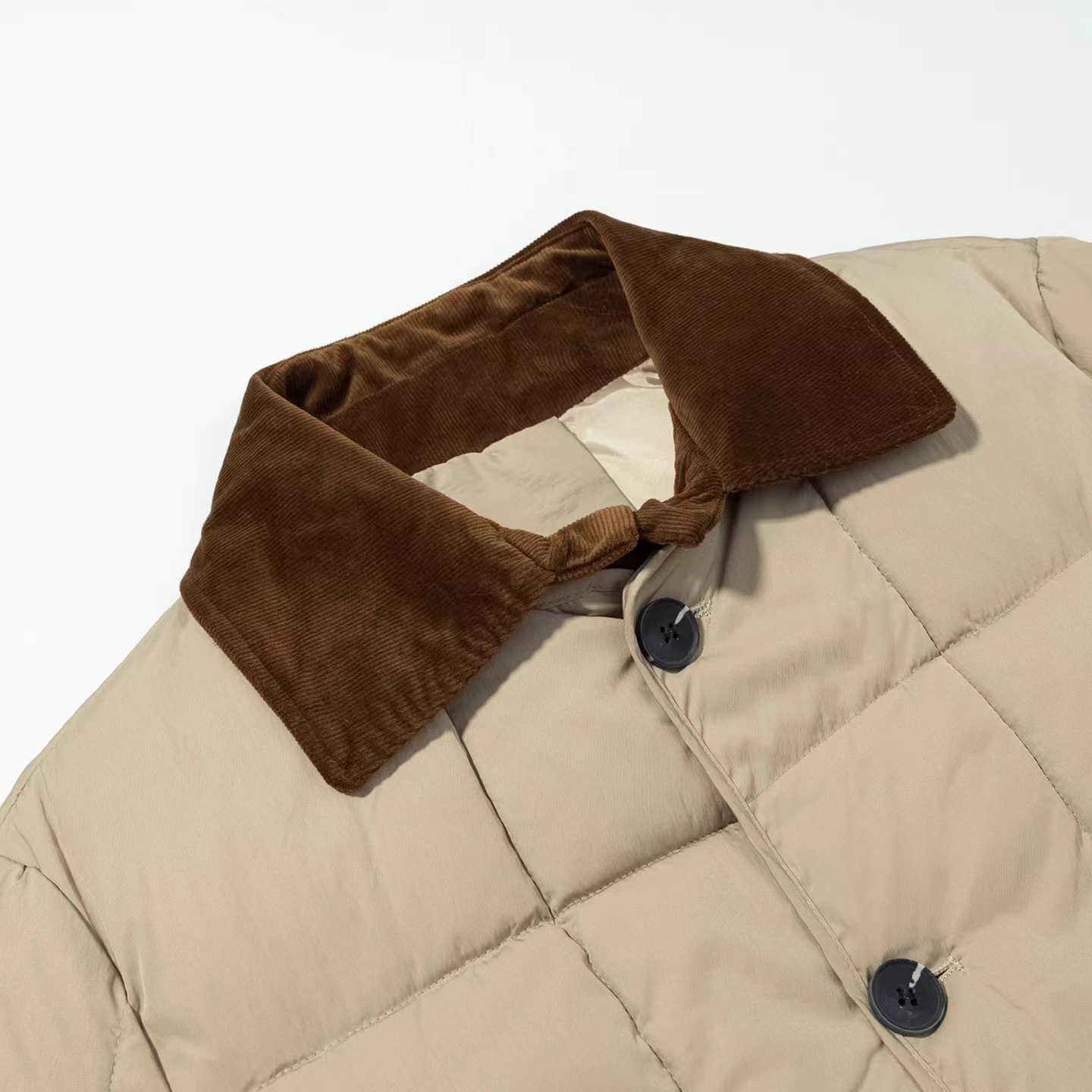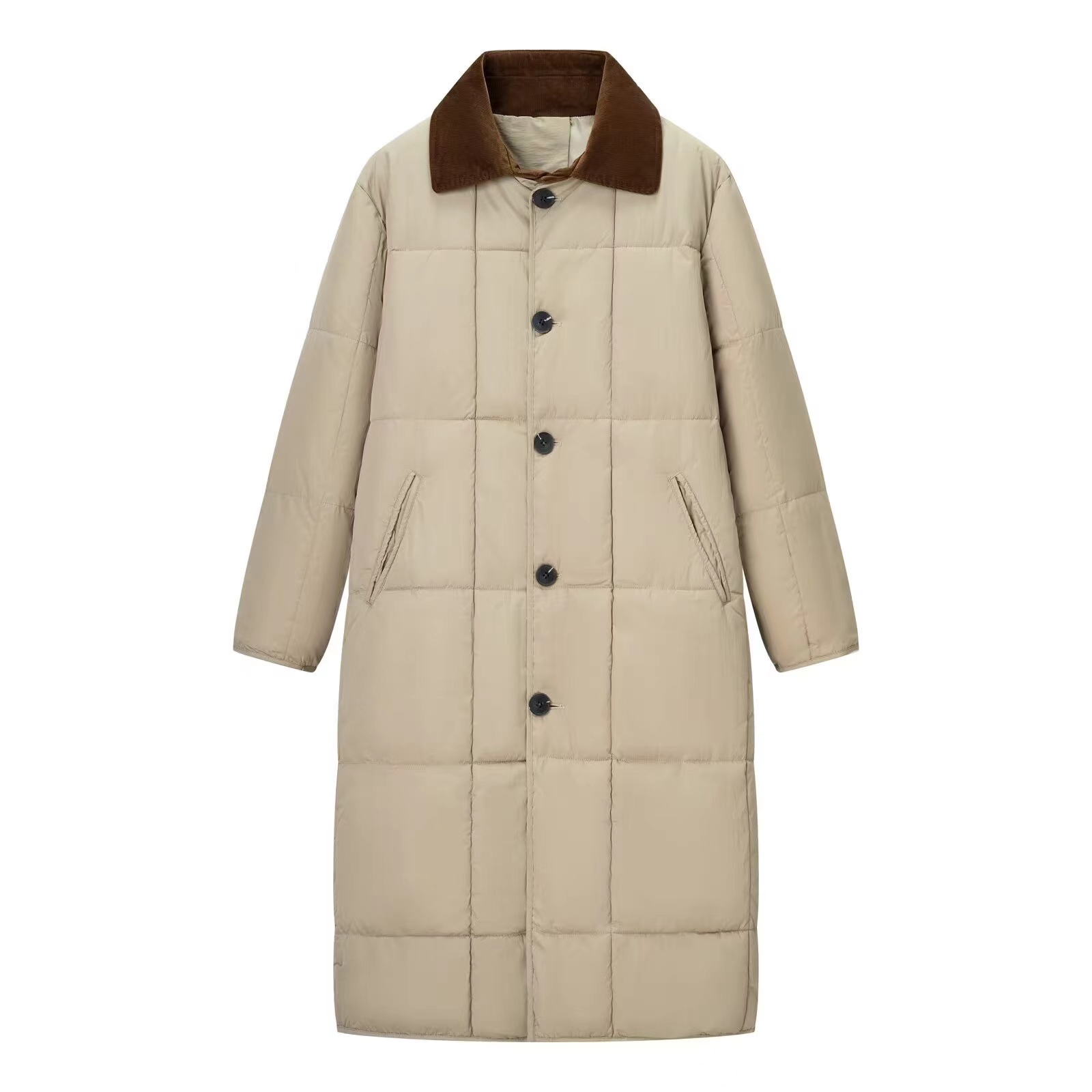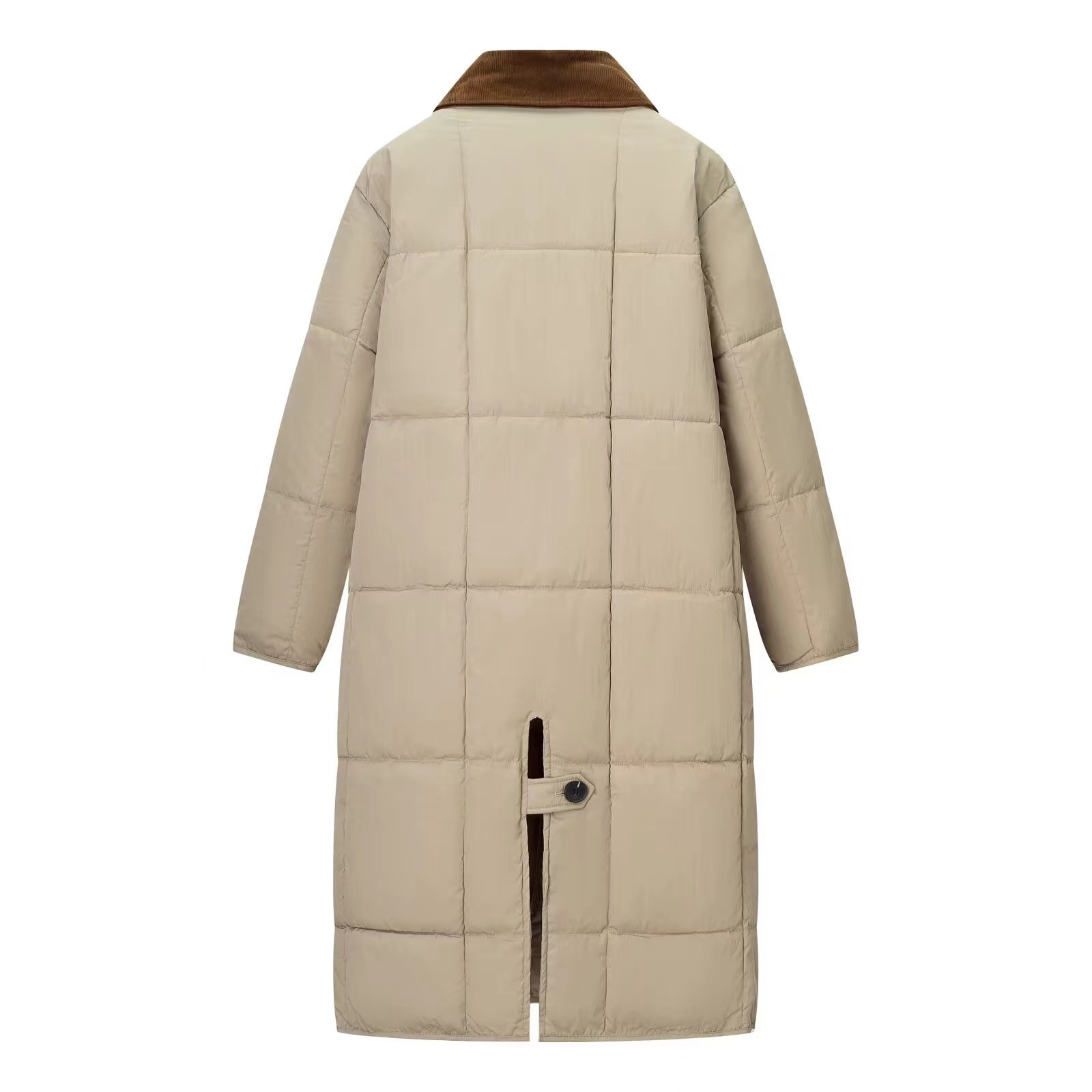 复古灯芯绒撞色翻领,卡其长款棉服太戳心!方格绗缝锁温不臃肿,后开叉设计更显利落,冬日穿搭的氛围感担当就是它。