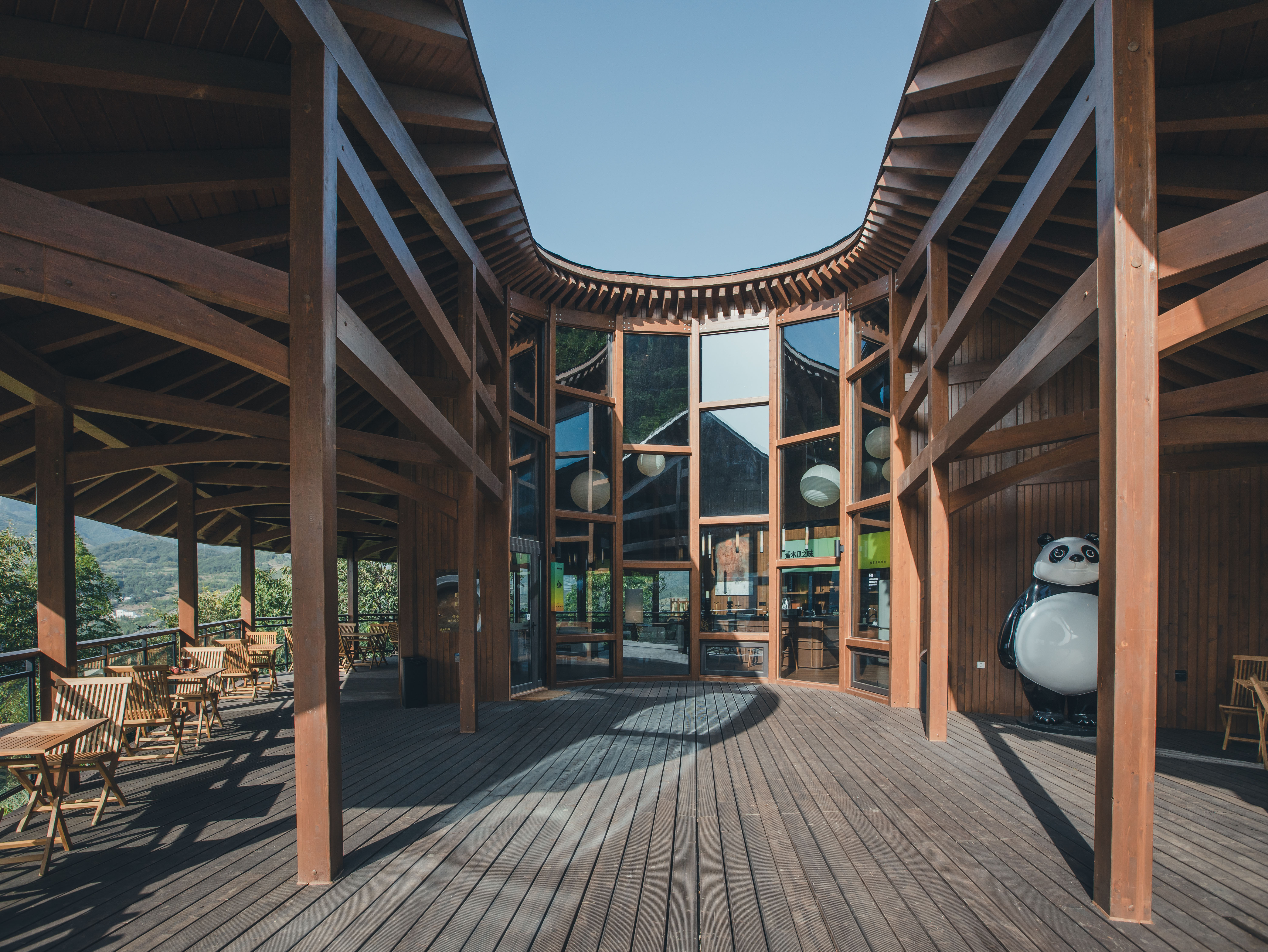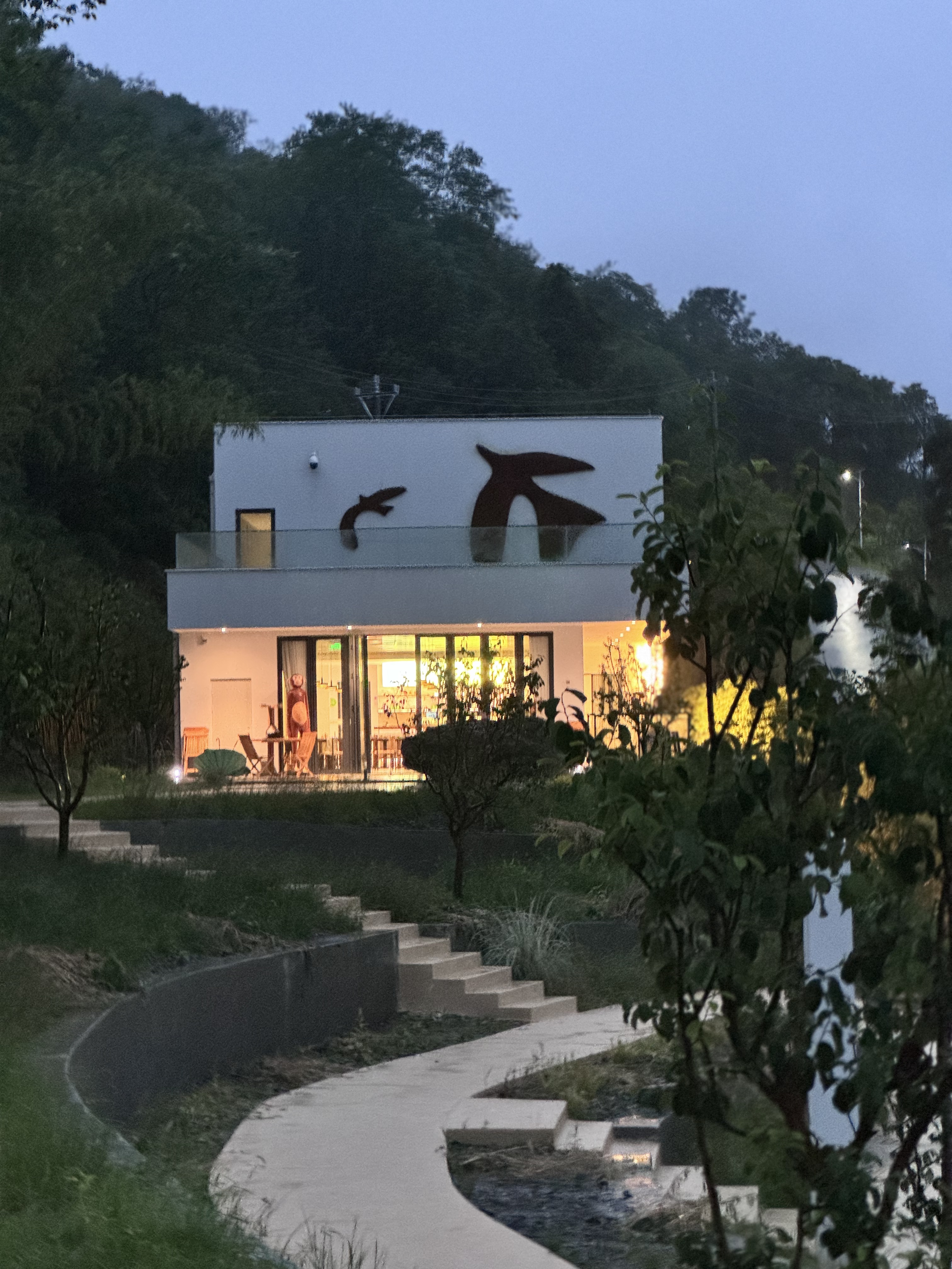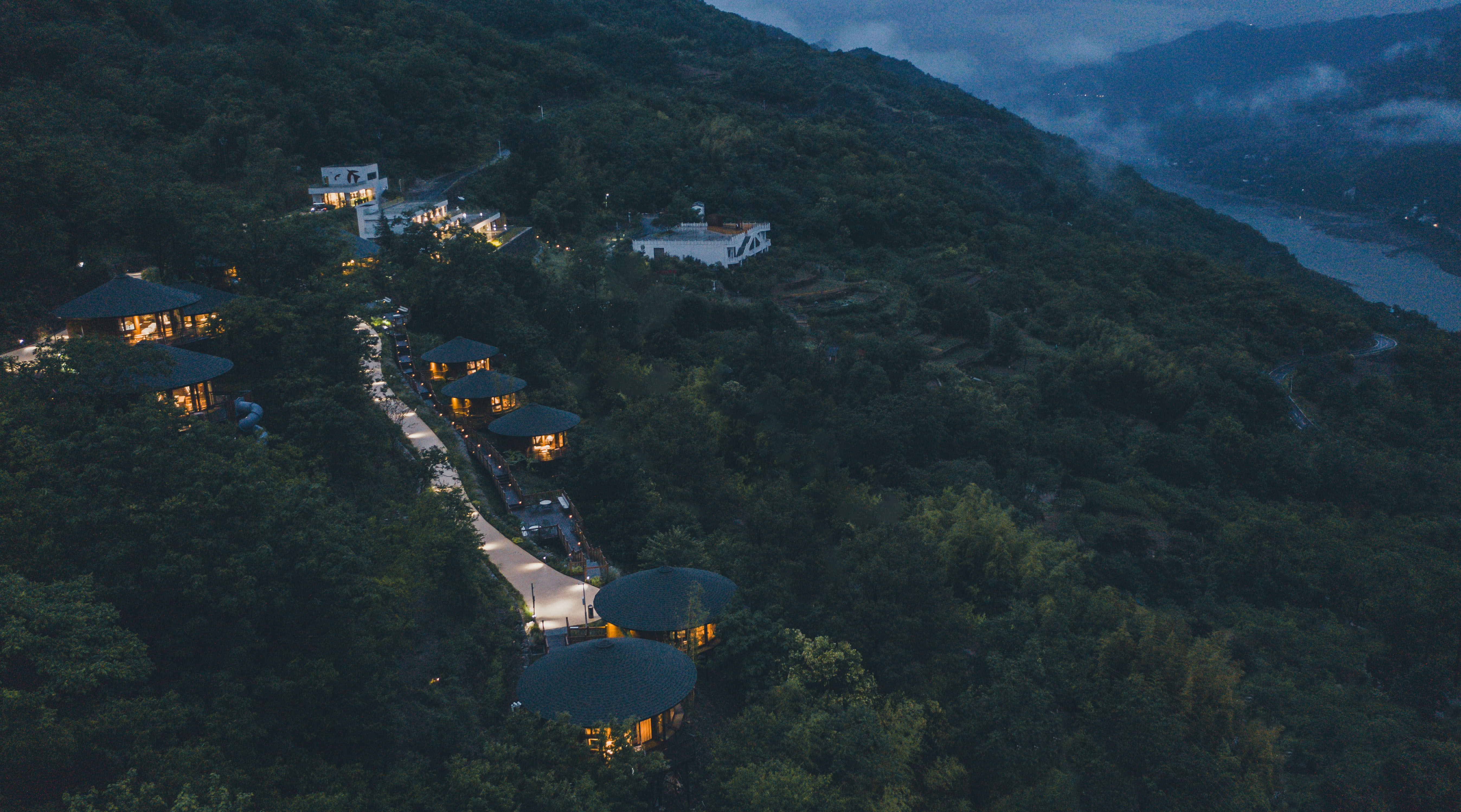 民宿有11间观江精品酒店、10栋观江森林木屋、1栋木屋咖啡厅、1栋主题餐厅,并配套木瓜生活馆、多功能观景平台、停车场等设施。酒店和餐厅整体建筑为现代主义风格,外部几何线条层叠分明,无边泳池、观景露台、矩形天窗……“生长”在竹林山野间,犹如一座秘境城堡。天气晴好时,清晨整栋房子被薄雾环绕,晨曦中梦幻氤氲。傍晚渔船灯火和杯中美酒的光影交织在一起,浪漫氛围自然流露。