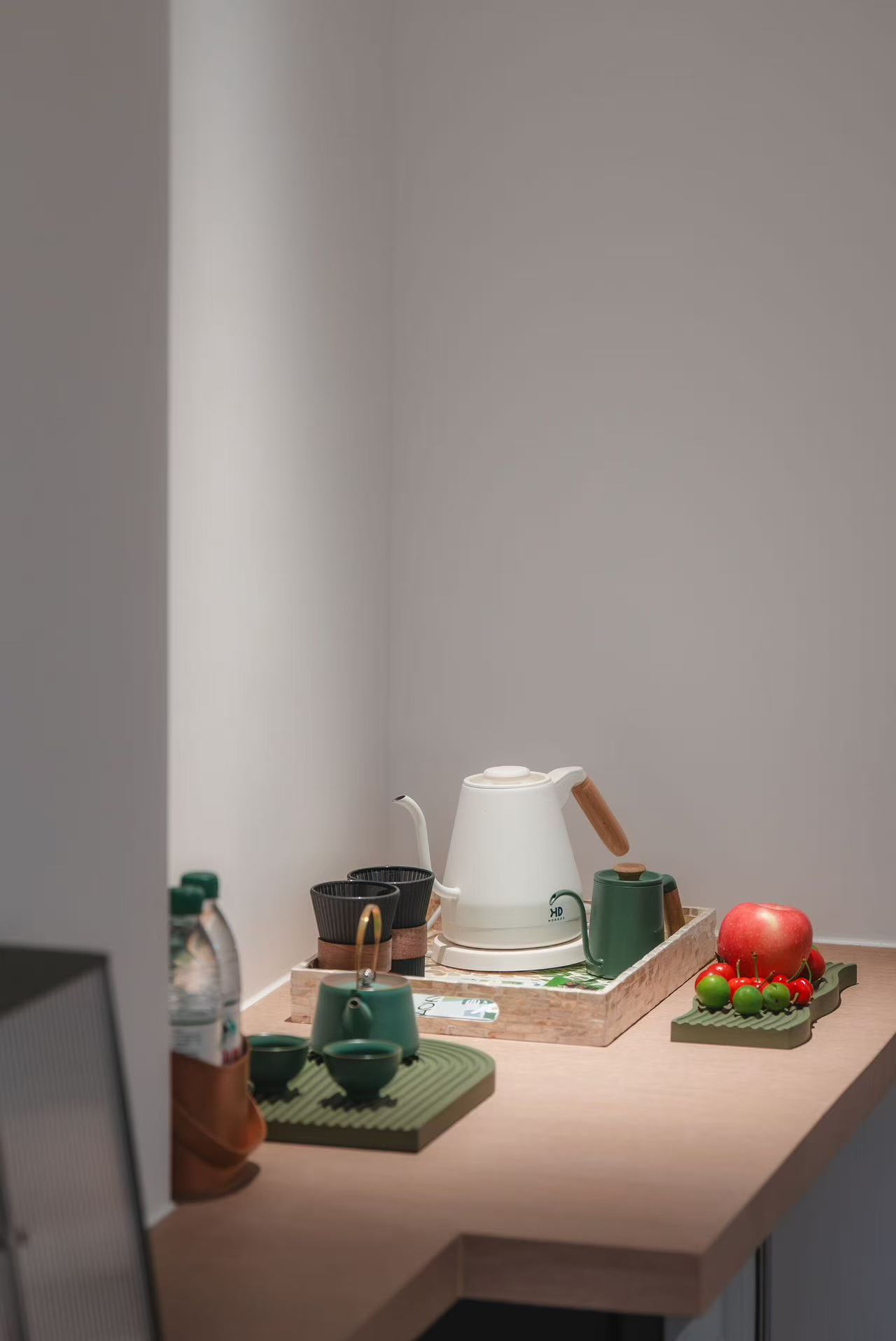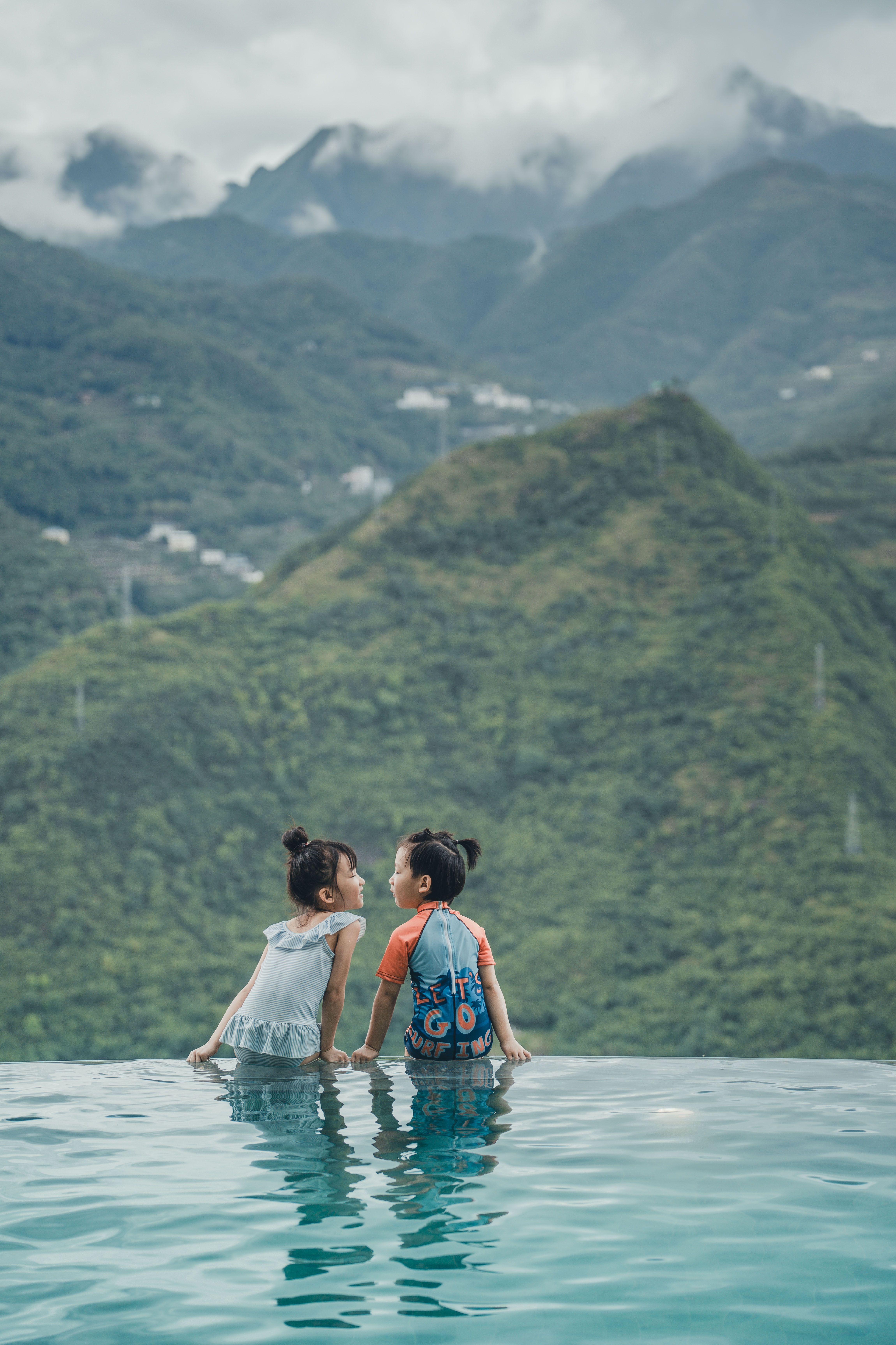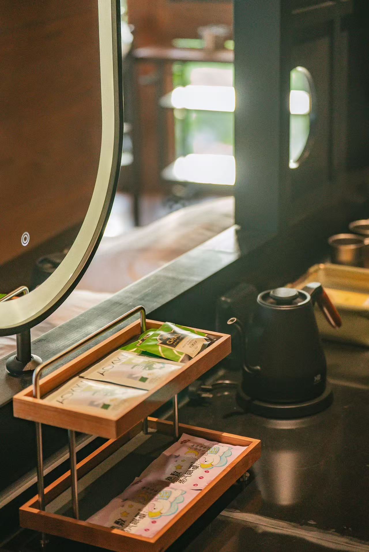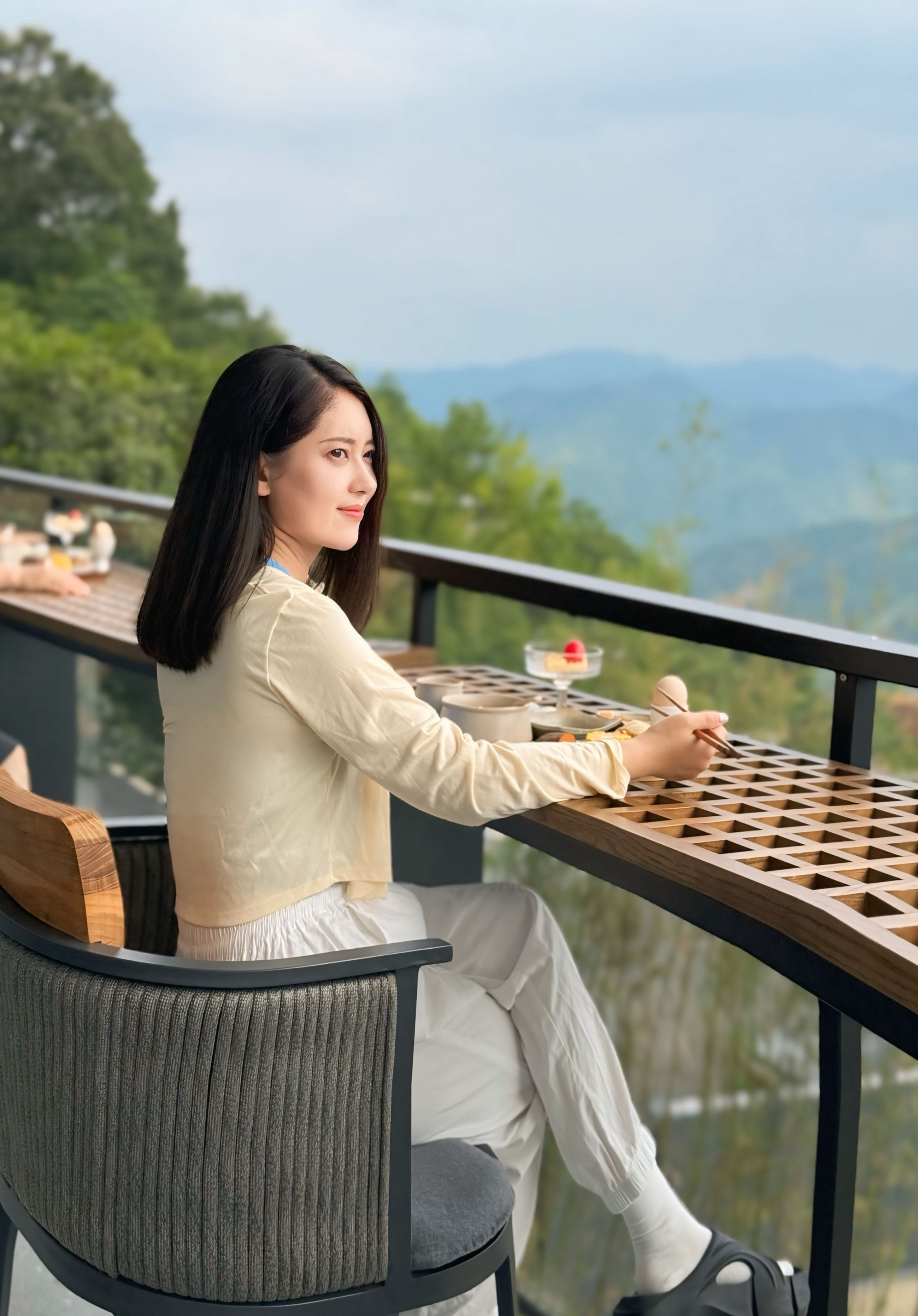 民宿有11间观江精品酒店、10栋观江森林木屋、1栋木屋咖啡厅、1栋主题餐厅,并配套木瓜生活馆、多功能观景平台、停车场等设施。酒店和餐厅整体建筑为现代主义风格,外部几何线条层叠分明,无边泳池、观景露台、矩形天窗……“生长”在竹林山野间,犹如一座秘境城堡。天气晴好时,清晨整栋房子被薄雾环绕,晨曦中梦幻氤氲。傍晚渔船灯火和杯中美酒的光影交织在一起,浪漫氛围自然流露。