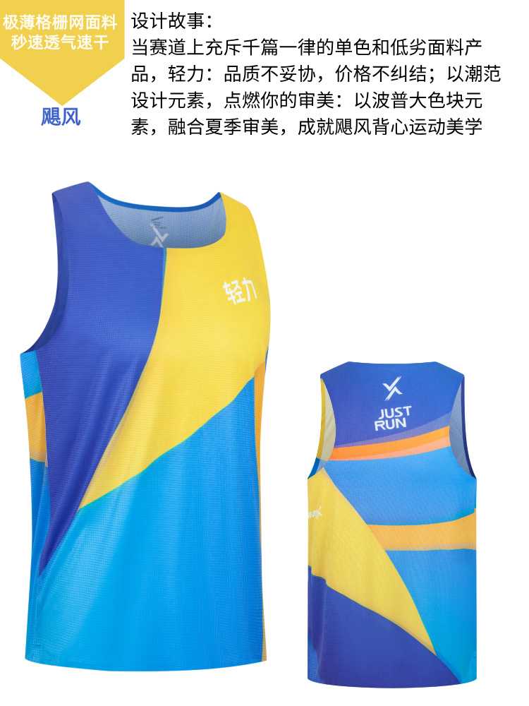 当赛道上充斥千篇一律的单色和低劣面料产品,轻力品质不妥协,价格不纠结;以潮范的设计元素,点燃你的审美:以波普大色块元素,融合夏季训练审美,成就飓风背心的运动美学。