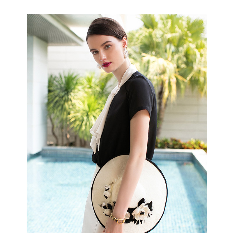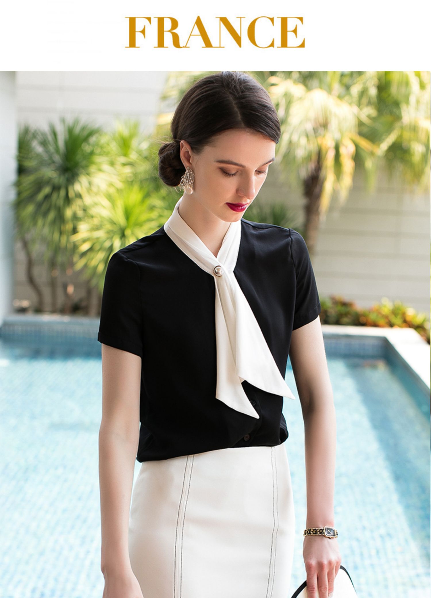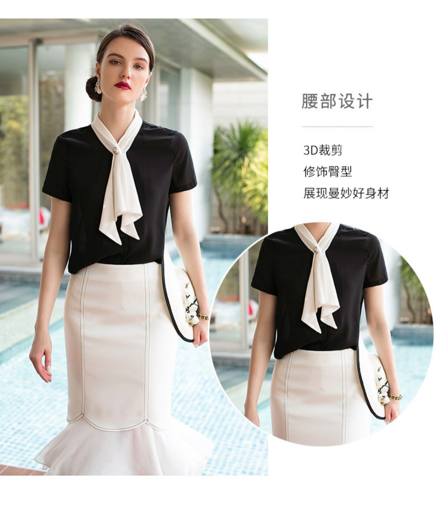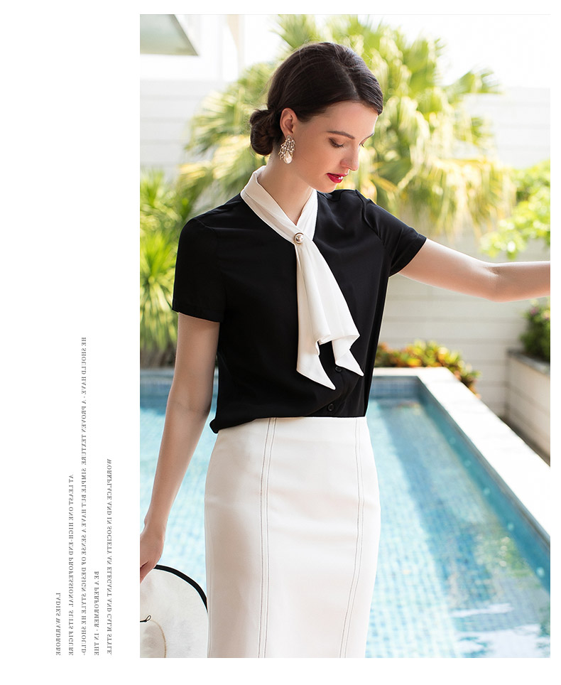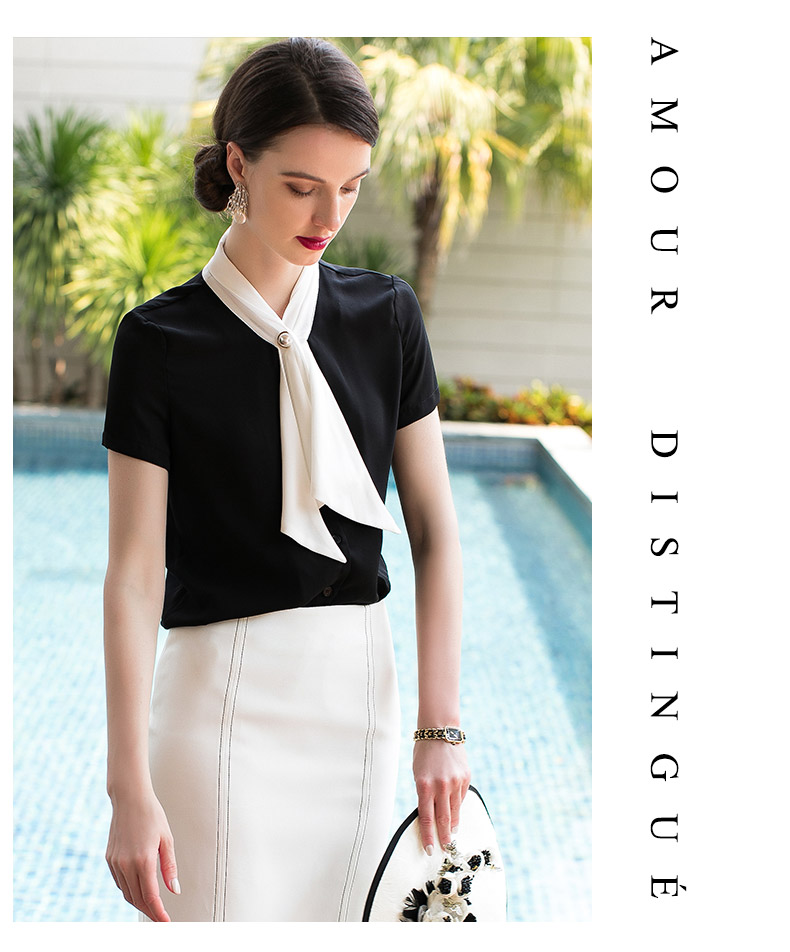 AD夏季新款时尚气质小香风黑色短袖系带衬衫白领OL职业装女装衬衣