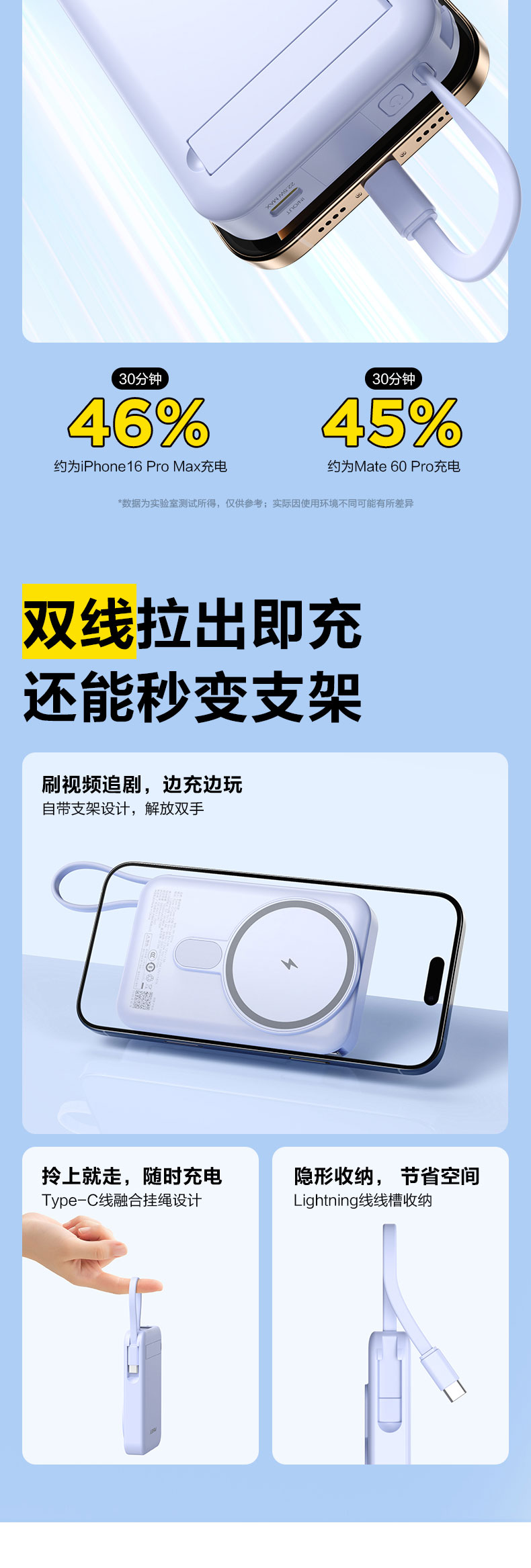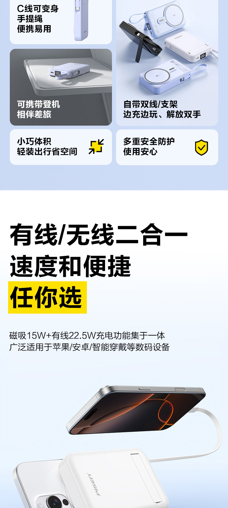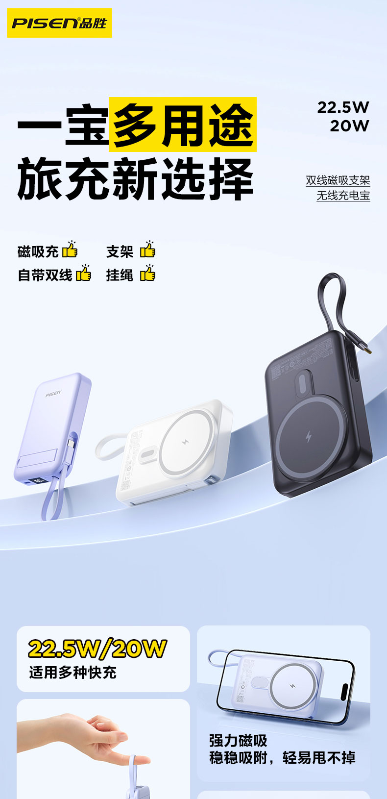 品胜 22.5W双线磁吸支架无线充电宝10000毫安 支持15W快充移动电源自带支架
