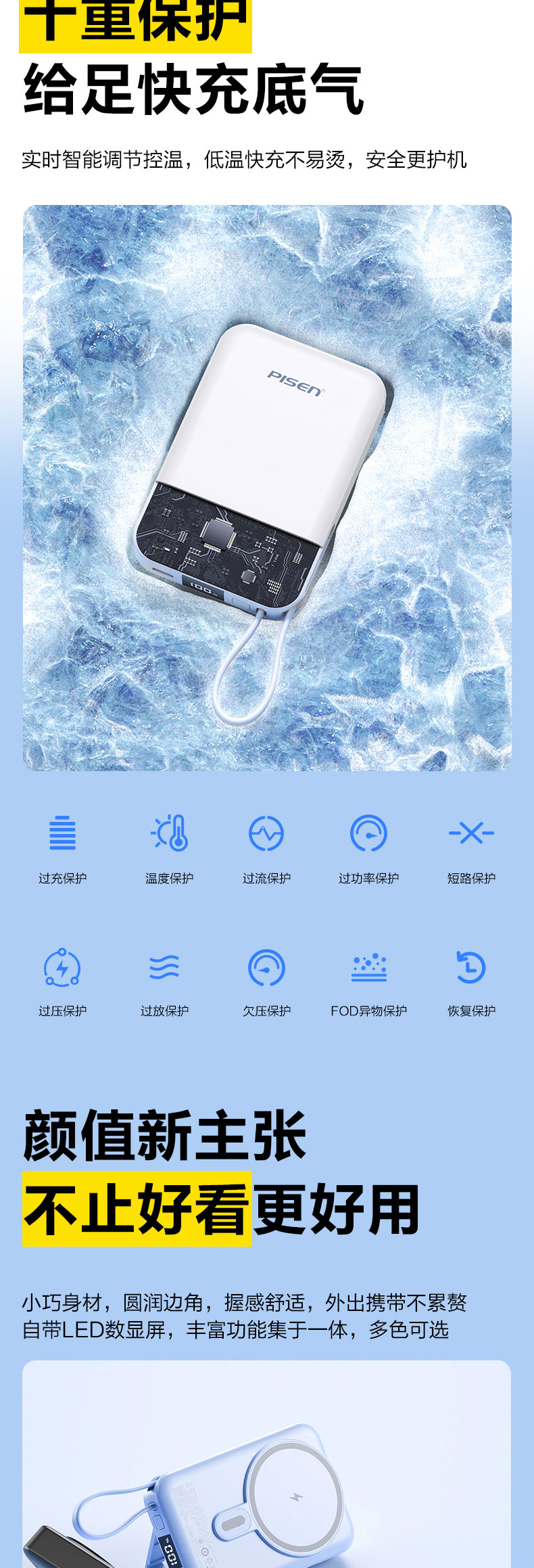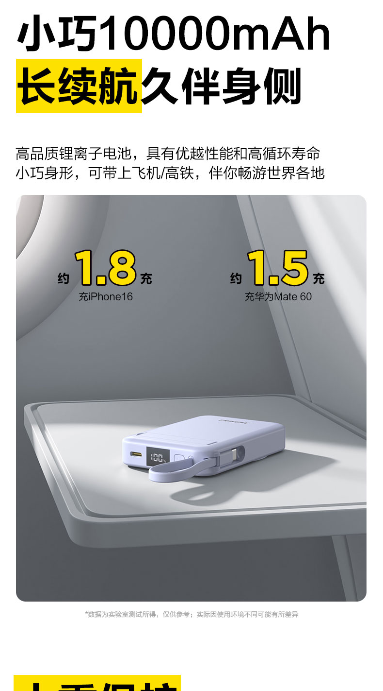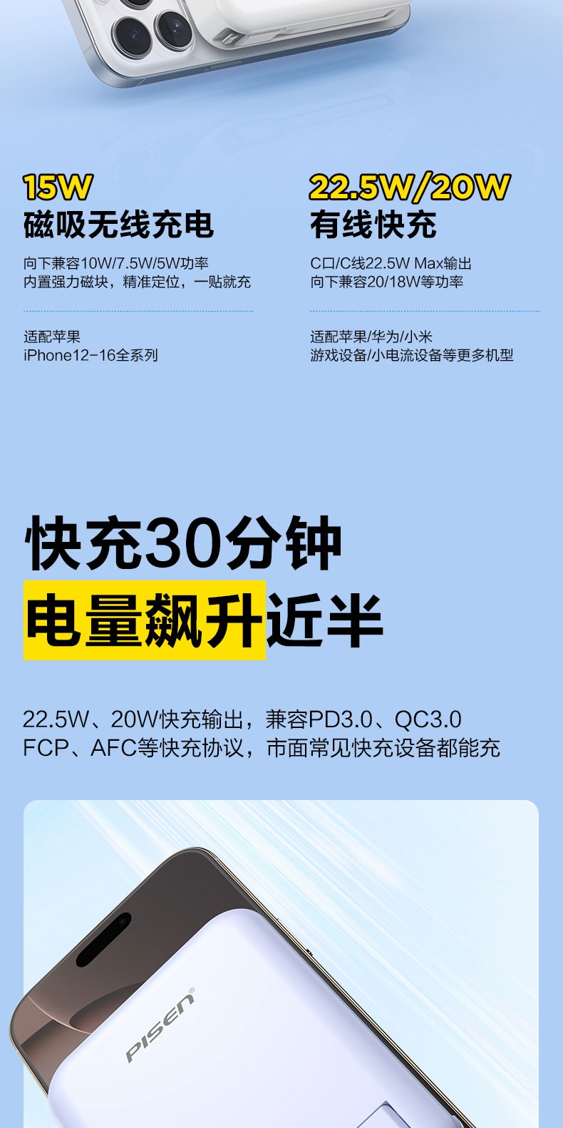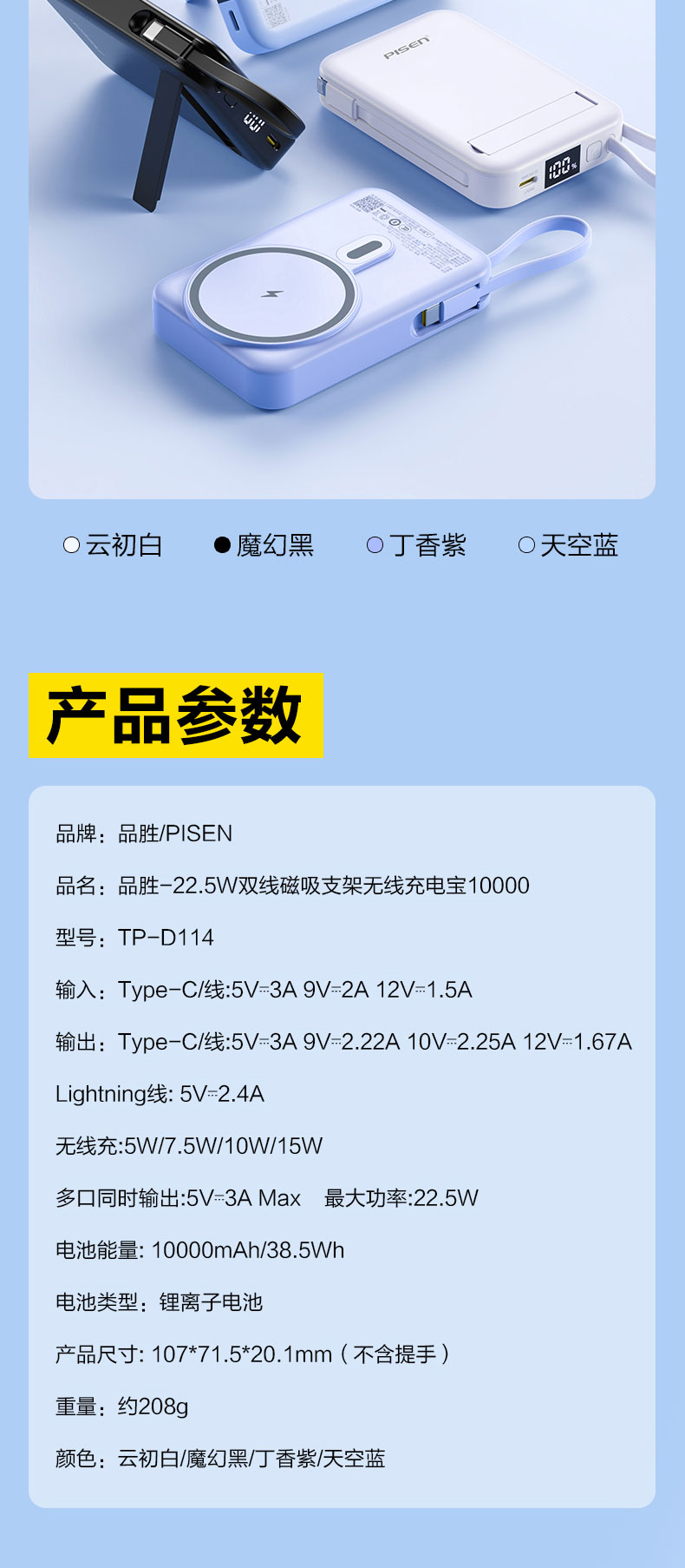 品胜 22.5W双线磁吸支架无线充电宝10000毫安 支持15W快充移动电源自带支架