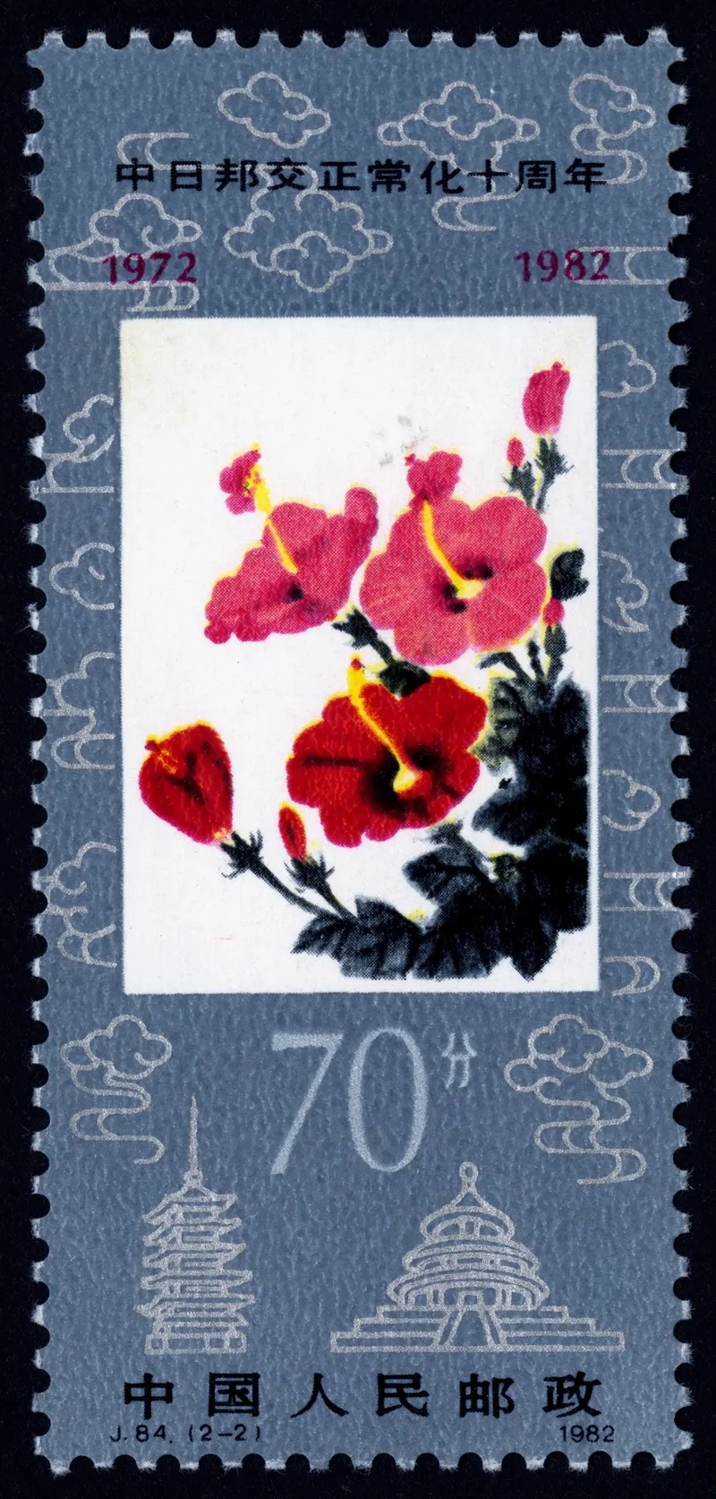 2-2为“扶桑”。主图为鲜艳的扶桑。邮票图案由著名画家肖淑芳绘制。扶桑象征日本。因为日本自古有扶桑国之称。