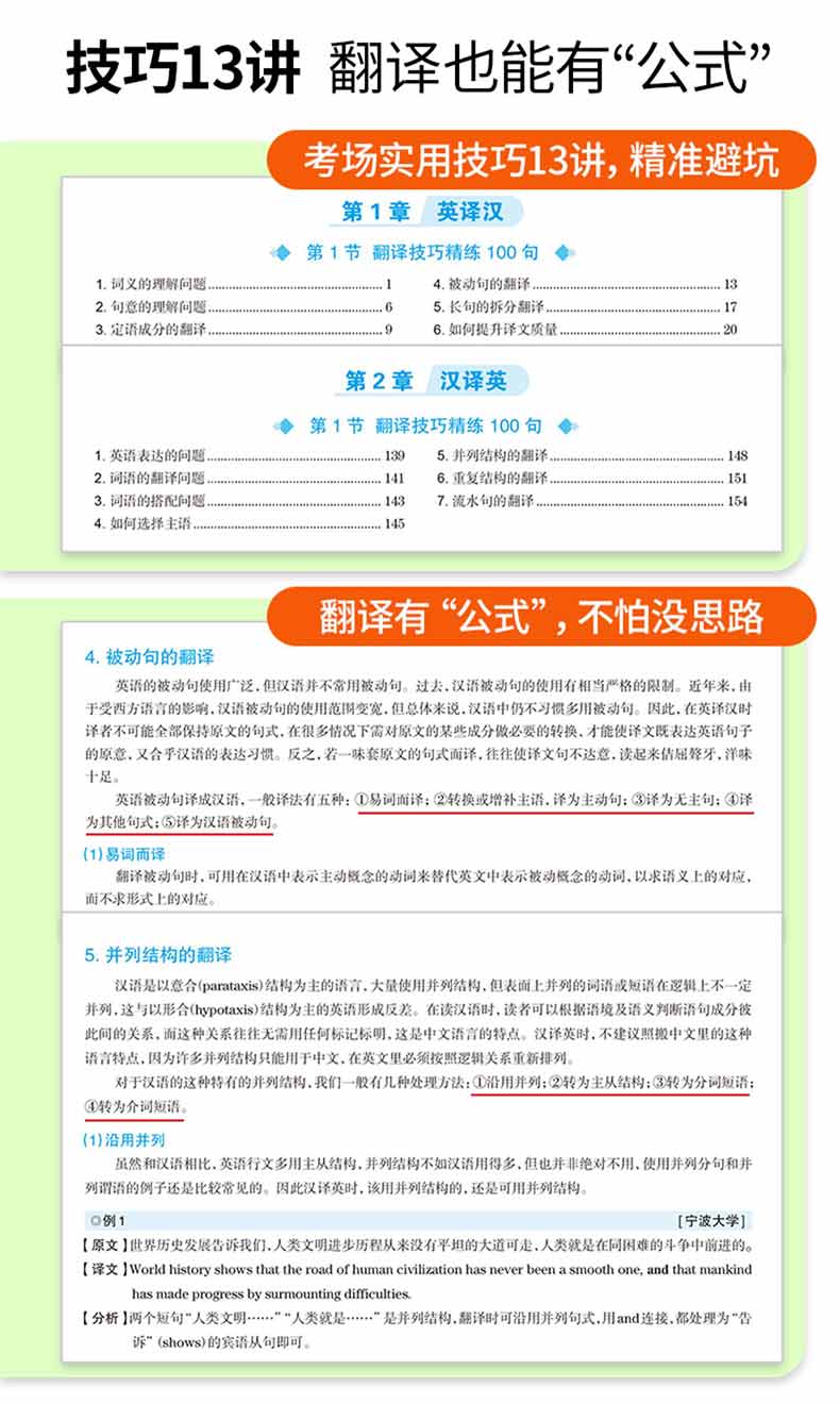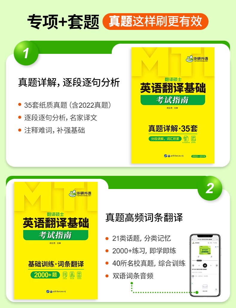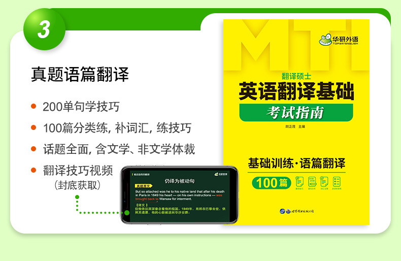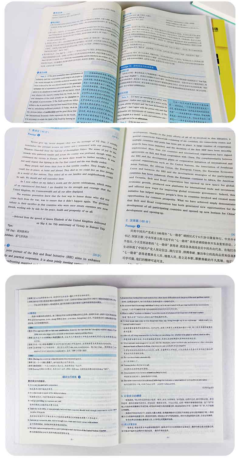 1.系统完整的备考方案,三分册装,从词条到语篇的基础着手,学练结合,先用分难度的技巧训练;再用近年真题进行实考训练,对照名家译文和解析补足短板;