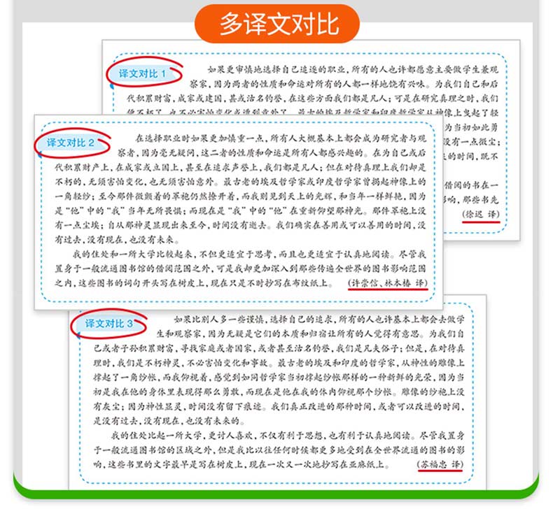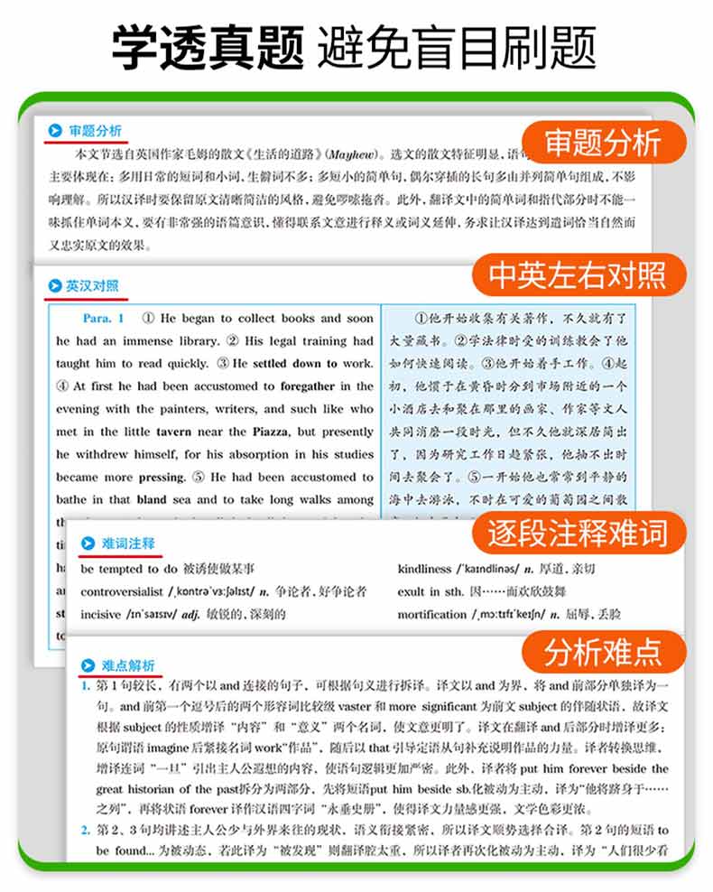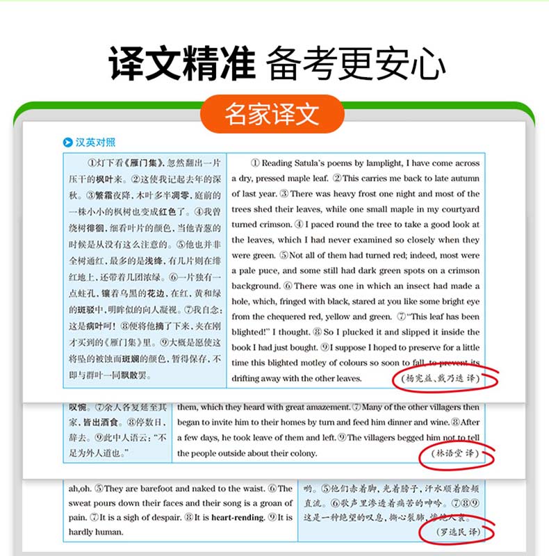 3.试题排版与实考题一致,增强实战感;答案解析详尽,含名家译文和多译本对比,中英文左右对照,难词难点逐段点评;