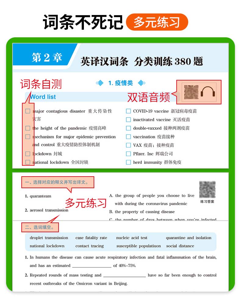 5.所有词条均附双语音频,扫码即听。每课后均附练习,从词到句,含语境练习。另含40套名校真题词条试题,供考生进行综合检测;