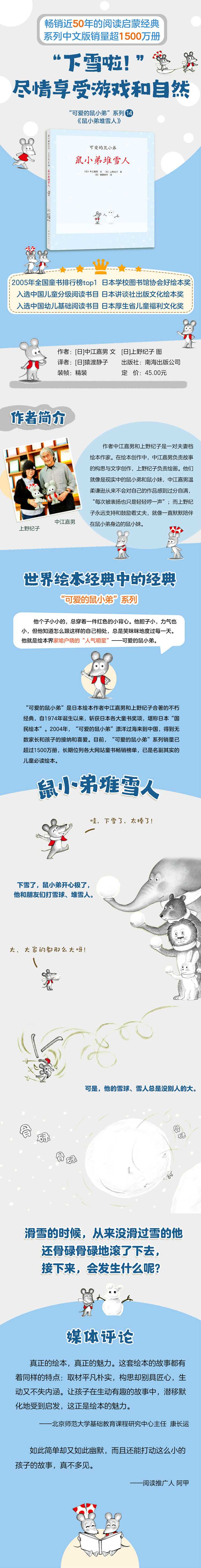 “可爱的鼠小弟”系列是日本绘本作者中江嘉男和上野纪子合著的不朽经典,自1974年诞生以来,斩获日本各大童书奖项——日本学校图书馆协会好绘本奖、日本产经儿童出版文化奖、日本讲谈社出版文化绘本奖、日本厚生省儿童福利文化奖,堪称日本“国民绘本”。