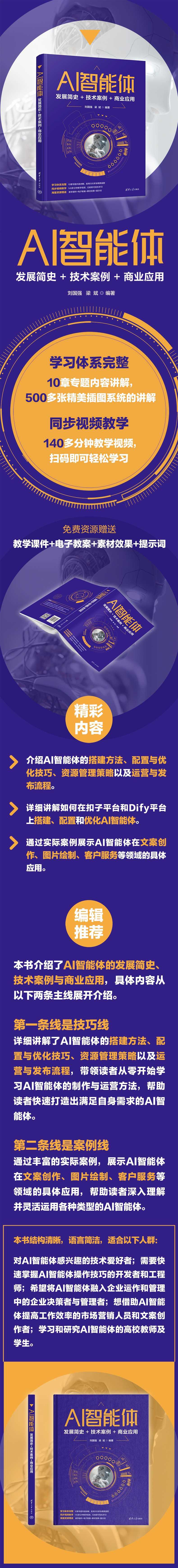 ?《AI智能体:发展简史十技术案例十商业应用》通过10章专题内容,500多张精美插图,140多分钟教学视频,系统地讲解了AI智能体的搭建方法、配置与优化技巧、资源管理策略以及运营与发布流程。其中,详细讲解了如何在扣子平台和Dify平台上搭建、配置和优化AI智能体。通过实际案例展示AI智能体在文案创作、图片绘制、客户服务等领域的具体应用。