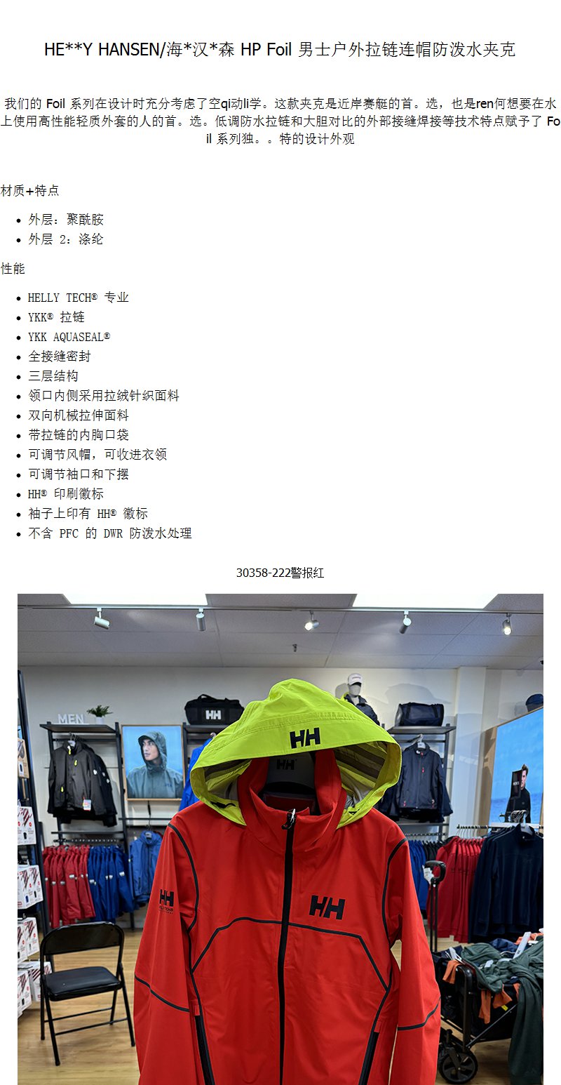 HE**Y HANSEN/海*汉*森 HP Foil 男士户外拉链连帽防泼水夹克