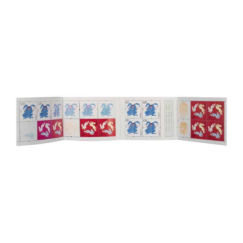 此链接上架的为小本票,内含12枚兔年邮票,展示了生肖邮票叠色印刷、以四方连组成邮票内页、呈现左右折页形式,发行量为480万本。