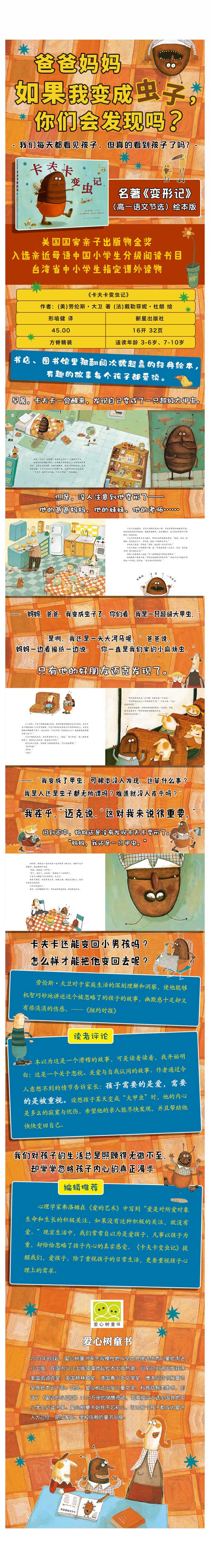 卡夫卡为什么会变成一只甲虫呢??他的爸爸妈妈为什么一直没发现他变虫子了呢?·如果你变成虫子,你的爸爸妈妈会发现吗?卡夫卡《变形记》绘本版,获得美国国家亲子出版物jin奖台湾省中小学课外读物选书入选亲近母语中国小学生分级阅读书目