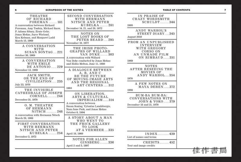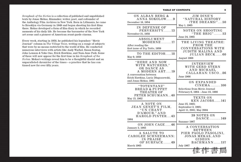 安迪·沃霍尔、苏珊·桑塔格、约翰·列侬与小野洋子——乔纳斯·梅卡斯与众多纽约艺术家交往甚密。这位立陶宛出生的电影人于1949年经德国抵达布鲁克林,并在此开始拍摄首批实验电影。梅卡斯开创了一种电影日记形式,用以记录日常观察。他成为纽约艺术界的晴雨表,也是美国先锋电影的先驱。自1958年起,他每周在《村声》杂志发表传奇专栏"电影日志",其写作范畴远不止于电影世界。他曾与众多艺术家进行对话访谈,部分内容将首次呈现于新作《六十年代剪贴簿》。该书收录已发表与未刊文稿,展现梅卡斯作为思想者的日记作者身份,以及他半个多世纪以来无可替代的时代记录者姿态。
