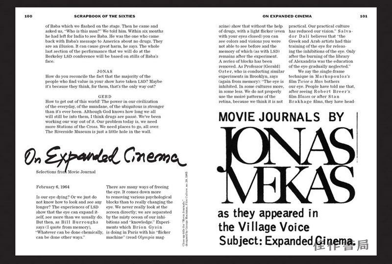 Andy Warhol, Susan Sontag, John Lennon & Yoko Ono — Jonas Mekas was well acquainted with a great many New York artists. Born in Lithuania, he came to Brooklyn via Germany in 1949 and began shooting his first experimental films there. Mekas developed a form of film diary in which he recorded his daily observations. He became the barometer of the New York art scene and a pioneer of American avant-garde cinema. Every week, starting in 1958 he published his legendary ?Movie Journal? column in the Village Voice, writing on a range of subjects that were by no means restricted to the world of film. He conducted numerous interviews with artists, some of which will now appear for the first time in his Scrapbook of a Sixties. The book contains published and unpublished texts that reveal Mekas as a thoughtful diarist and an unparalleled chronicler of the day — a phenomenon that has continued now for over fifty years.