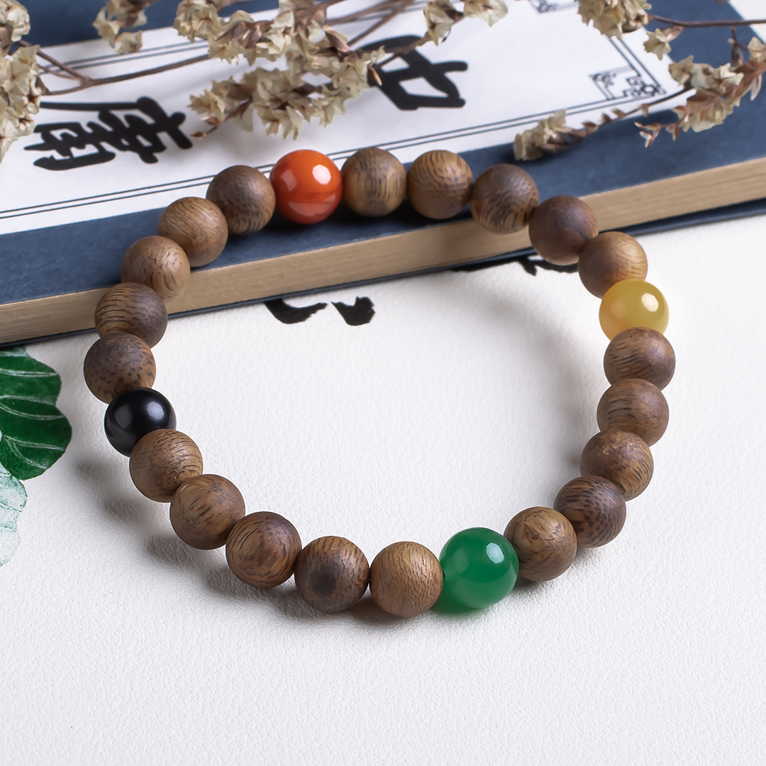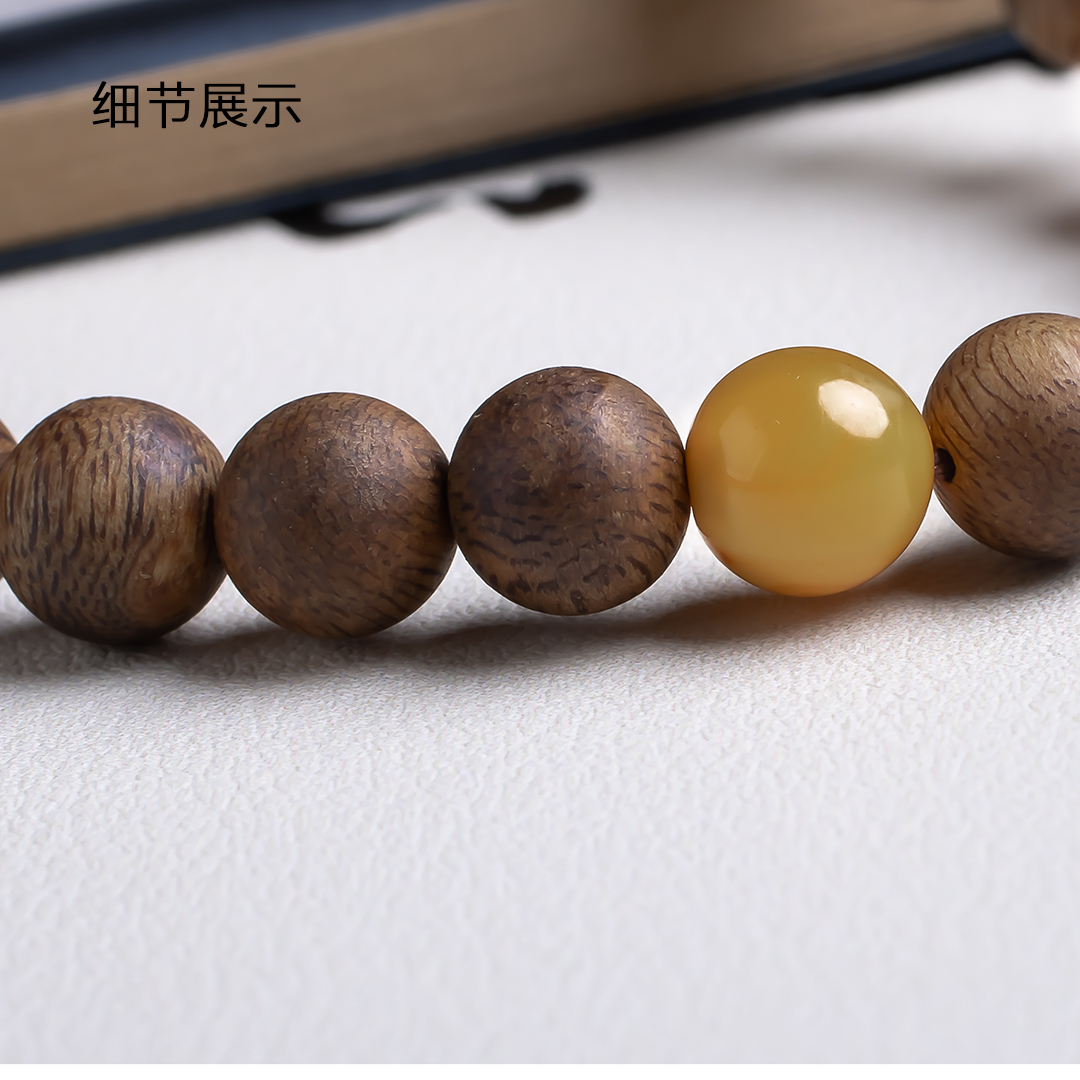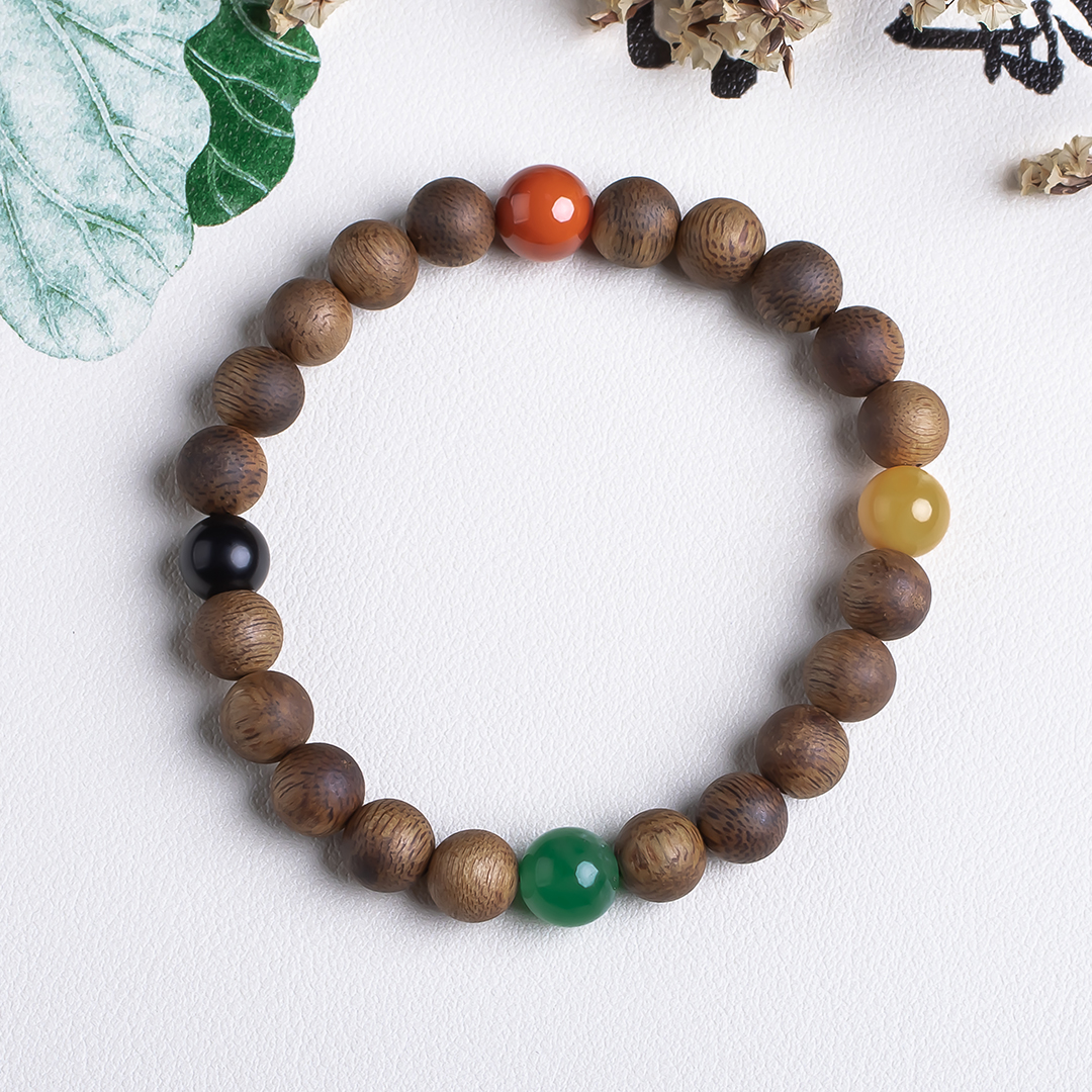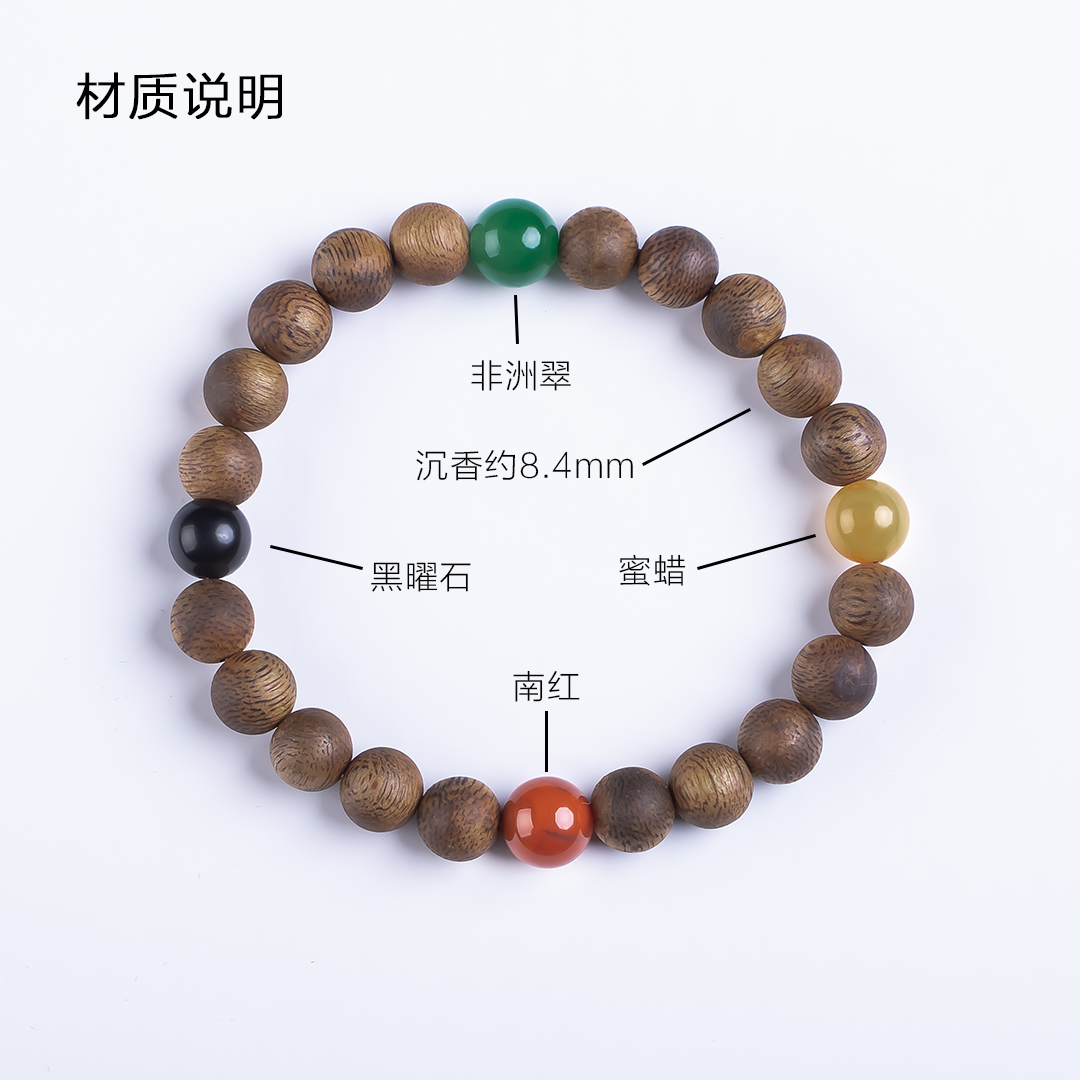 xy0535沉香+多宝四季平安手串,天然沉香约8.4mm,原色原味,香味自然清甜,蜜蜡南红非洲翠黑曜石四宝居四个方位,设计款式意为四季平安,佩戴吉祥、好运。