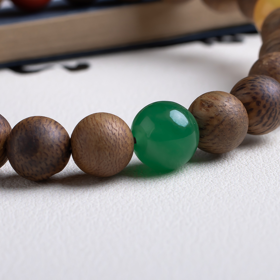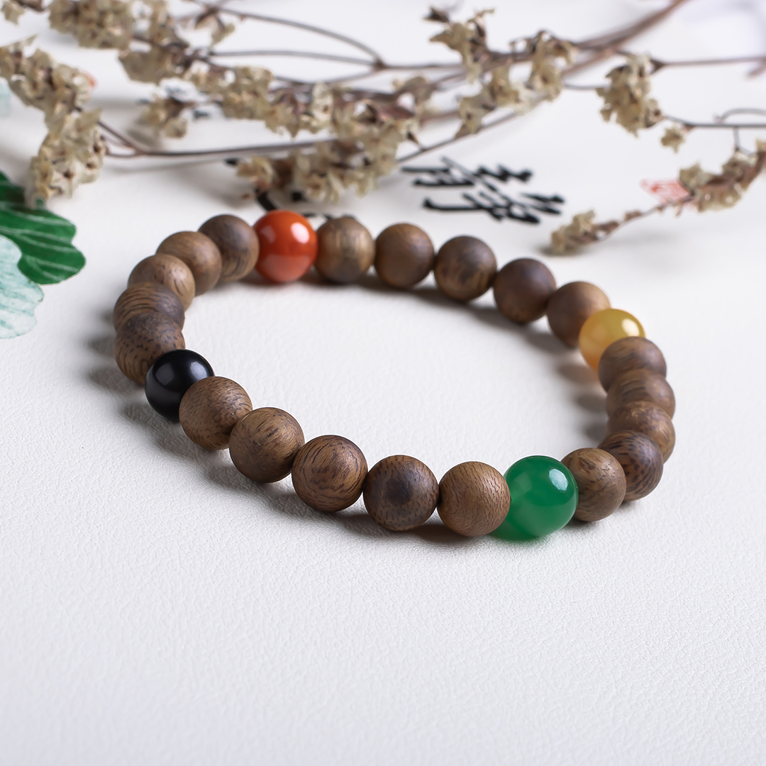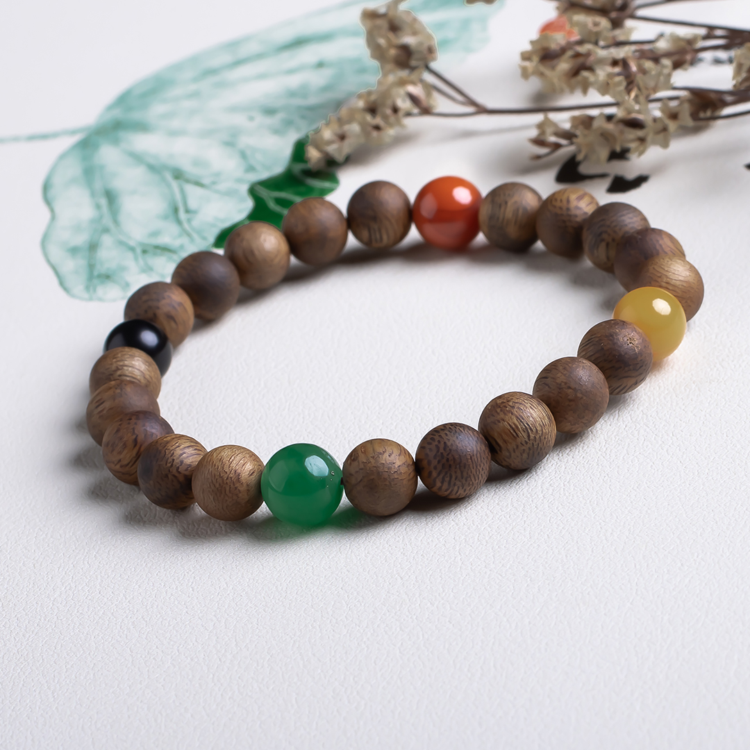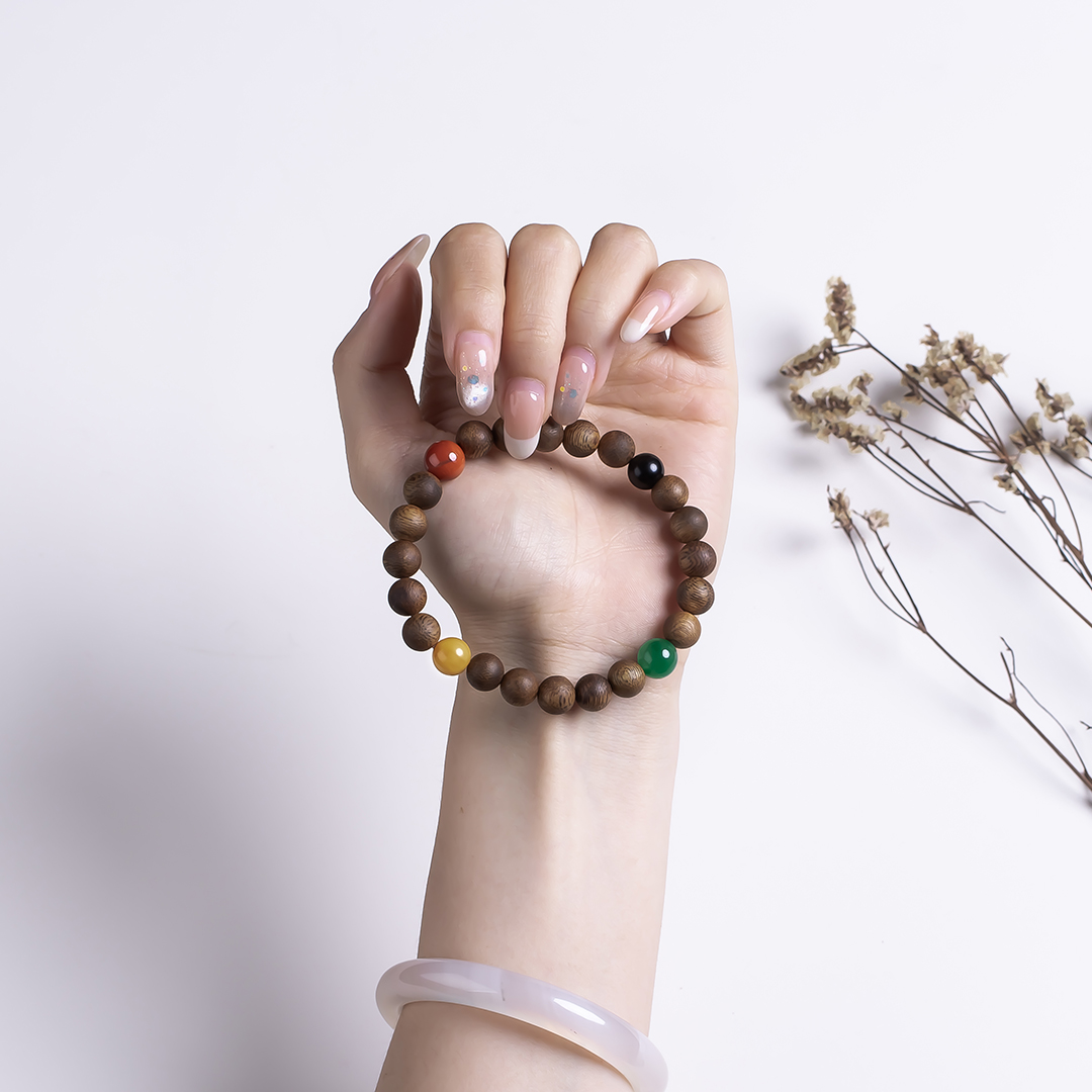xy0535沉香+多宝四季平安手串,天然沉香约8.4mm,原色原味,香味自然清甜,蜜蜡南红非洲翠黑曜石四宝居四个方位,设计款式意为四季平安,佩戴吉祥、好运。