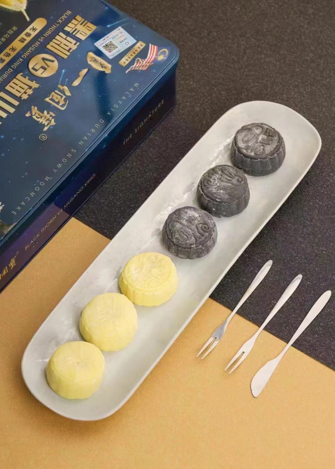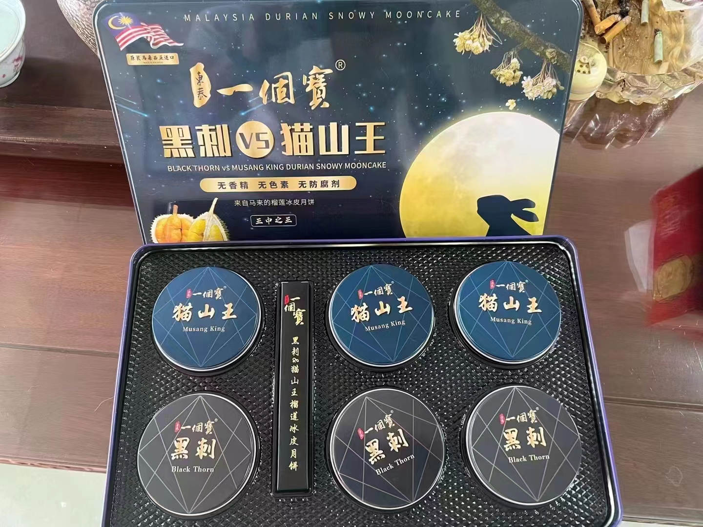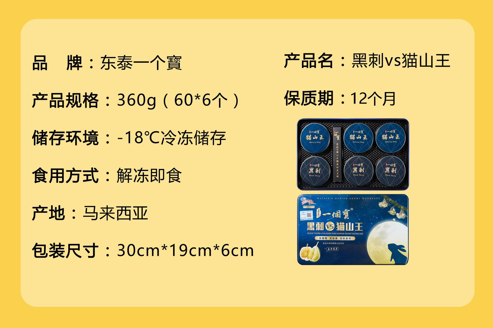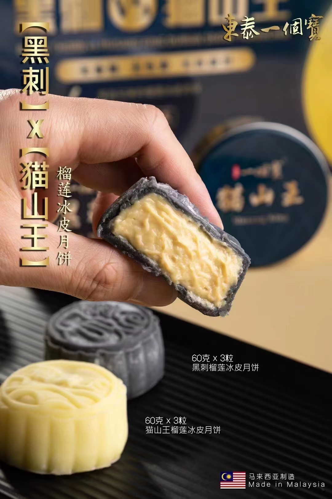 东泰一个宝猫山王*黑刺双拼 榴莲冰皮月饼 礼盒装一盒6个 黑刺60g*3粒,猫山王60g*3粒 【请放入冰箱-18°冷冻保存】
