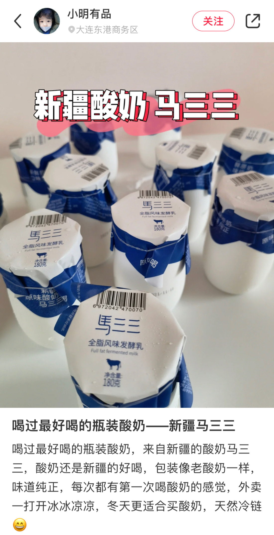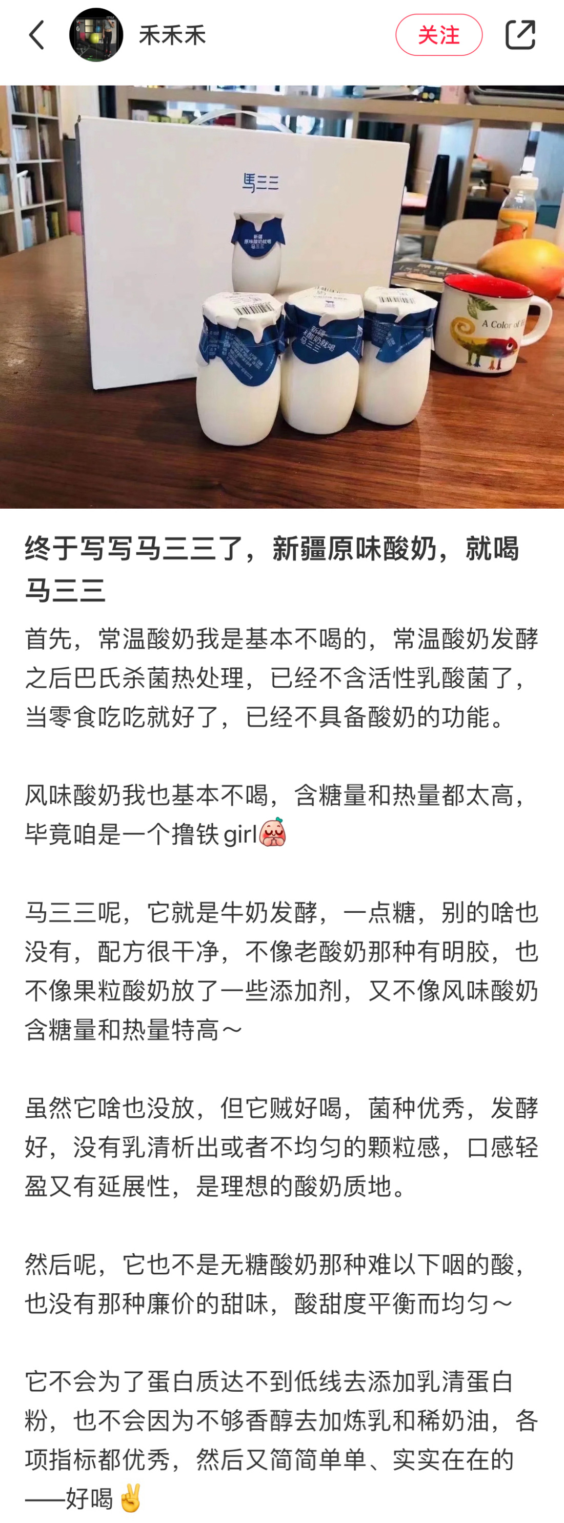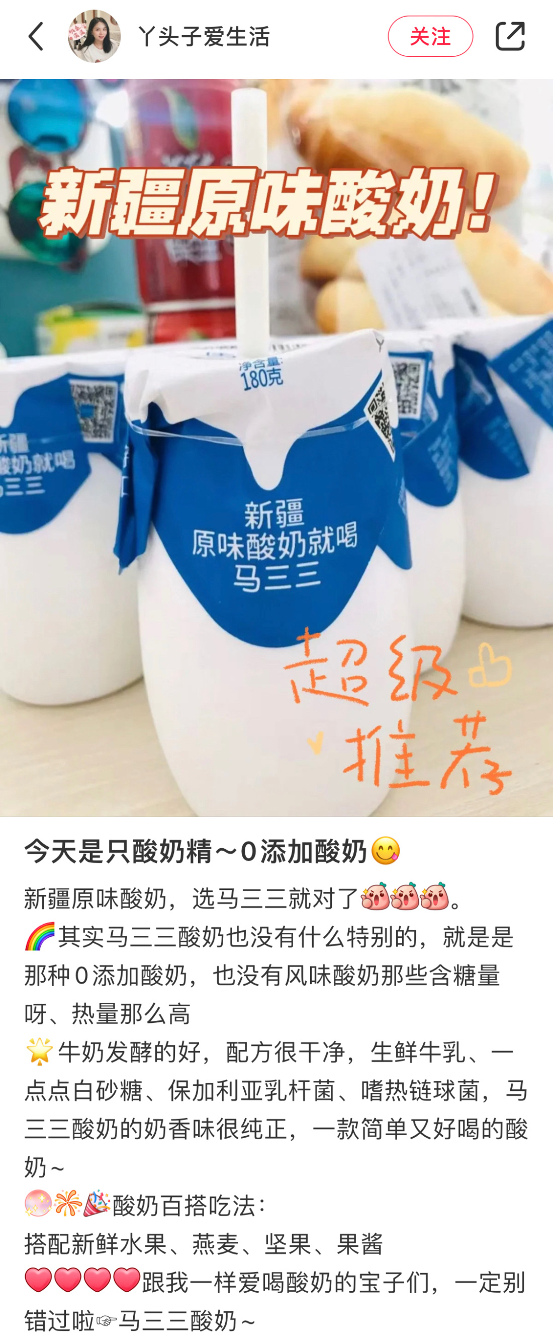 我也是喝过超多品牌的酸奶了,马三三坠突出的特点是:一切都刚刚好,没有添加剂带来的虚假浓稠感,不会过于甜腻,只有香浓天然的奶香,是纯纯的酸奶味道,是来自新疆净土的好酸奶啊!