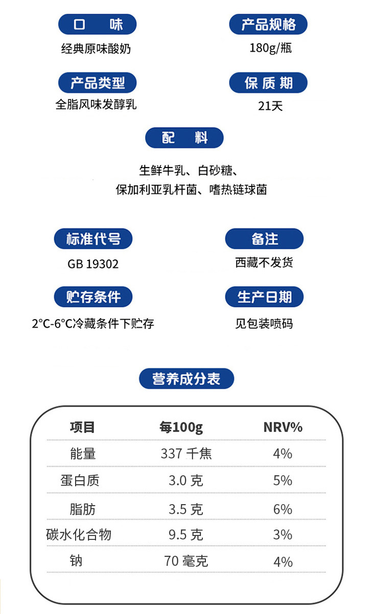马三三酸奶一组12瓶,每瓶180g,是一餐刚好的搭配量。如果简单地直饮还满足不了大家,我也很推荐自己进行一些简单的加工,加燕麦片、做酸奶水果捞……味道都会很赞!另外我还要特别说一下,因为马三三酸奶没有添加剂,又是从遥远的新疆发出来的,所以路上可能会有乳清析出,造成酸奶表面有一层水,那不是变质哦!