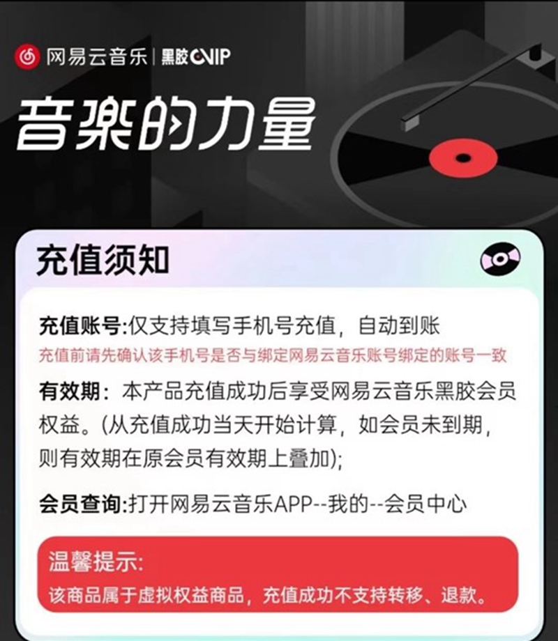 购买须知: ★ 下单前请您务必仔细阅读产品中各项说明,然后在下单订购 ★ 下单购买后,则视为您已仔细阅读本产品中的各项说明,并认同此声明以及产品规则,否则责任自负,不在售后服务之内 产品说明: 充值账号:请填写网易云音乐登录绑定的手机号,不支持在备注填写充值号码,仅支持下单默认的充值手机号,请不要填错 不清楚自己绑定的手机号是什么,请务必查询确认好! 充值时间:本产品为慢充,下单后24小时内到账,请勿催单 到账核实:下单后24小时未到账,请先登录自己的账号查看,退出重新登录查看,如确实未到账,请及时联系客服 注意事项: 顾客下单后自动充值,发货状态并不会立刻变成已发货,已经充值成功无法退换 虚拟充值产品不适用于七日无理由退货条款,一经购买,不退不改 因个人原因造成充值错误,责任自负,不予退款 如遇市场断货问题,平台将无条件为客户进行退款 |