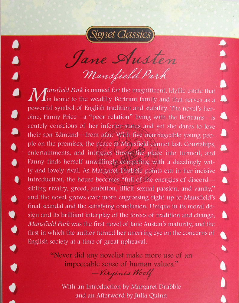 Mansfield Park《曼斯菲尔德庄园》是英国女性作家简奥斯汀(Jane Austen)于1814年出版的小说。主要讲述了以男女青年的恋爱婚姻为题材。但是,比较而言,本书情节更为复杂,突发性事件更加集中,社会讽刺意味也更加浓重。此作品一经发表就深受广大读者青睐,后来更多次被改编为电视剧、电影、舞台剧等等,并且被翻译成多种语言,广为流传。