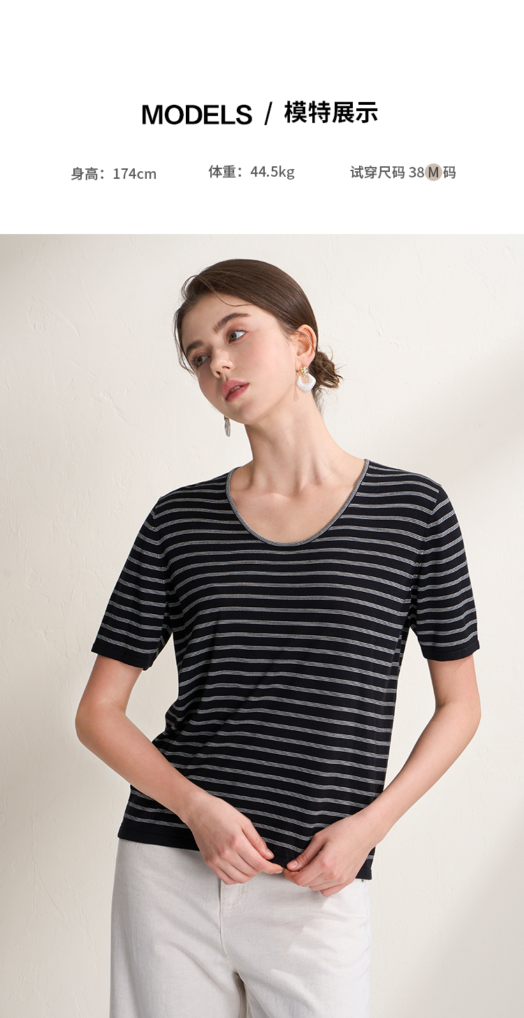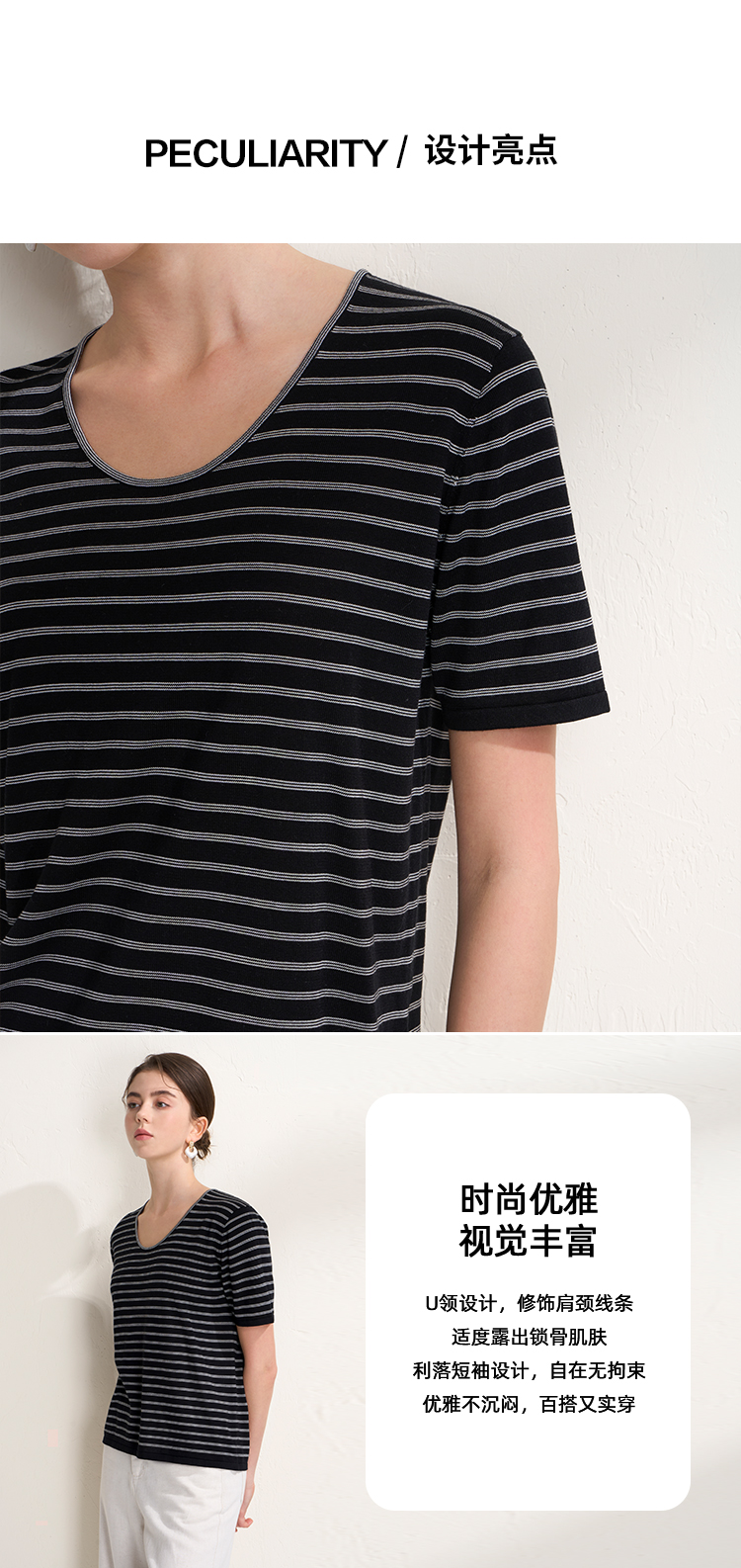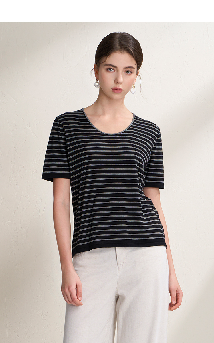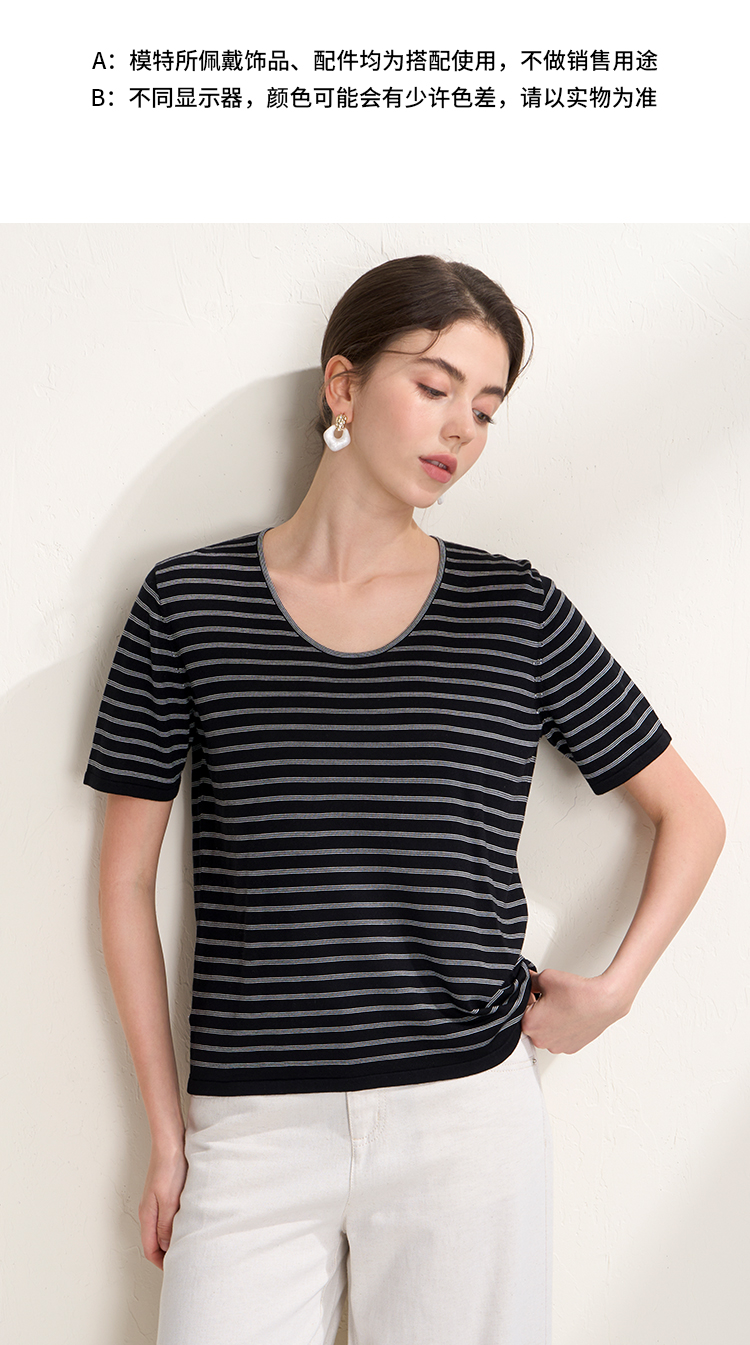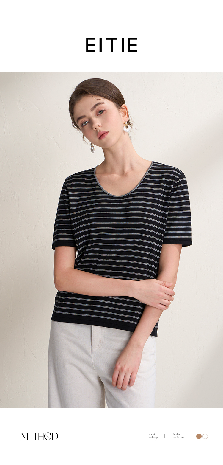 EITIE爱特爱条纹U领优雅百搭休闲宽松套头短袖针织衫2026夏季新款B2601216