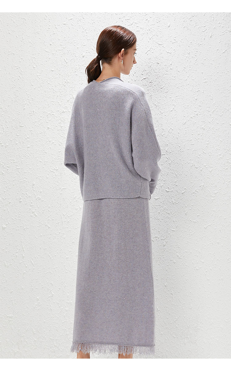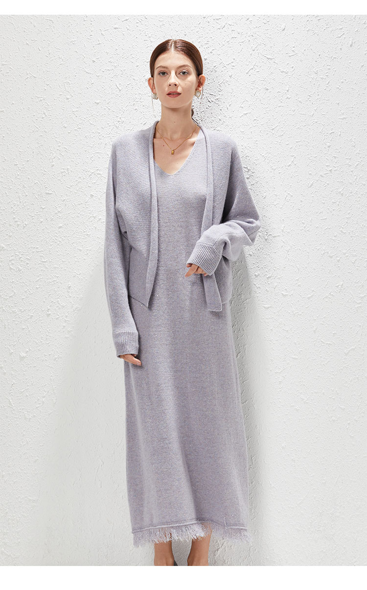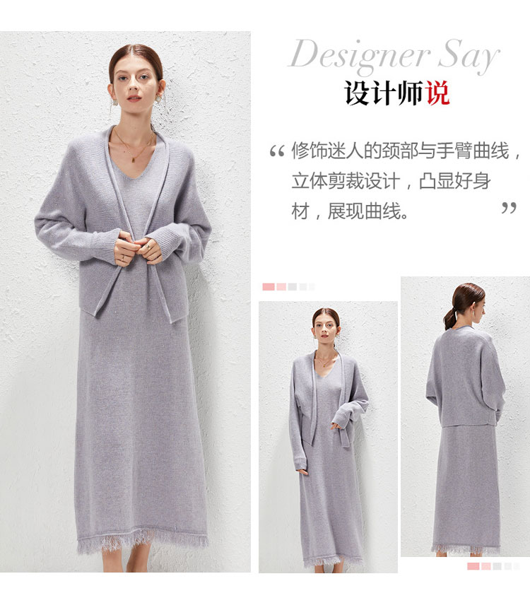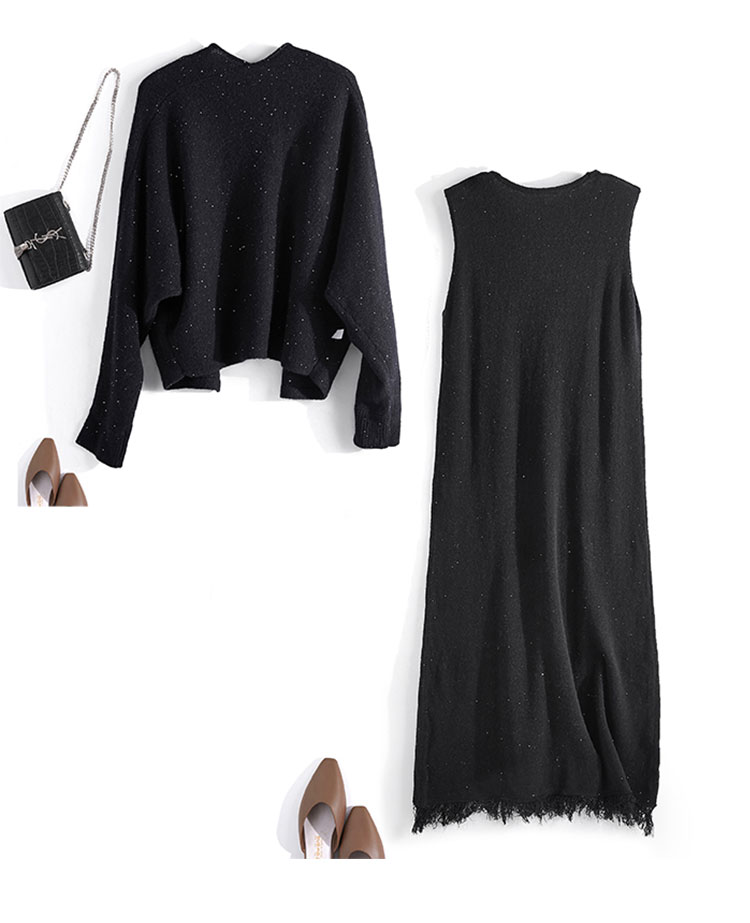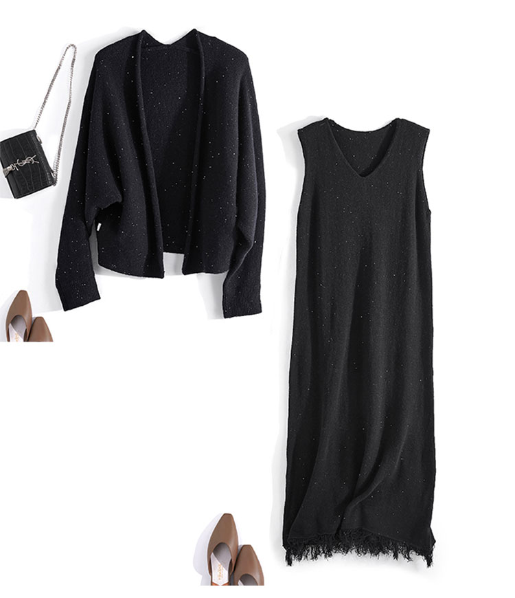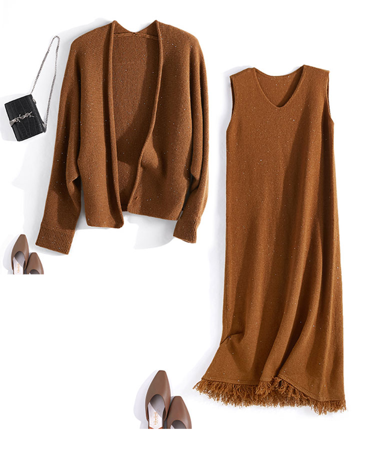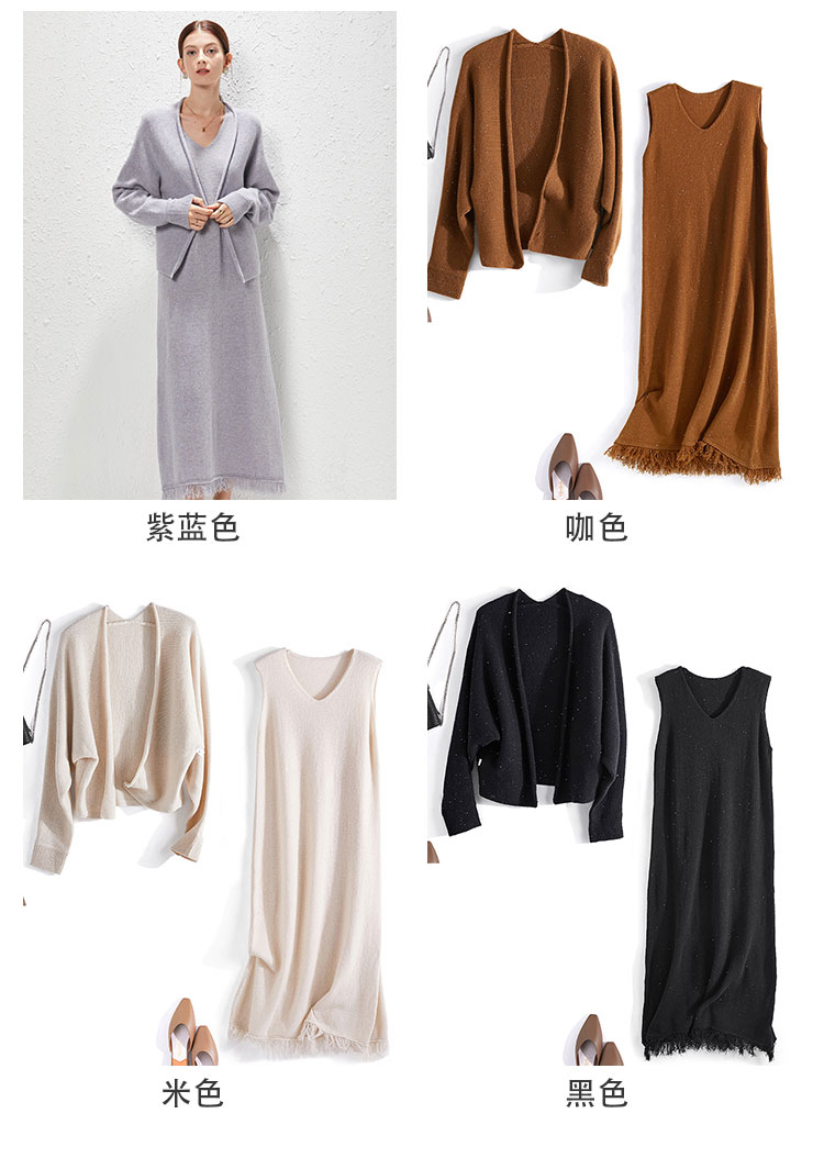 丁摩 全羊毛亮片卷边小开衫上衣外套+V领流苏针织无袖连衣裙两件套套装WX159-6109/6108