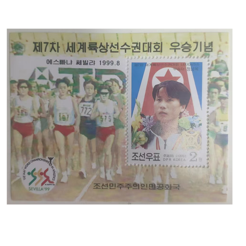 郑成玉彩画版纪念邮票—2019西班牙田径世锦赛女子马拉松冠军!朝鲜第一个世锦赛冠军选手!