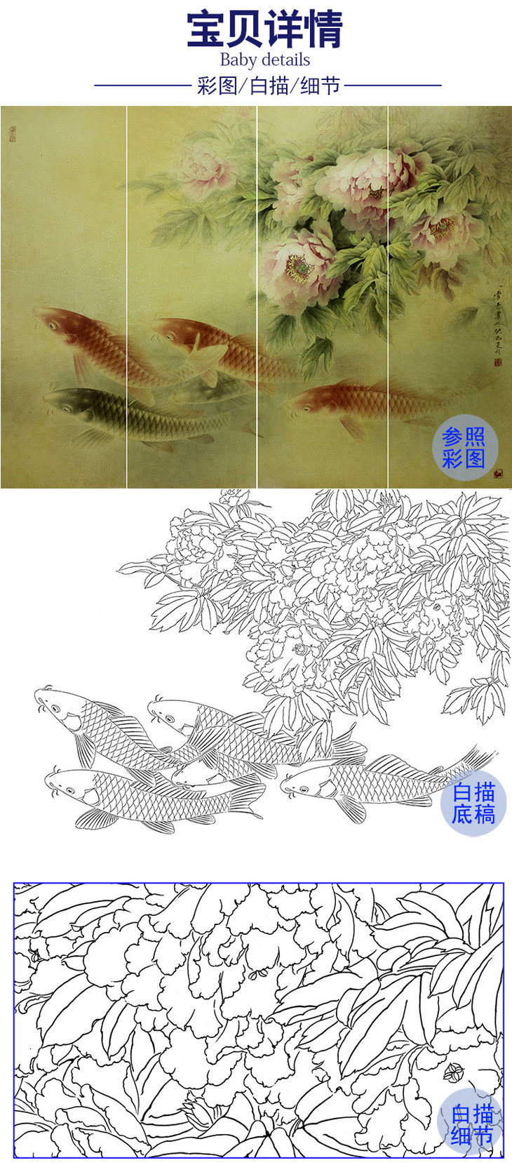 龚雪青工笔花鸟白描底稿-牡丹鱼四条屏《富贵有余》通屏-多种白描尺寸可选-XQ68