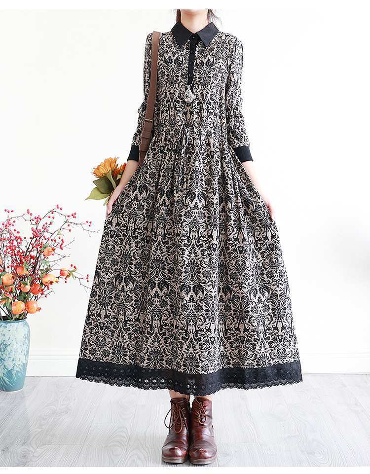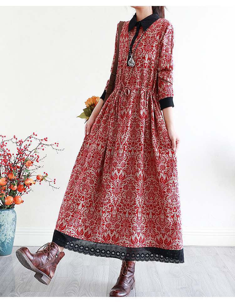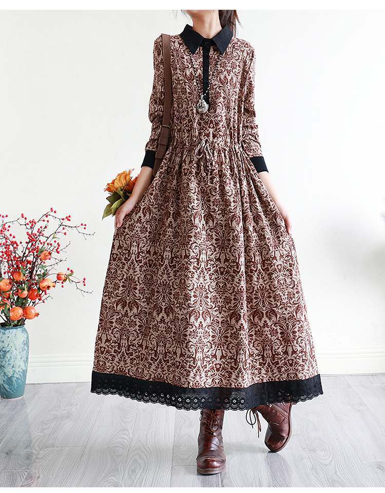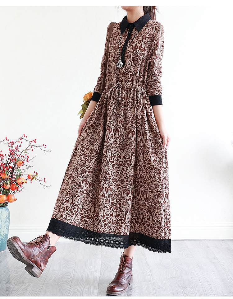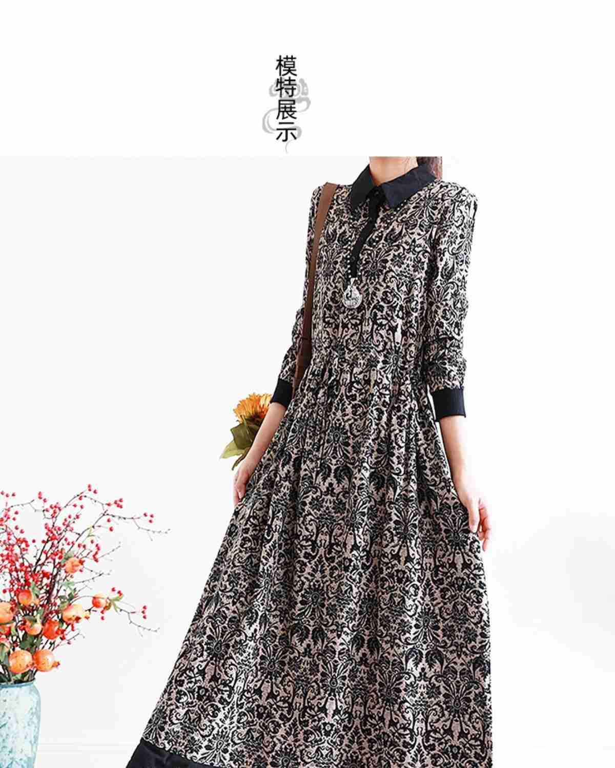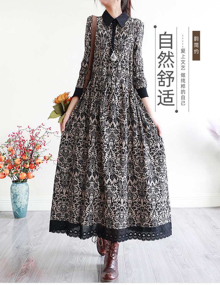 YJM-P993008复古文艺宽松翻领长袖加厚印花连衣裙
