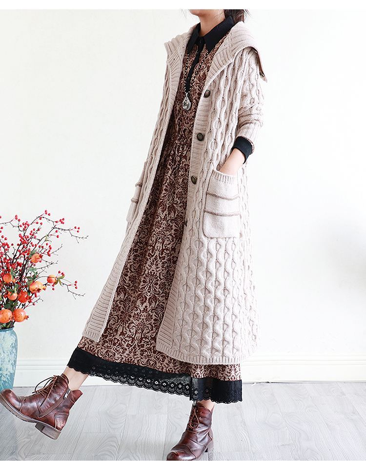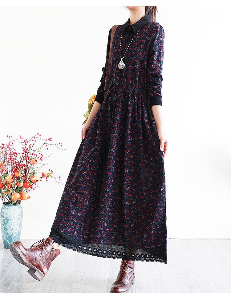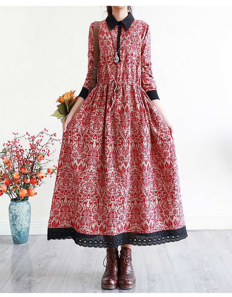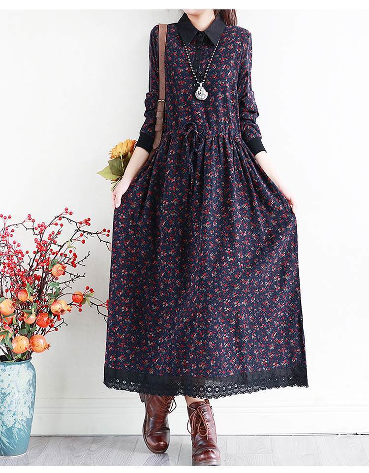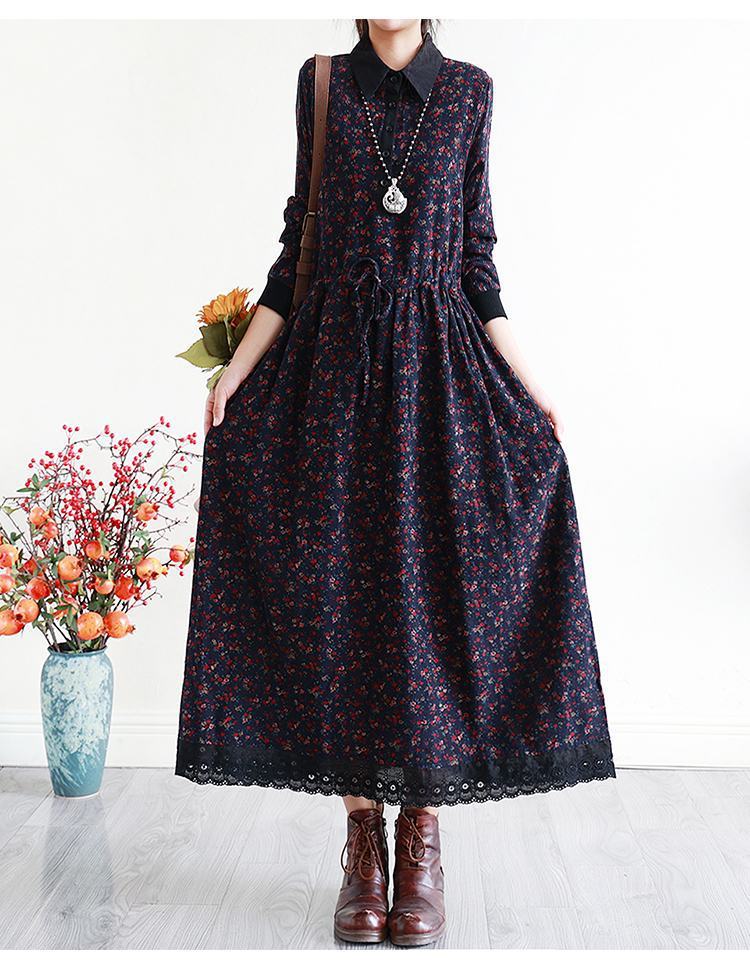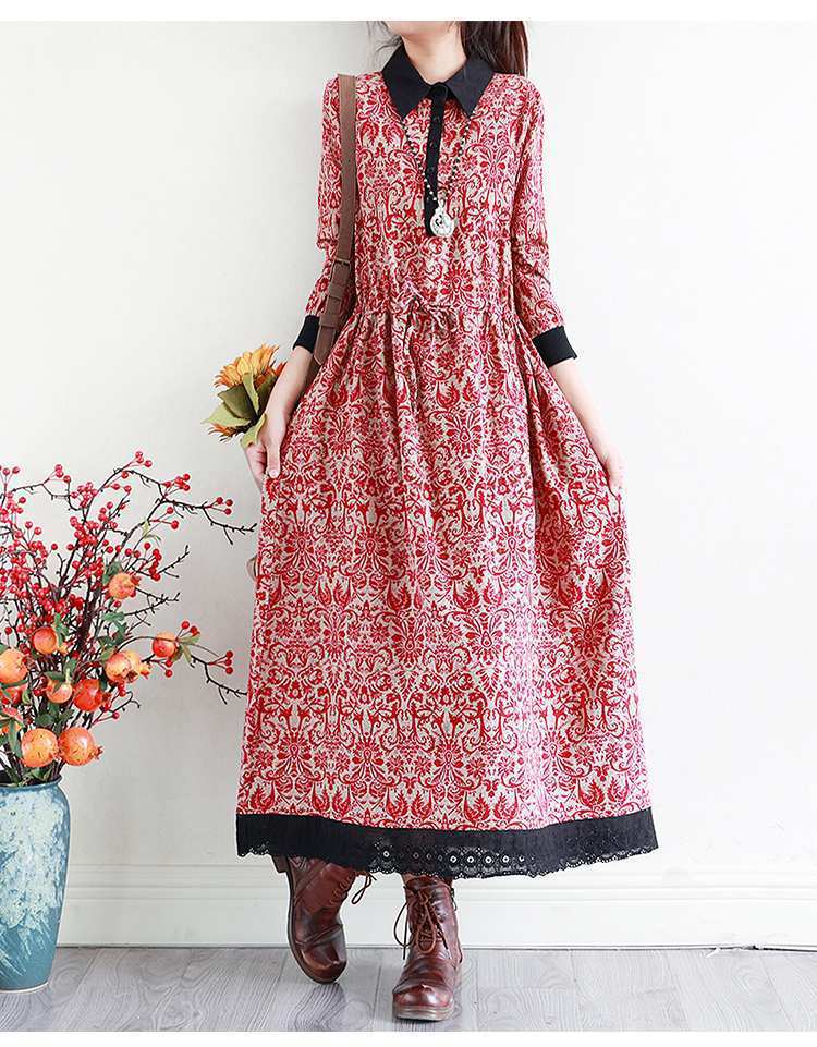YJM-P993008复古文艺宽松翻领长袖加厚印花连衣裙