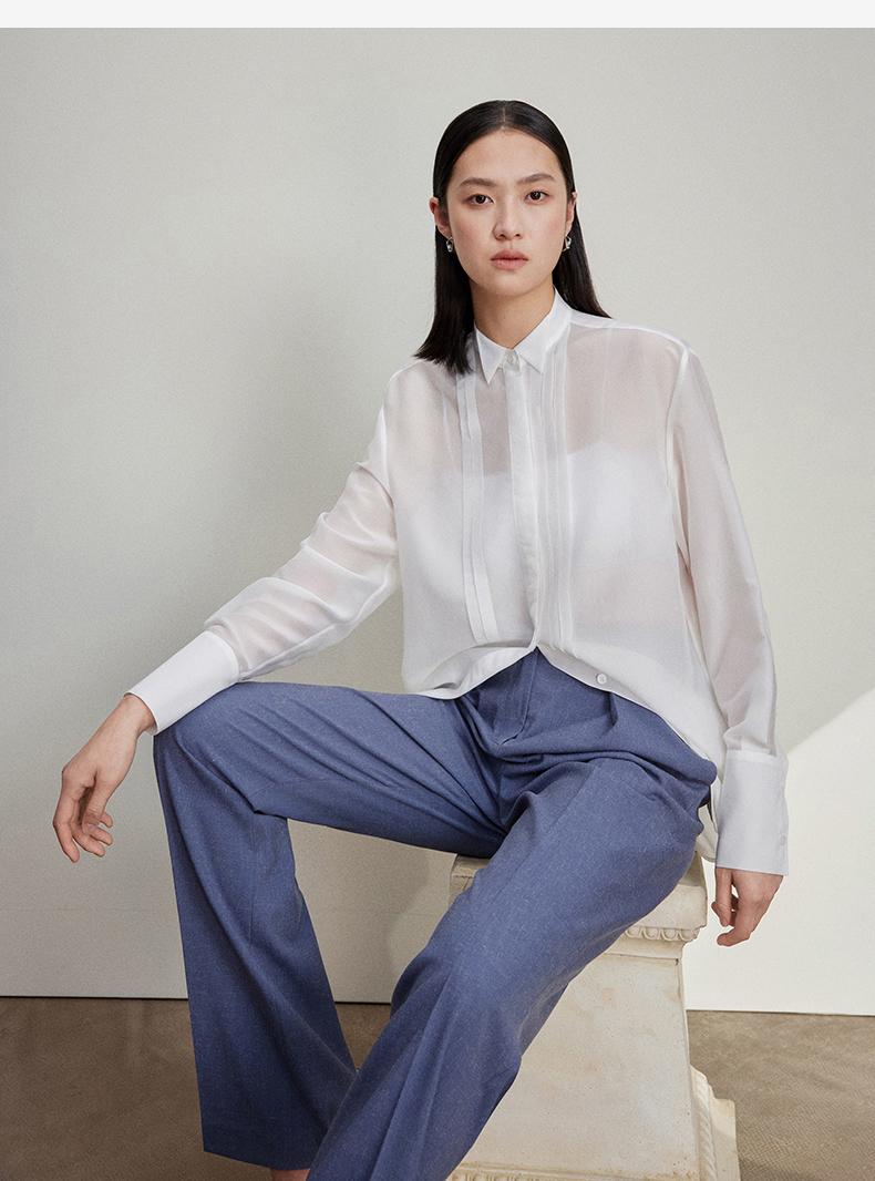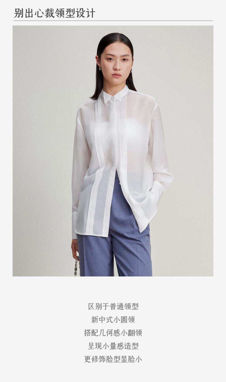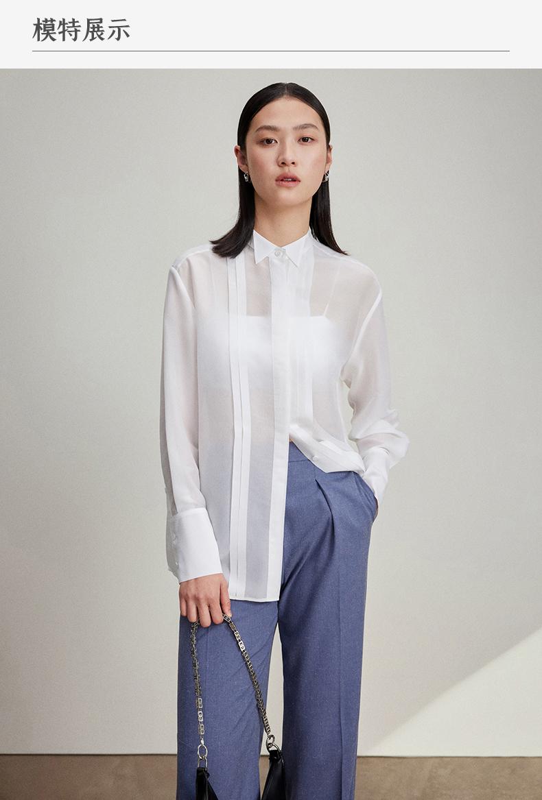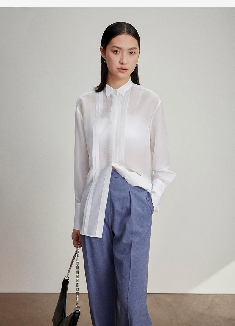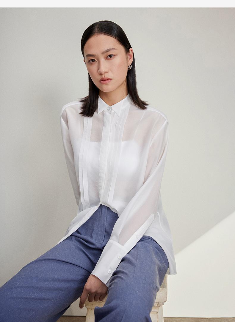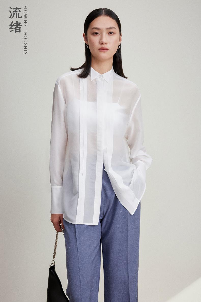 西嘉C+IMPRESS/西嘉醋酸桑蚕丝复古白色衬衫长袖翻领塔克褶半透视上衣CS2401083