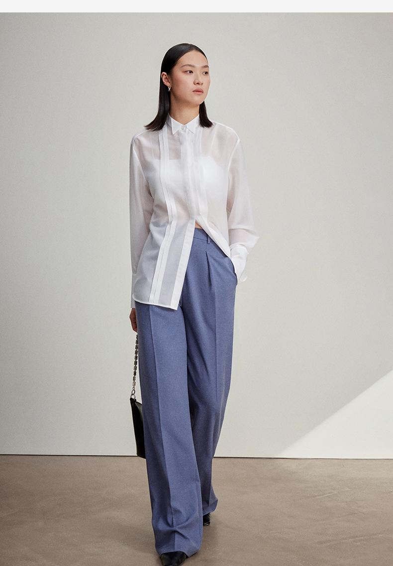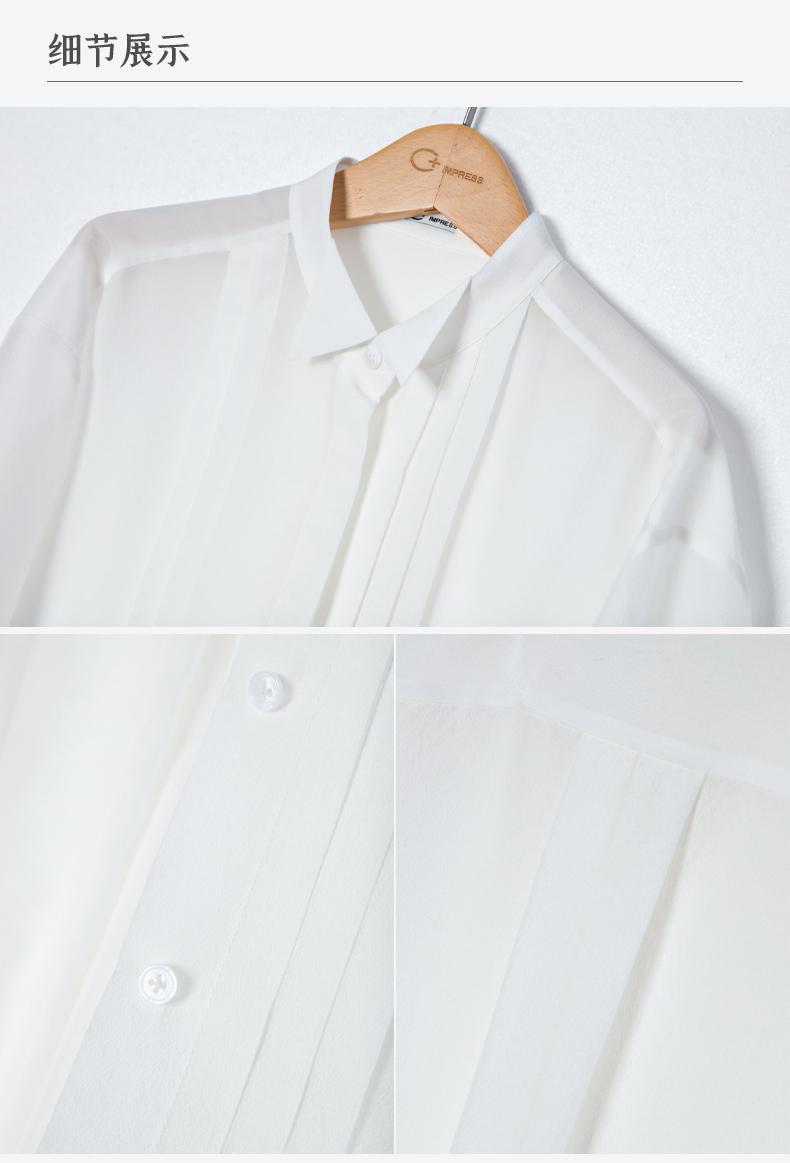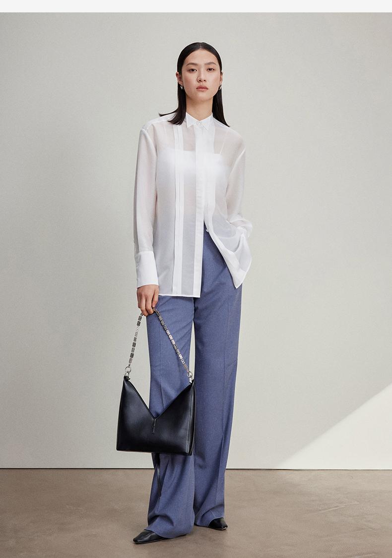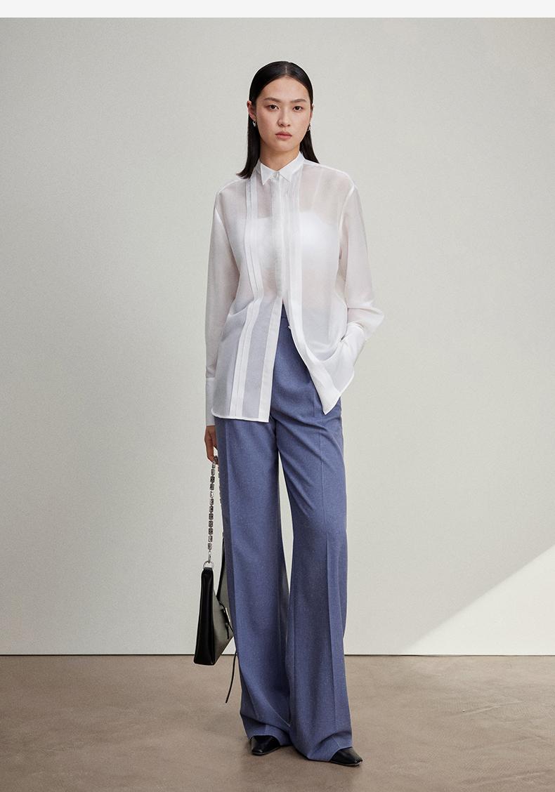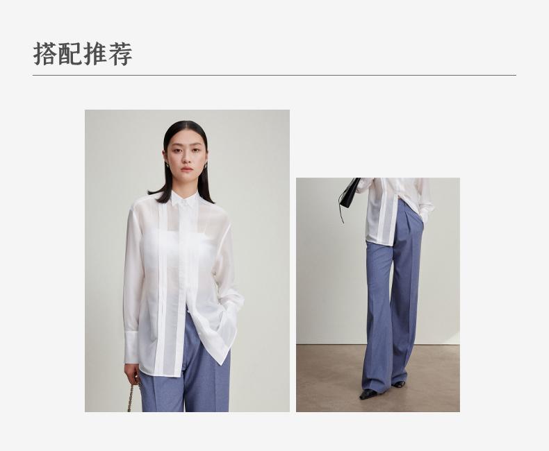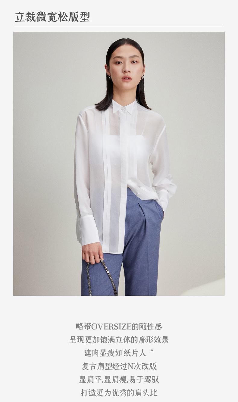 西嘉C+IMPRESS/西嘉醋酸桑蚕丝复古白色衬衫长袖翻领塔克褶半透视上衣CS2401083