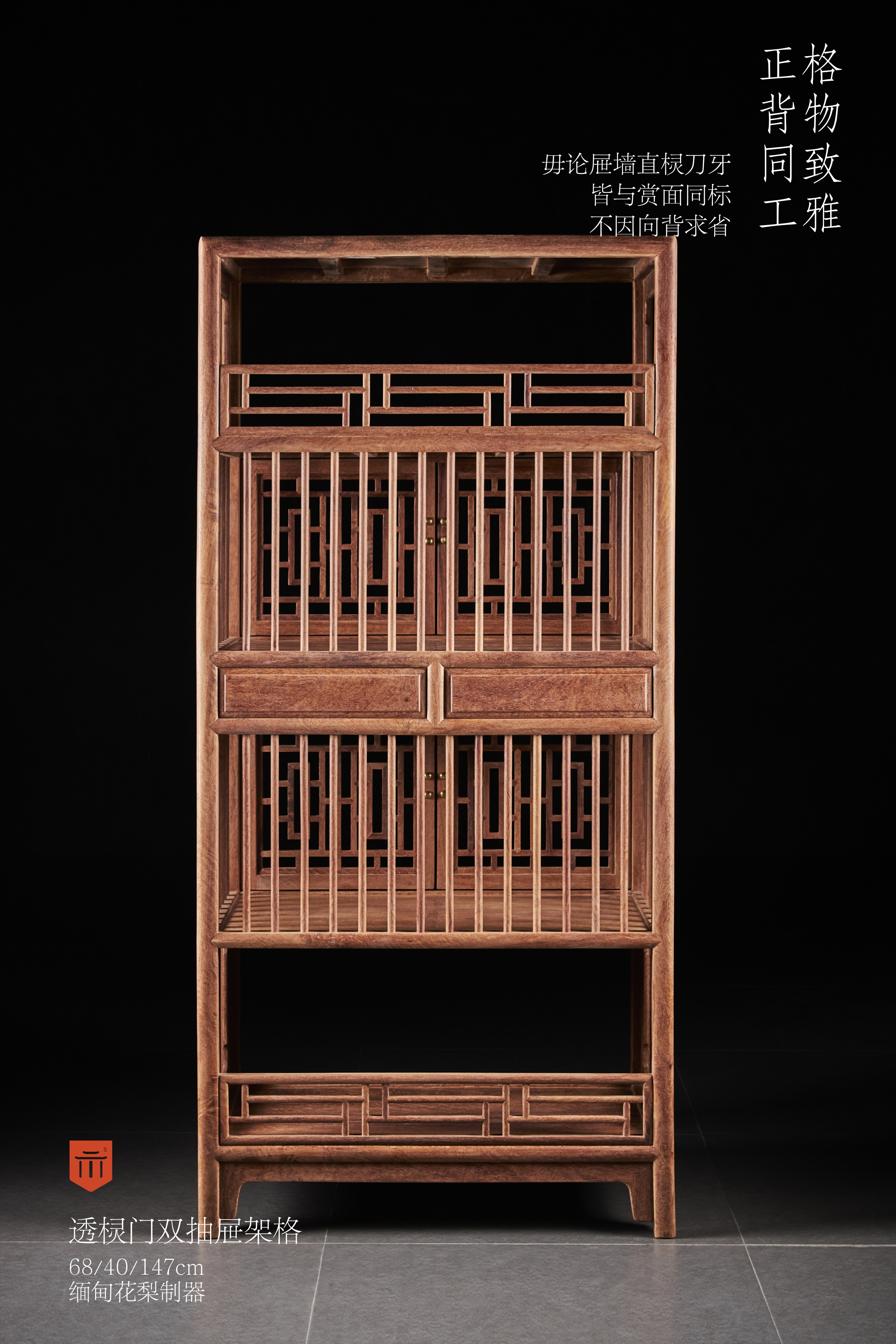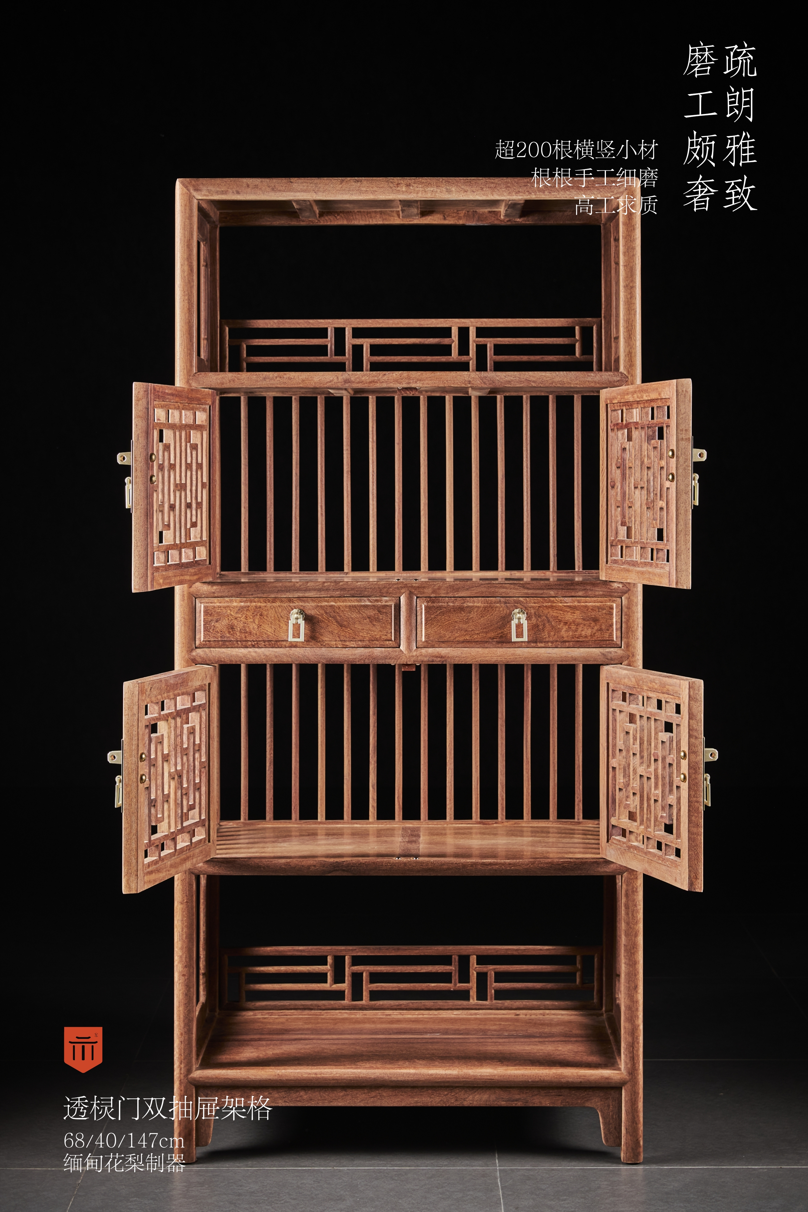 架格,超200根横竖小材攒接而成,根根手工细磨,高工求质,磨工颇奢,圆材素混面,共四层,上下两层设计采用品字栏杆,用横竖材攒接而成,中部采用透棂造法,安有近似“步步紧”灯笼框图案的透棂门,设双抽屉,架格侧面及背面为直棂式,造法相同,架格四足安有素刀牙牙条,视觉上疏朗雅致,更显清雅。